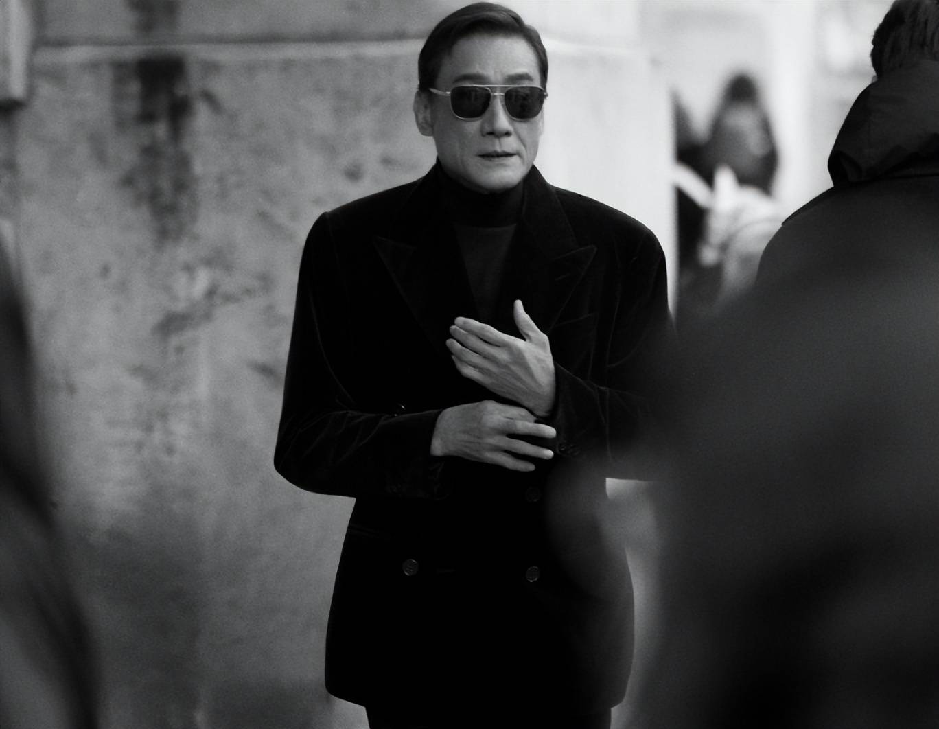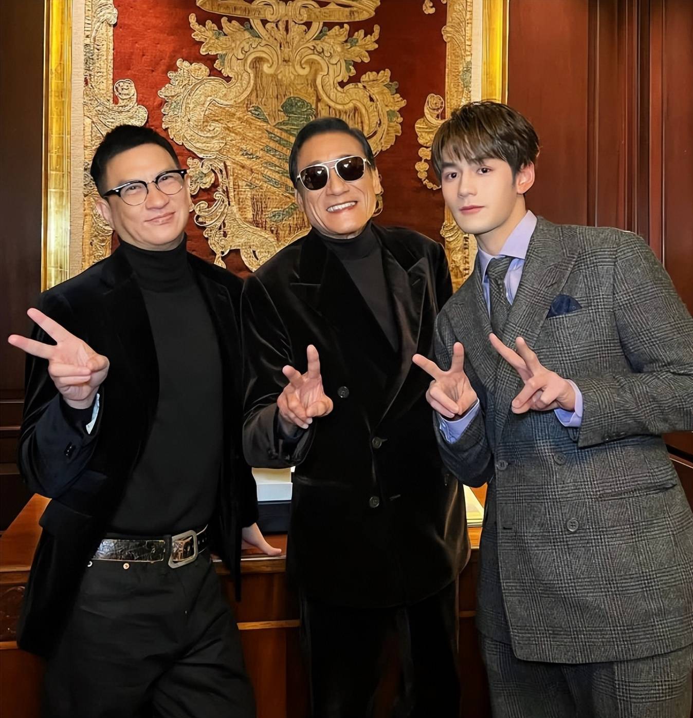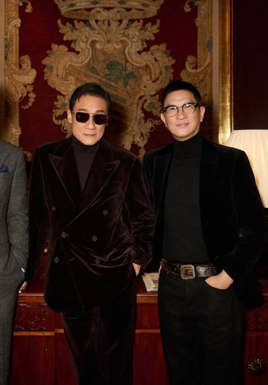 而梁家辉则选择了一套深棕色双排扣丝绒西装,强调自身的贵气,墨镜一戴更是彰显出大佬的气场。