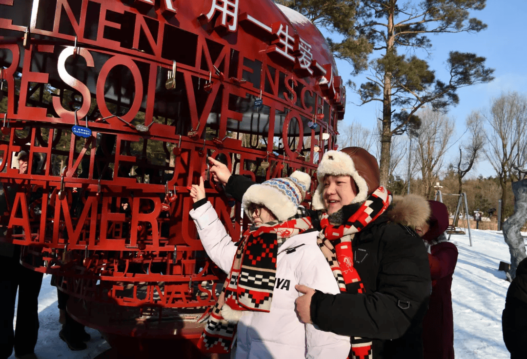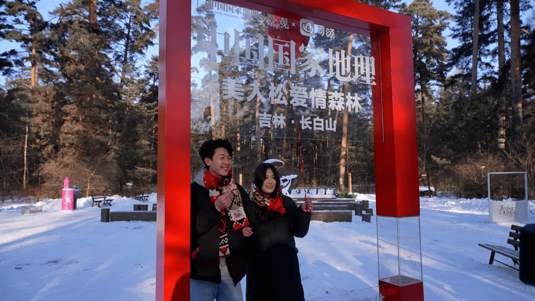 走进美人松爱情森林, 沿全长1314米的情侣踏雪线路漫步, 途经“恋语松铃”“松见卿心”“松涛鹊桥”等 特色打卡点, 在爱情地标前拍照留念, 一场从起点就开始的浪漫仪式。