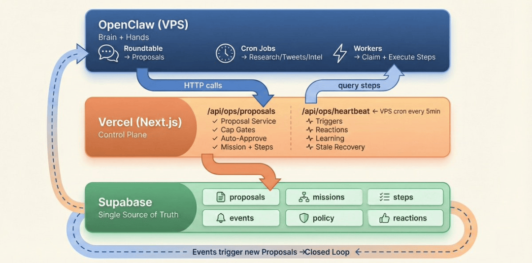 修复:砍掉一个。VPS是唯一执行者。Vercel只运行轻量级的控制平面(评估触发器、处理反应队列、清理卡住的任务)。