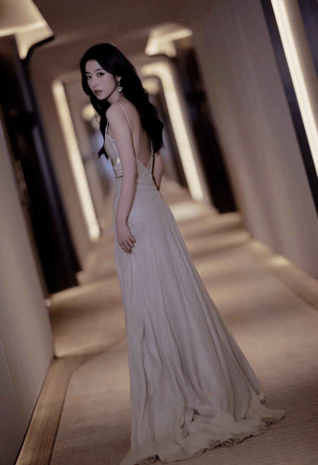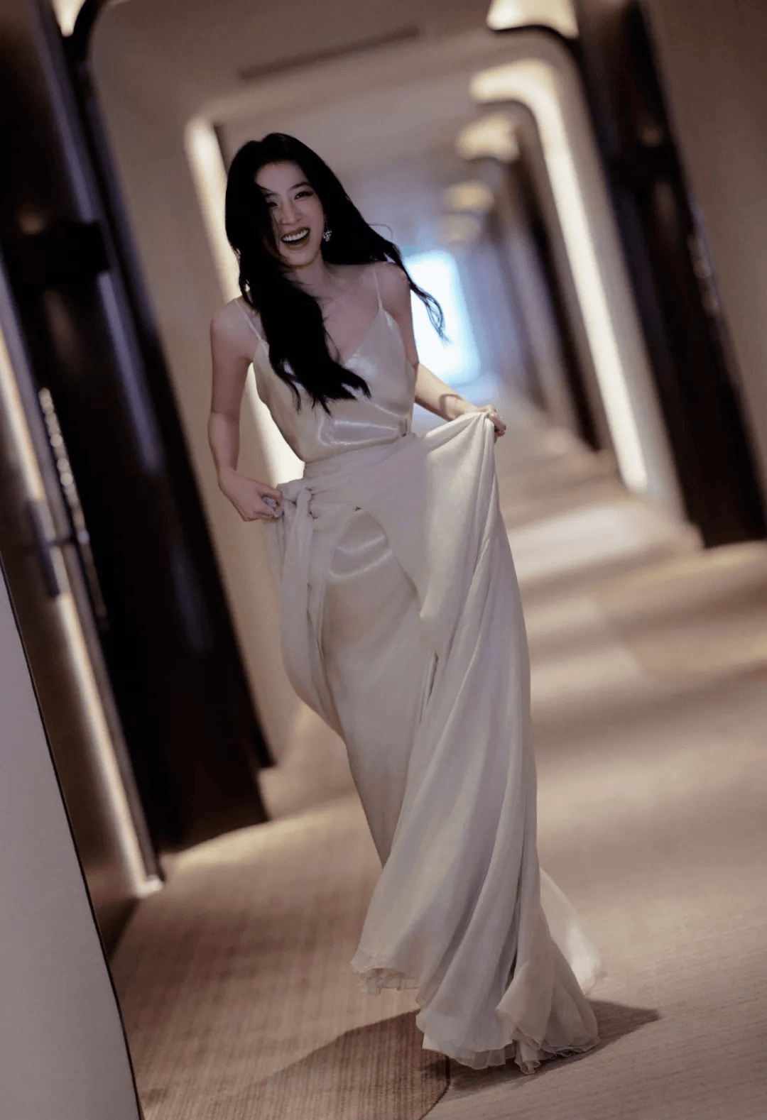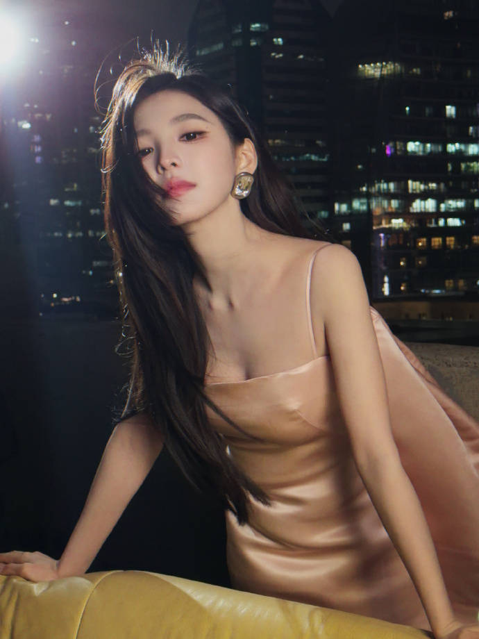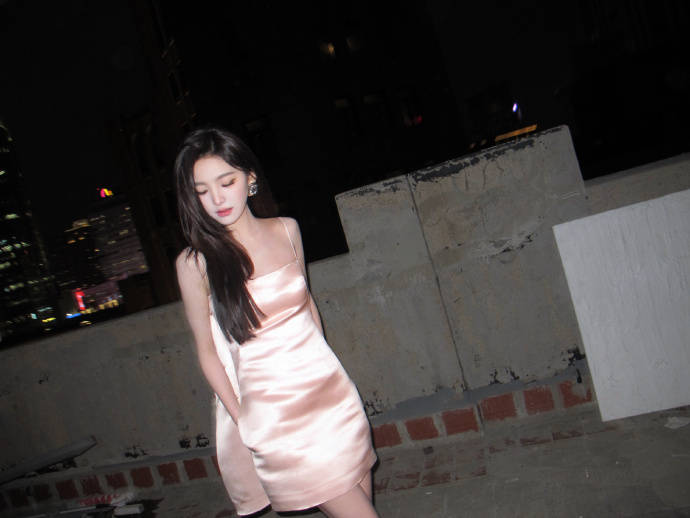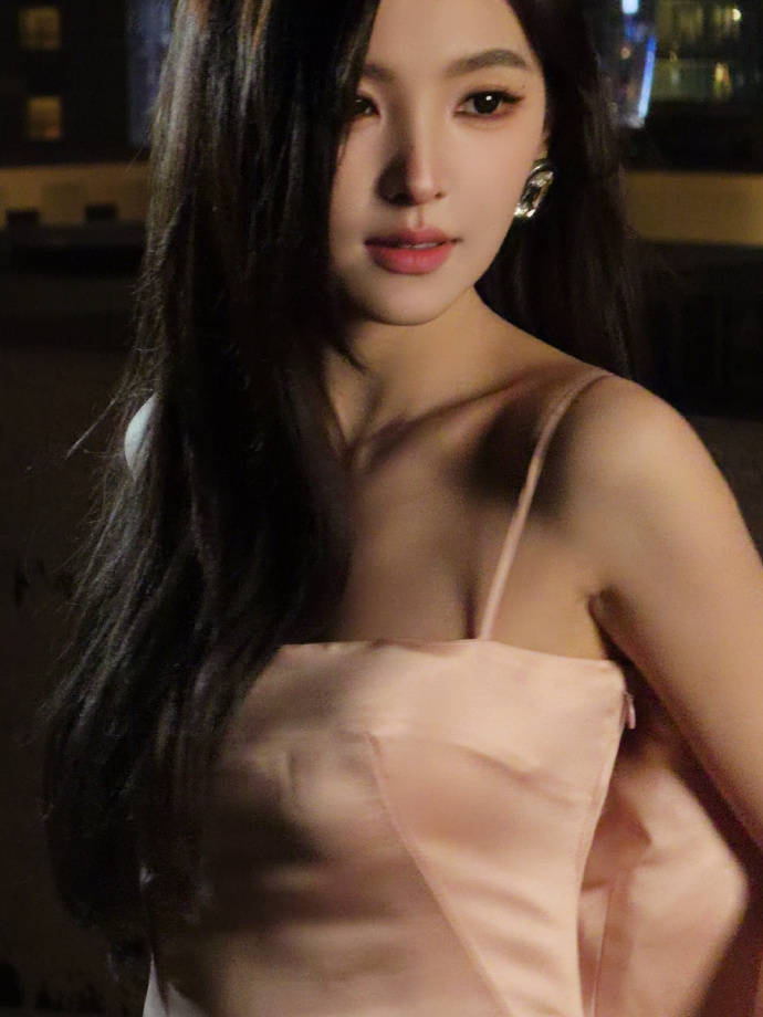 那件浅粉色吊带裙简直是为“贵气”二字量身定制。丝绸般的光泽顺着身体曲线流淌,两根细带子松松挂在肩上,锁骨像精心雕琢的艺术品。裙摆不长不短,刚好卡在大腿最纤细的位置,走动时布料轻擦肌肤的沙沙声,比任何珠宝都更懂什么叫低调的奢华。某次活动后台流出的路透里,她对着镜子整理裙摆的侧影,连工作人员都忍不住小声感叹:“这料子看着就贵。”