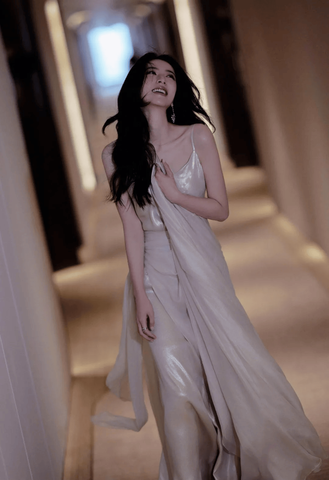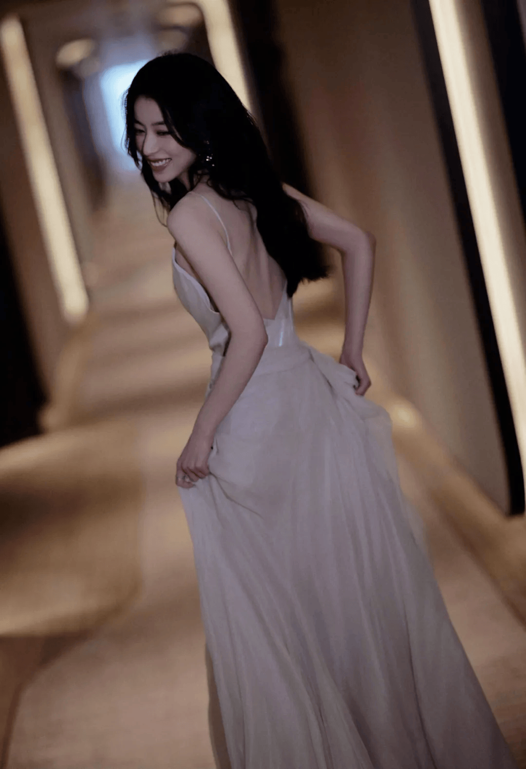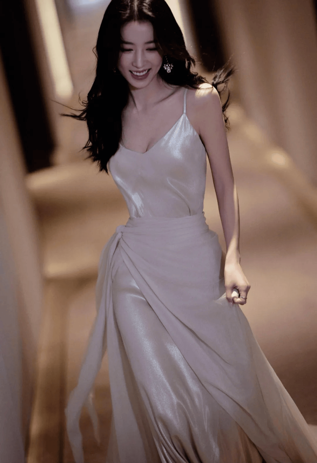 那件浅粉色吊带裙简直是为“贵气”二字量身定制。丝绸般的光泽顺着身体曲线流淌,两根细带子松松挂在肩上,锁骨像精心雕琢的艺术品。裙摆不长不短,刚好卡在大腿最纤细的位置,走动时布料轻擦肌肤的沙沙声,比任何珠宝都更懂什么叫低调的奢华。某次活动后台流出的路透里,她对着镜子整理裙摆的侧影,连工作人员都忍不住小声感叹:“这料子看着就贵。”