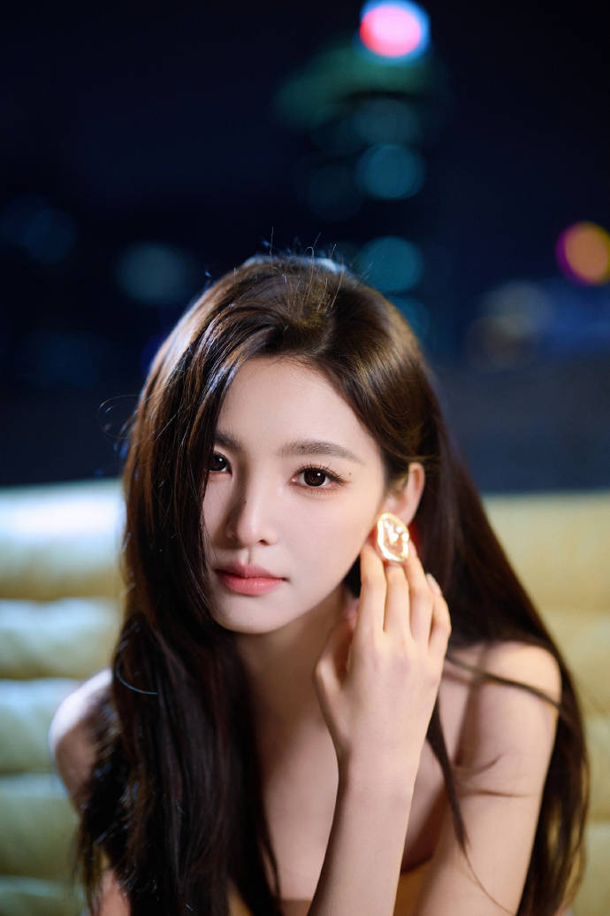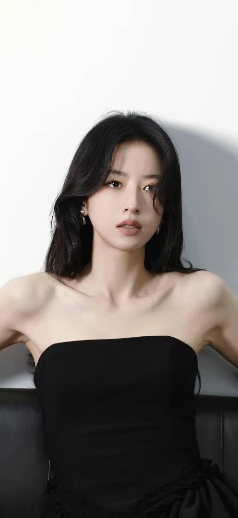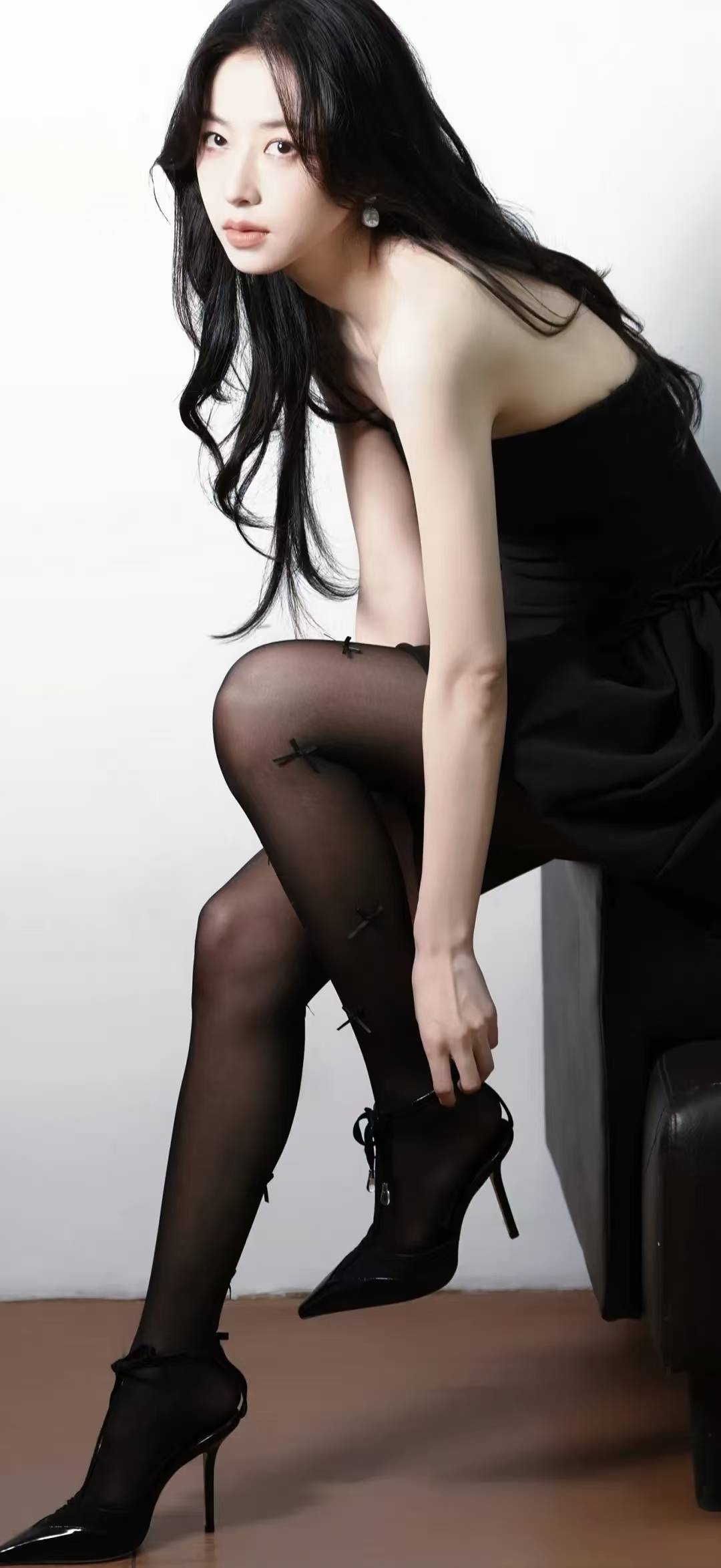 周雨彤往沙发上一坐,整个画面就有了故事感。她穿了件纯黑的抹胸小裙子,肩带细细的,把锁骨那截线条露得刚刚好。背景是极简的白墙,光线打过来在她身上切出明暗交界线,像极了美术馆里的黑白雕塑,又酷又温柔。 她的头发是自然的黑色长卷发,有几缕不听话地垂在脸颊旁边,被风一吹轻轻晃动。耳朵上戴了对银色的小耳钉,不是那种夸张的款式,就小小的一个几何形状,在光线下闪着细碎的光。最绝的是她的眼神,看镜头的时候有点放空,又好像在琢磨什么事儿,嘴角没什么表情,却自带一种疏离的高级感。 坐在黑色皮沙发上,她把一条腿搭在另一条腿上,黑色丝袜上有几个小蝴蝶结装饰,一下子就把沉闷的黑色盘活了。脚上那双黑色高跟鞋,鞋头尖尖的,脚踝处还有系带设计,显得小腿线条特别好看。她伸手去系鞋带的时候,手指又细又长,指甲是淡淡的裸粉色,透着精致的生活细节。 最让人挪不开眼的是她肩颈的线条,又直又挺,像天鹅脖子似的。抹胸裙的剪裁特别贴身,把她的身形勾勒得恰到好处,不会太瘦显得干瘪,也不会太丰满失去清爽感。裙子下摆是有点蓬蓬的设计,坐在那儿的时候裙摆堆在腿上,像朵黑色的花苞。 她有时候会微微歪头,让头发垂下来遮住半张脸,有时候又把头发别到耳后,露出完整的侧脸轮廓。光线从斜上方打下来,在她脸上投下淡淡的阴影,连绒毛都看得清清楚楚。这种不加修饰的真实感,比精修过度的照片更有味道。 整个画面都是黑白灰的调子,却一点都不单调。她就像一块会呼吸的黑曜石,在简单的背景里散发着自己的光芒。没有华丽的装饰,没有复杂的场景,就靠一件黑裙、一头卷发,还有那双会说话的眼睛,把慵懒又精致的氛围感拉满了。 这种风格特别周雨彤,不刻意凹造型,却每个动作都透着自在。就好像她不是在拍照,只是刚好坐在那儿休息,随手一截就是杂志大片的感觉。黑色在她身上不是沉闷的颜色,反而成了最衬她气质的底色,让她整个人像幅简约却耐人寻味的水墨画。 周雨彤视听盛典造型!灰绿刺绣裙+蝴蝶钻美