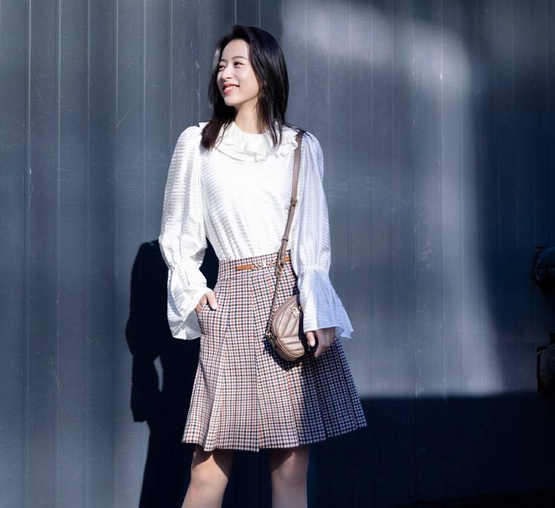 接下来拆解这套穿搭的 “青春魔法”—— 先说那件白衬衣,它不是普通的白衬衣,是自带 “初恋滤镜” 的白衬衣!领口微微松开一颗扣子,露出一点点锁骨(不多不少刚好撩人),袖口随意挽到小臂,一半塞进裙子一半垂下来,既藏住了小肚腩又显出了腰线,设计师怕不是偷了少女的日记本吧?再看那条灰色方格短裙,简直是减龄神器本器:高腰设计直接把腿拉到胸口(夸张但合理),裙摆长度刚好到膝盖上方,走动的时候晃啊晃,我都想跟着她跳一段校园华尔兹了。这两件单品组合在一起,就像牛奶加咖啡,完美得让人尖叫!