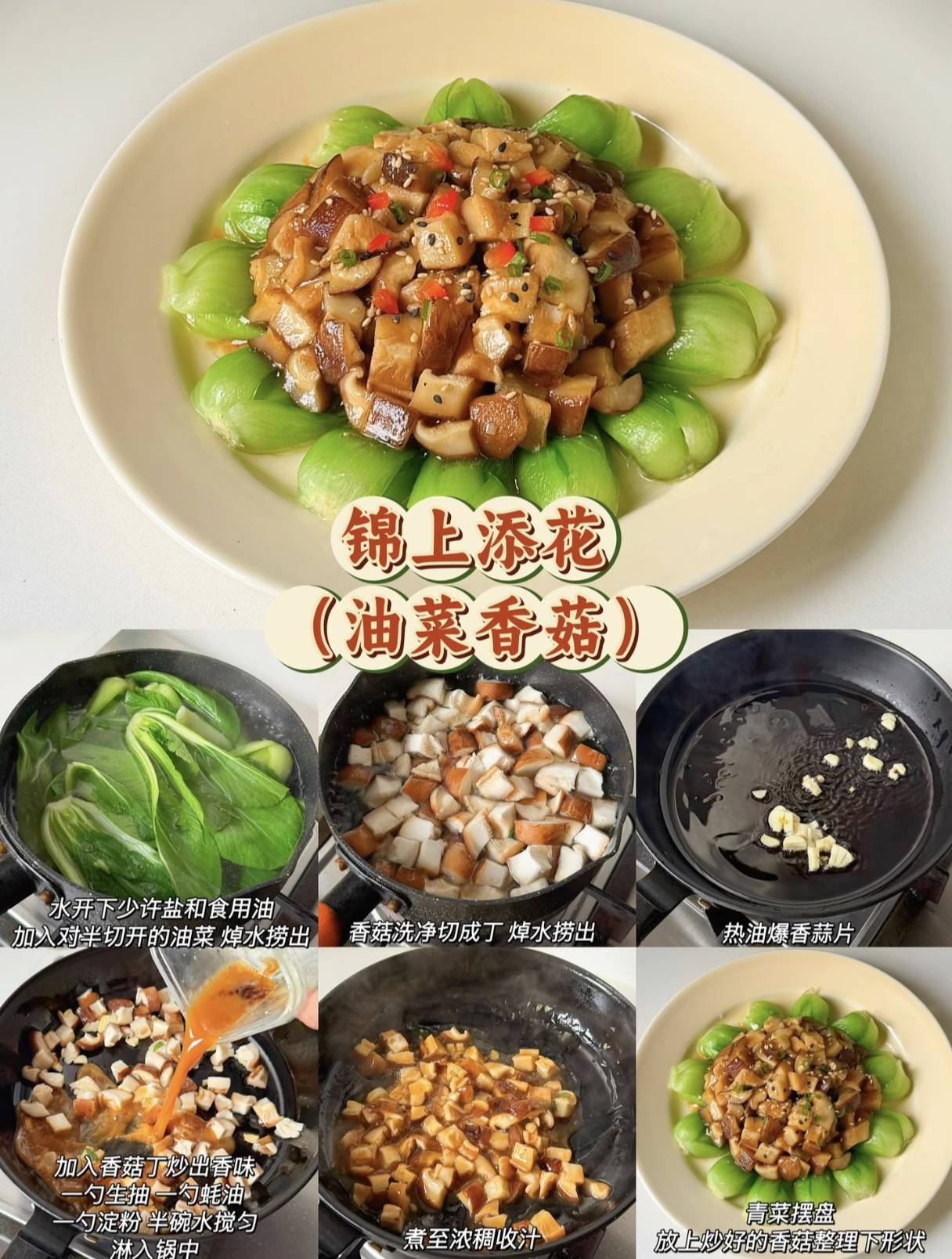 首先登场的是“锦上添花”——油菜香菇。这道菜的名字听起来就充满了美好的祝愿,而它的做法却简单得让人惊喜。将鲜嫩的油菜焯水后围成一圈,仿佛为餐桌铺上了一层绿色的地毯。再将切丁的香菇炒至金黄,淋上浓郁的酱汁,最后撒上葱花和芝麻,一道色香味俱全的佳肴便大功告成。油菜的清脆与香菇的鲜美完美融合,不仅营养丰富,更寓意着新的一年里,孩子们的生活将如这盘菜一般,锦上添花,步步高升。