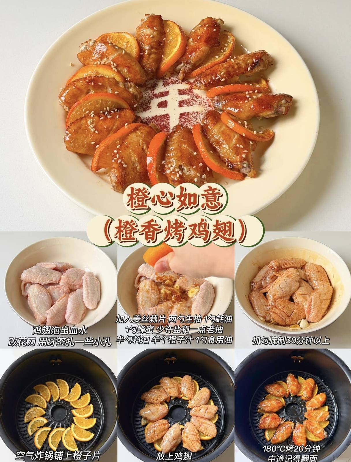 第三道菜是“橙心如意”——橙香烤鸡翅。鸡翅是孩子们的最爱,而橙香的加入则让这道菜多了一份清新与甜蜜。将腌制好的鸡翅放入空气炸锅,随着温度的升高,橙香与肉香交织在一起,弥漫在整个厨房。烤好的鸡翅外焦里嫩,每一口都是满满的橙香,仿佛将整个冬天的温暖都融入了其中。这道菜不仅美味,更寓意着孩子们的生活将如这橙香一般,甜甜蜜蜜,事事如意。