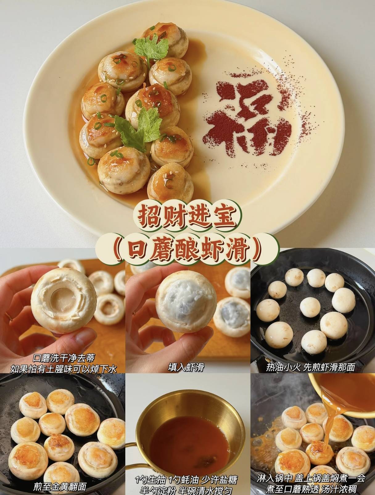 接下来是“招财进宝”——口蘑酿虾滑。这道菜的创意来自于对美好生活的向往,将鲜嫩的虾滑填入口蘑中,仿佛将财富与好运都藏进了每一个小小的口蘑里。煎至金黄的口蘑外皮酥脆,内里却鲜嫩多汁,每一口都是满满的幸福感。对于孩子们来说,这道菜不仅好吃,更像是一场寻宝游戏,每一口都能发现惊喜。而妈妈们则可以在享受美味的同时,默默许下对孩子未来的美好祝愿。