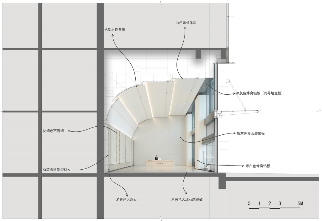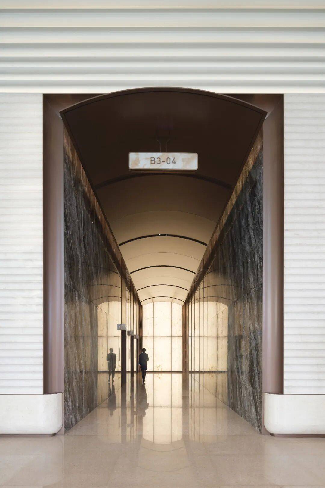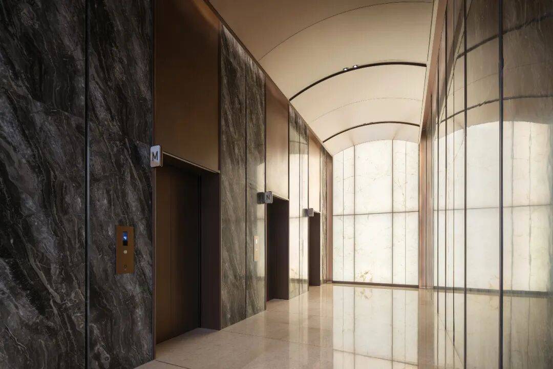 天花由铝形材转为涂料体系,地面由石材调整为瓷砖。 在以建筑与立面逻辑为起点的整体框架下,地面层转换大堂与标准层公共界面承担着将空间语言转译至日常使用层面的角色。设计不再追求形式上的强化,而是通过对材料体系、构造方式与空间秩序的统一控制,使整体概念在不同尺度与使用频率下保持一致的判断。地面层空间延续了四层主大堂的构成逻辑,在保持曲线关系与整体气质的前提下,对材料与做法进行有序简化。 墙面则通过铝板转印石材的方式,延续与主大堂一致的肌理表达。 标准层公共界面则进一步回到高频、长期使用的现实语境中。设计通过稳定而克制的体系控制,使电梯厅与公共走道在反复出现的日常场景中,持续保持与整体建筑逻辑一致的完成度。这一层级的设计不强调单点效果,而强调系统在长期运行中的可靠性——也正是都设在复杂项目中始终坚持的设计价值所在。