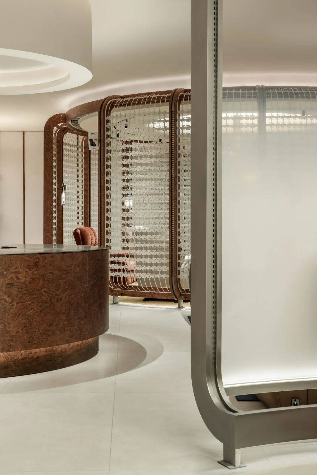 东北塔结合塔楼立面连续的流线语言,整体空间如水流倾泻般自上而下展。 通过墙面与吊顶的一体化弧形构造,让建筑外部的曲线在室内无缝延续。层叠式的吊顶系统,将灯光、风口等机电设备精心隐藏,仅留下柔和洗墙光晕模拟“水流倾泻”的光影层次。天然石材的温润与铜色金属的精致在统一色调中碰撞,于简约中蕴藏丰富的细节质感。