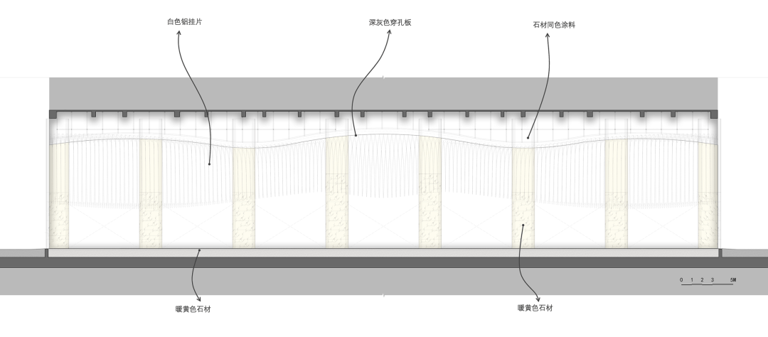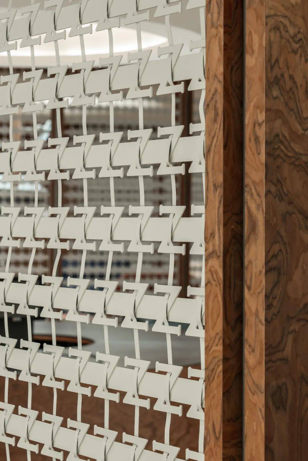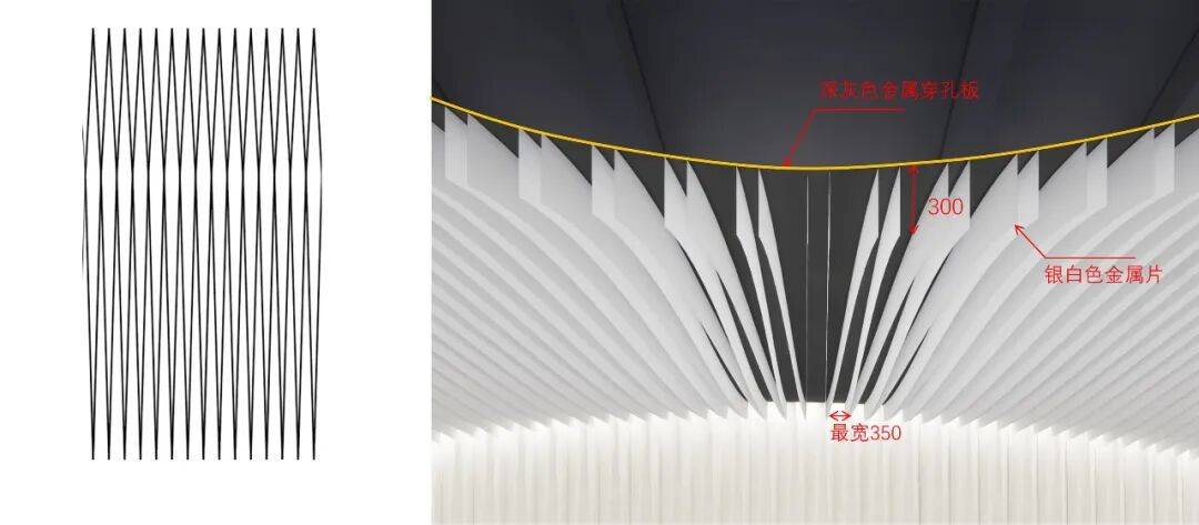 东南塔大堂顶面采用连续起伏的曲线构造,雨棚势能翻涌至室内。 在细部层面,流线型金属片以首尾相连的方式呈波浪状展开,构建出动感而连续的空间形态。机电设施如照明、送风口及喷淋装置等均巧妙隐藏于金属片间隙之中。白色灯具与吊顶融为一体,避免视觉突兀;金属线条遵循编织式构造逻辑,曲线背衬深灰色穿孔板,既起到固定作用,又满足排烟通风功能需求,同时有效遮蔽吊顶内部结构与管线系统。