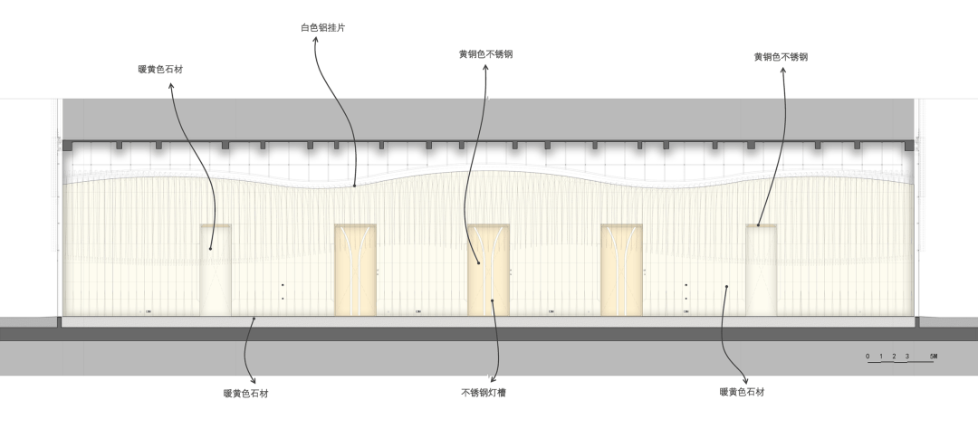 每一片流线型金属都是一次精密的定制,其间隙巧妙收纳所有设备,实现纯粹视觉与完备功能的无缝融合。 墙面与地面采用相同材质进行连续铺装,增强空间的整体感。墙面褶皱肌理与吊顶形态形成视觉互动,赋予大堂动态韵律感,塑造生动的空间形象。石材墙面通过渐变三角面处理,强化雕刻感与动感效果,延续吊顶的律动节奏。顶部凹槽设置洗墙灯光,勾勒出清晰轮廓,突出褶皱肌理特征,进一步强化材质表现力。在转角部位,墙面采用45度斜切处理,并集成标识导引系统,不仅自然引导视线朝向电梯厅,也提升了细节的层次感与功能性。