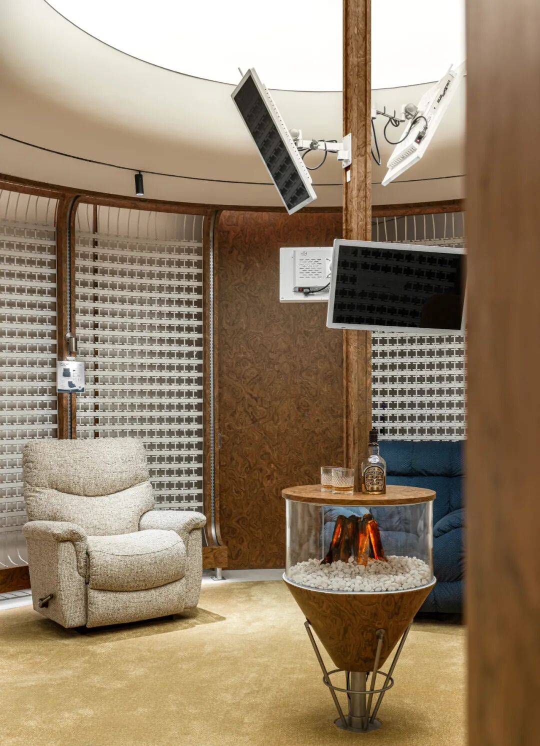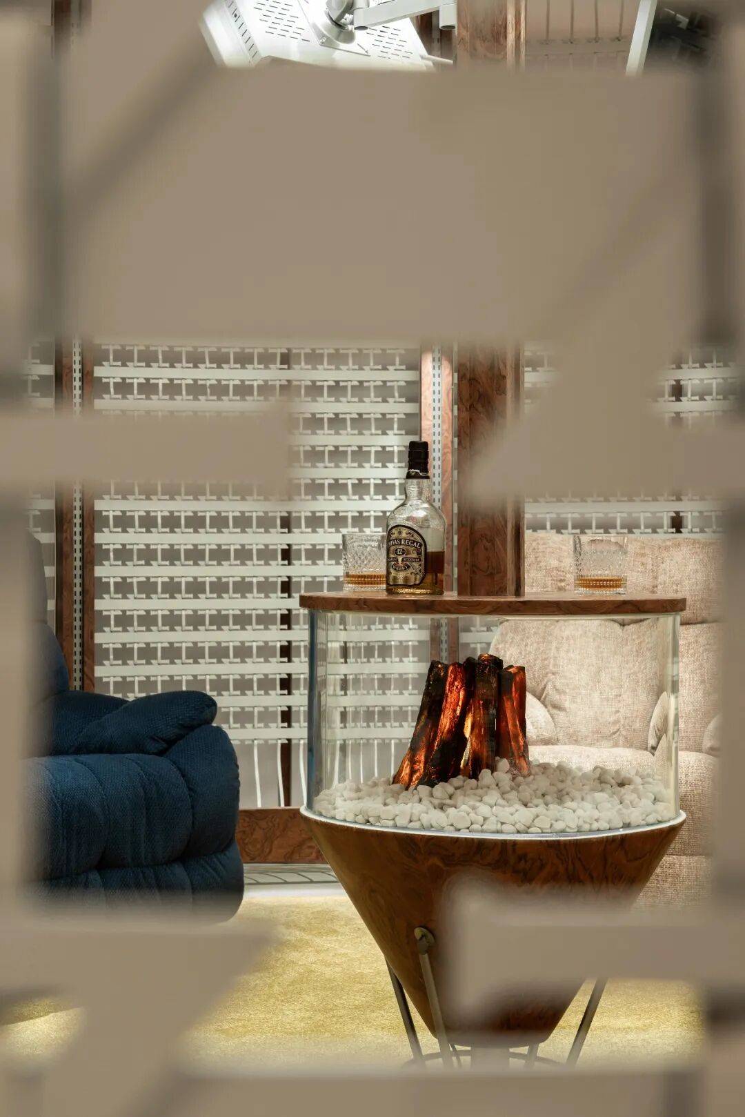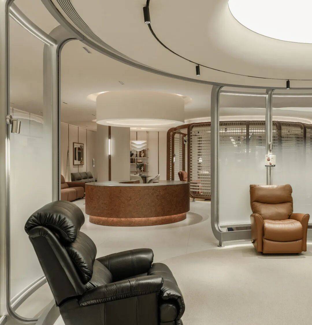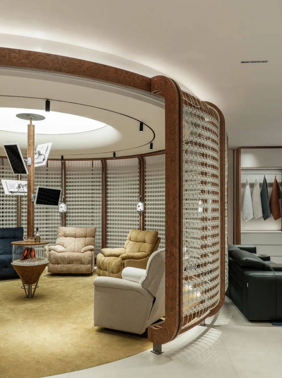 △Public Space 在每个独立的单椅场景中,座椅呈围合式布局,营造亲切、聚焦的体验氛围。场景中央巧妙设置壁炉与红酒区,营造温馨舒适的居家格调。更独特的是,当顾客躺下体验时,视线自然落于上方的展示屏,可观看该产品的介绍视频,实现身体放松与信息获取的同步。