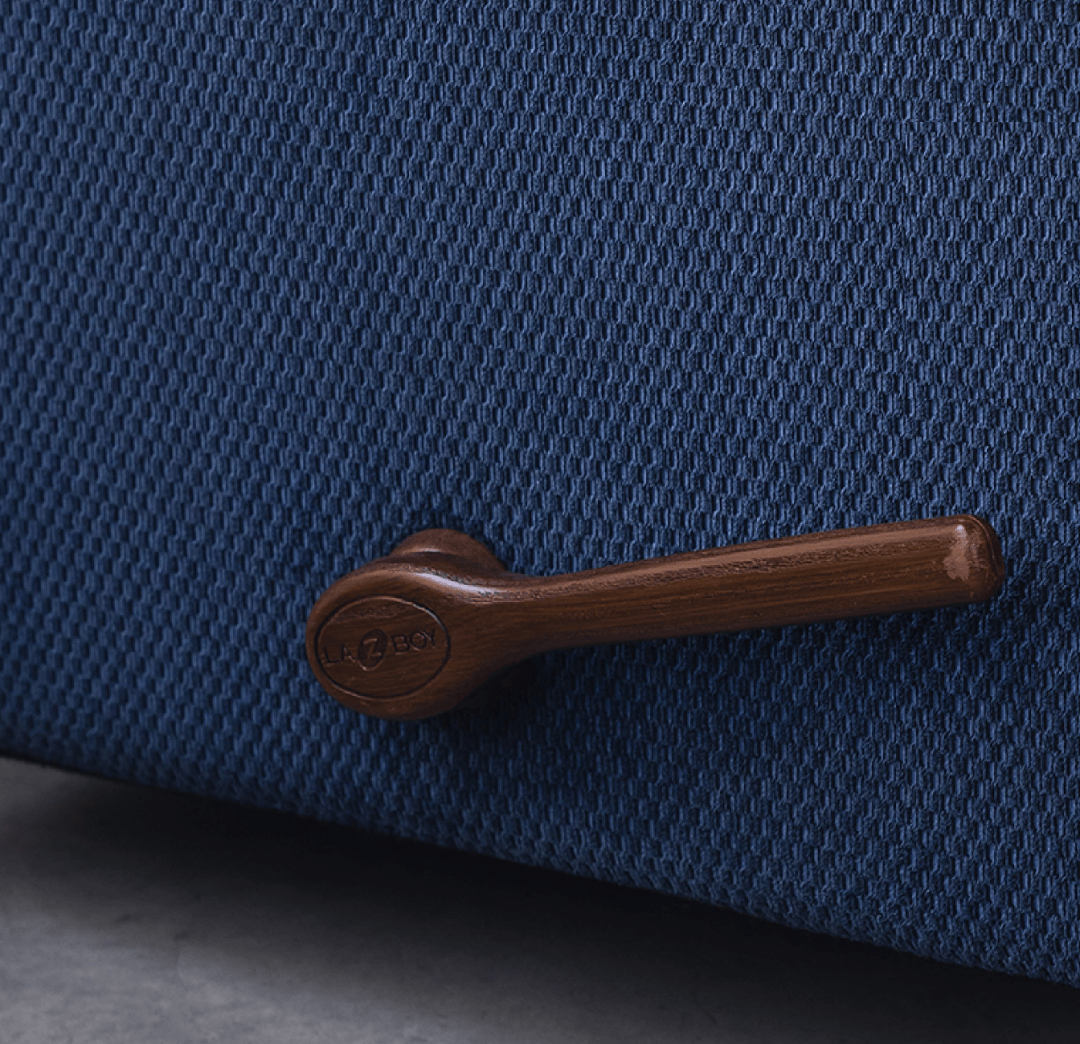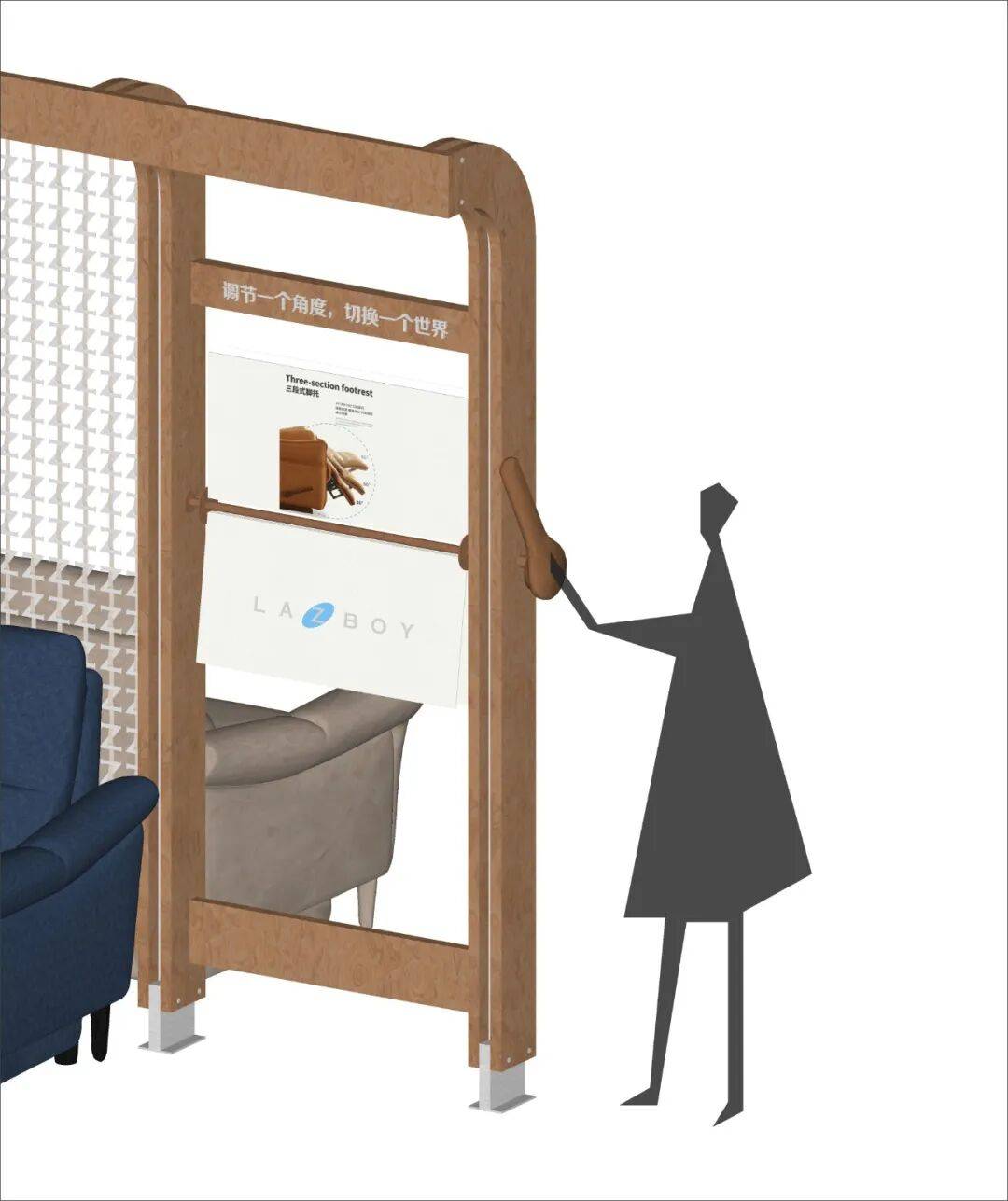△Adjustment Handle 每一款手动调节角度的LAZBOY功能沙发,侧面都配有标志性调节把手。我们将其转化为可交互的装置:轻轻旋转把手,相应的品牌视觉海报便会随之呈现,让消费者在互动中自然感知品牌故事。