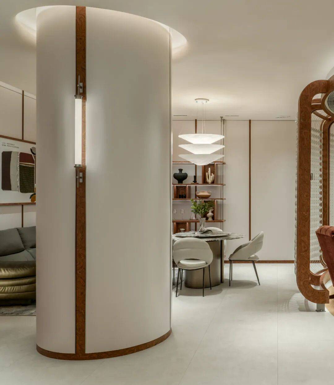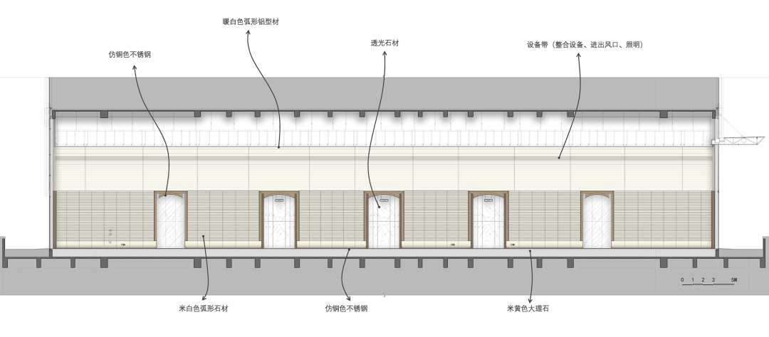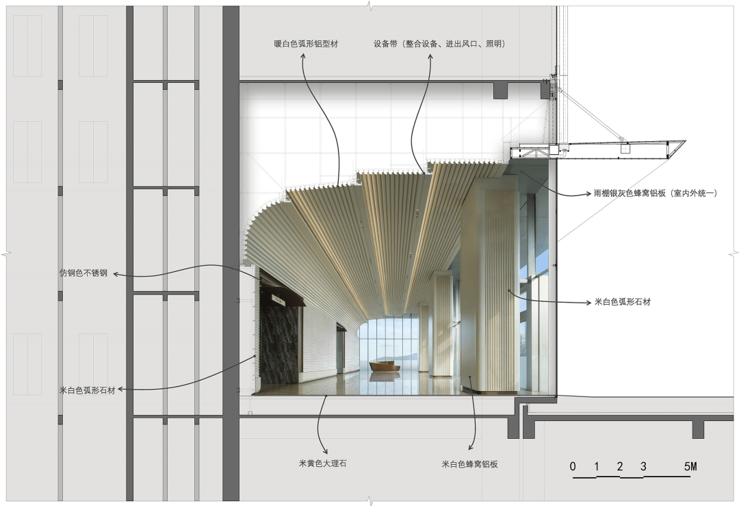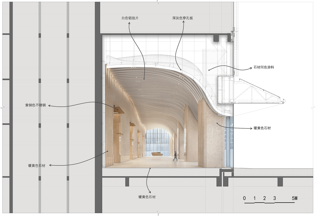 石材的弧形墙面与弧形的吊顶构件形成节奏的变化。