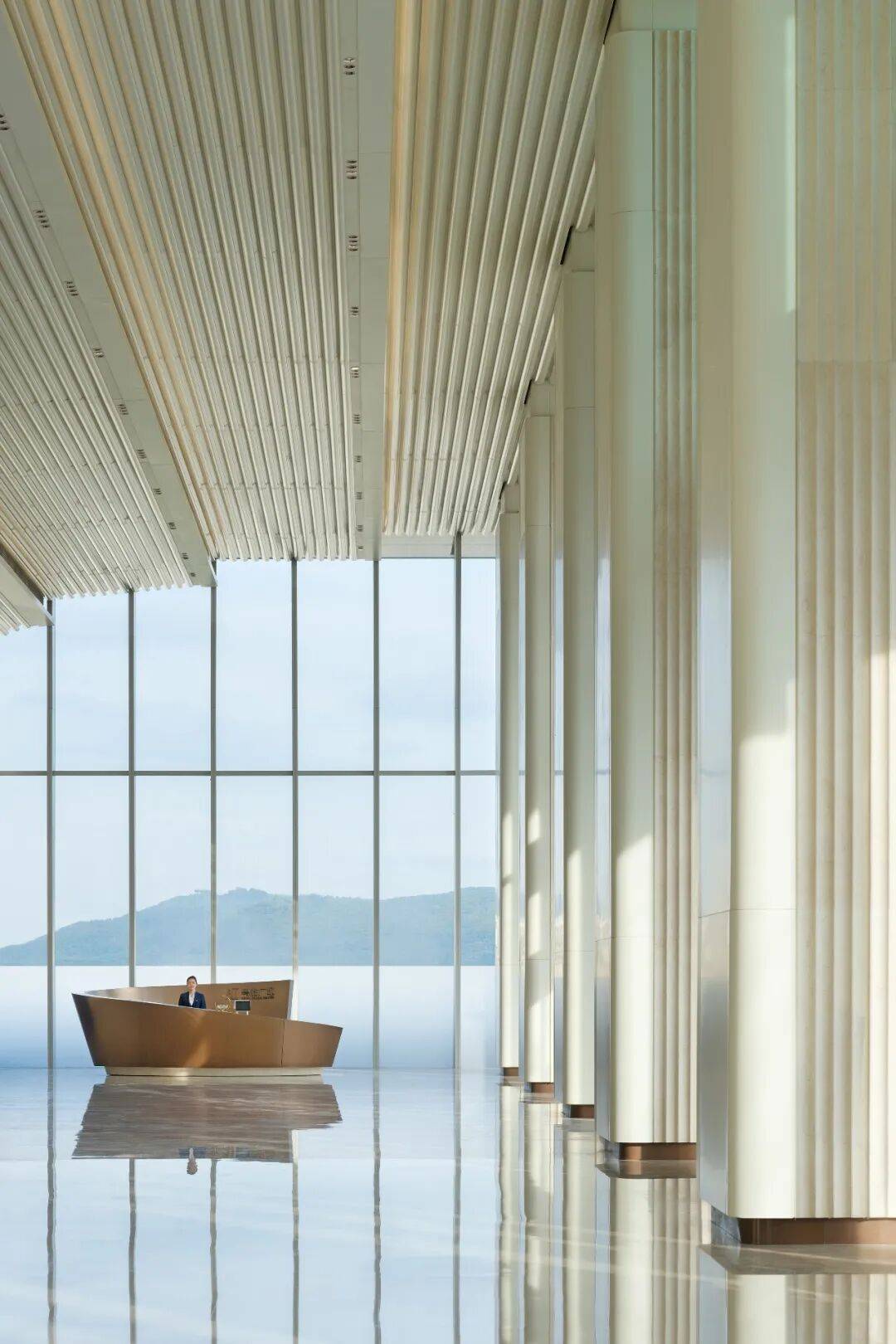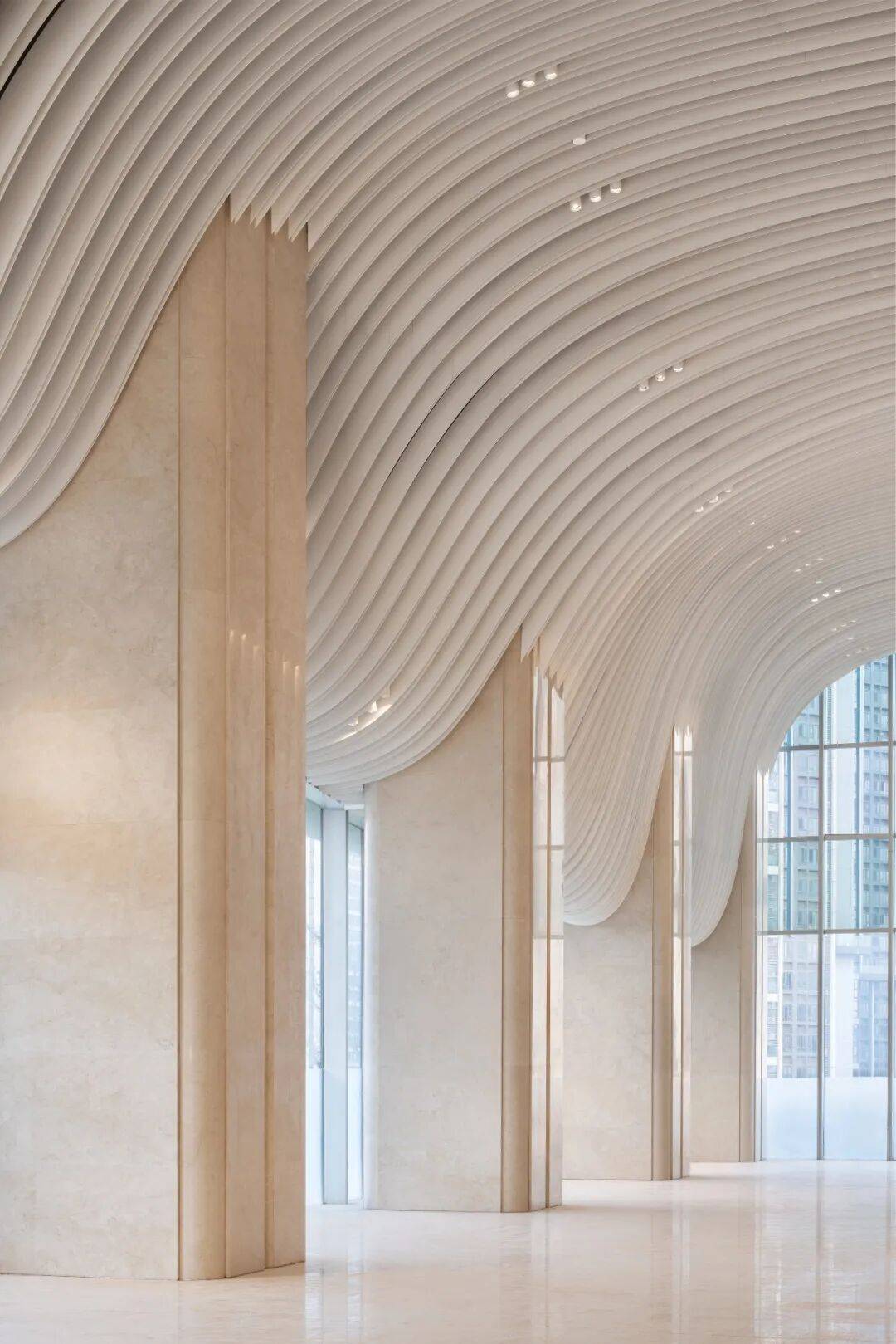 一体化的弧面构造,让建筑语言在室内完美延续。光,成为描绘“水流”轨迹的画笔。 如何让建筑立面上流淌的“水”的意象,与木棉花瓣的形态共鸣,穿越玻璃幕墙,在室内空间中延续、演化,成为人们可感、可知、可停留的体验? 东北塔大堂弧形吊顶与建筑雨棚自然衔接,形成一道流畅而有力的视觉引导。通过纵向延伸与轴线强化,将进入后的动线引导转化为清晰而集中的空间体验,自然地把视线引向端头的白云山。结合塔楼立面连续的流线语言,整体空间如水流倾泻般自上而下展开,在秩序与节奏中建立清晰而稳定的公共场所形象。