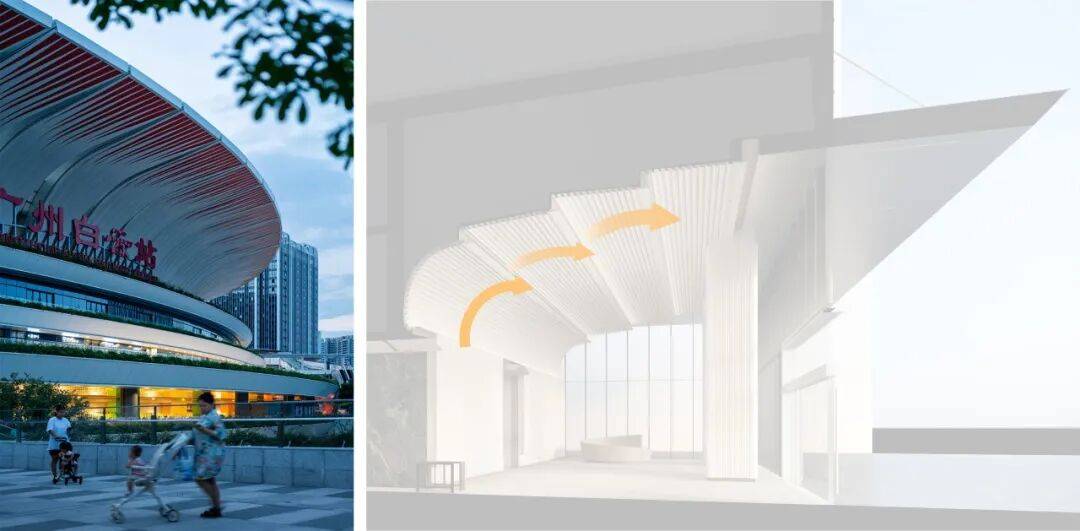 ▲ 东南塔吊顶的曲线形态,与雨棚对应