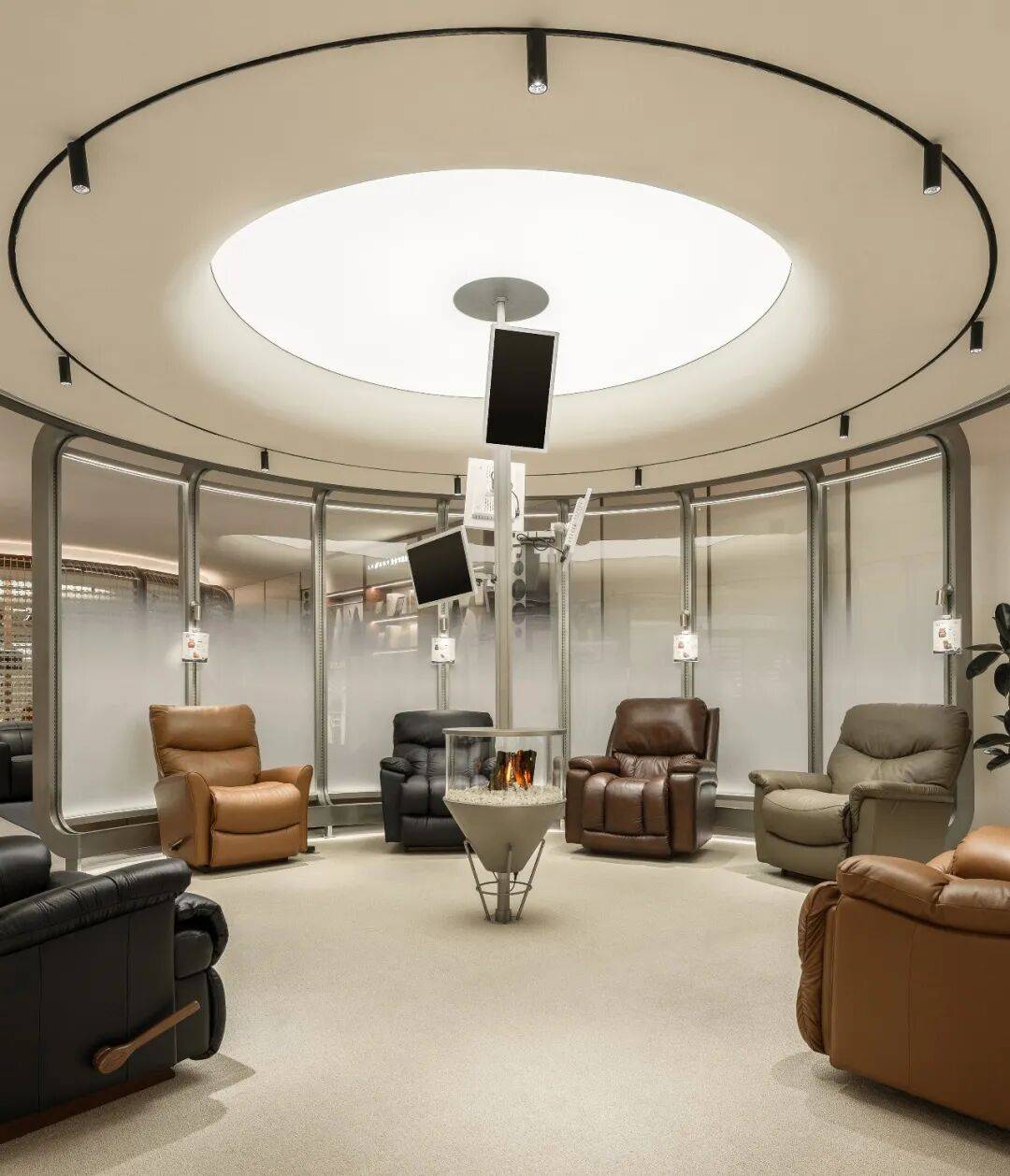 △ClassicLaz Space 叙事化场景与体验升级基于对产品体系的梳理:我们以LAZBOY几大核心系列为线索,进行了一次大胆的空间规划。我们将不同系列的功能单椅置于各自独立的主题场景中,化销售陈列为沉浸体验,使空间本身成为品牌故事与产品价值的传播媒介。