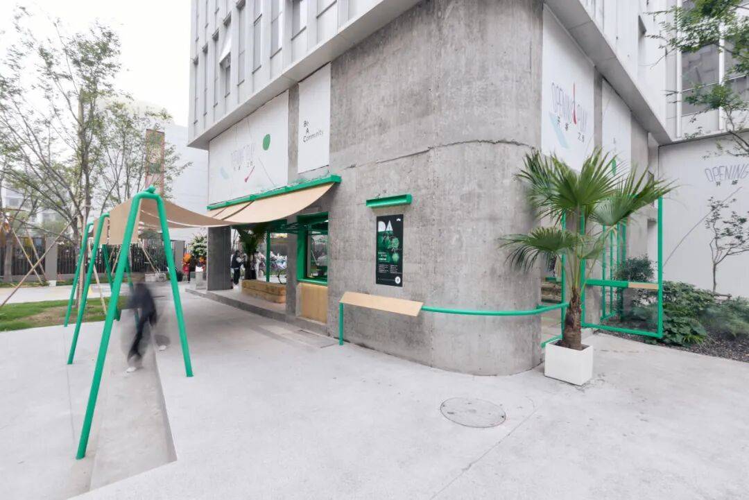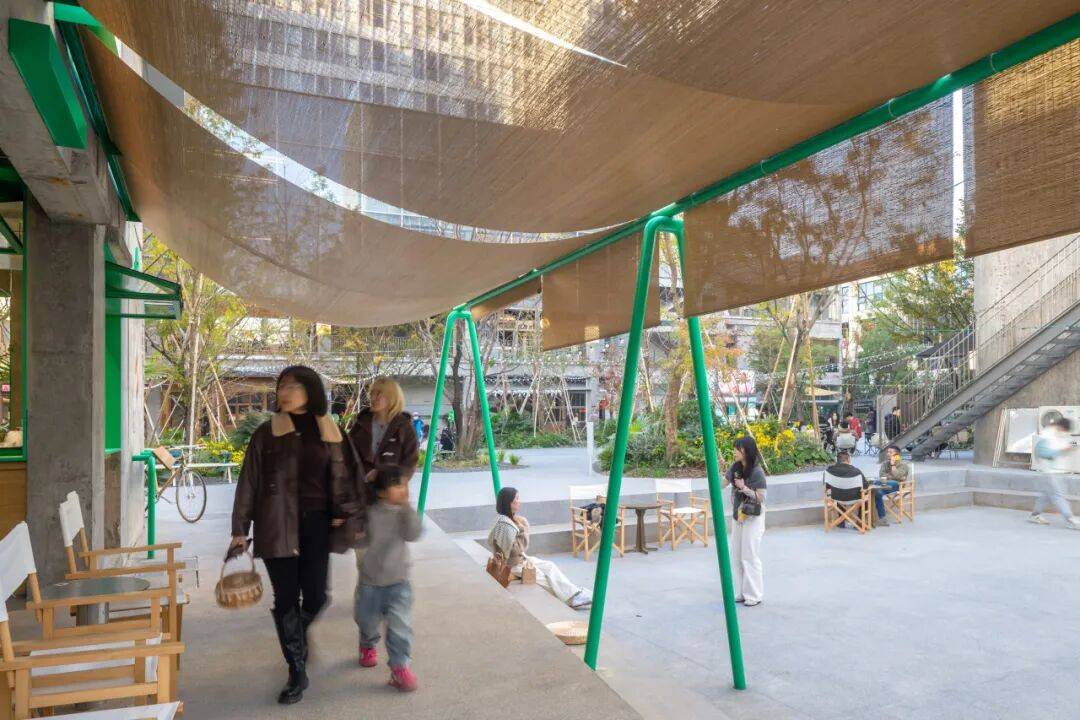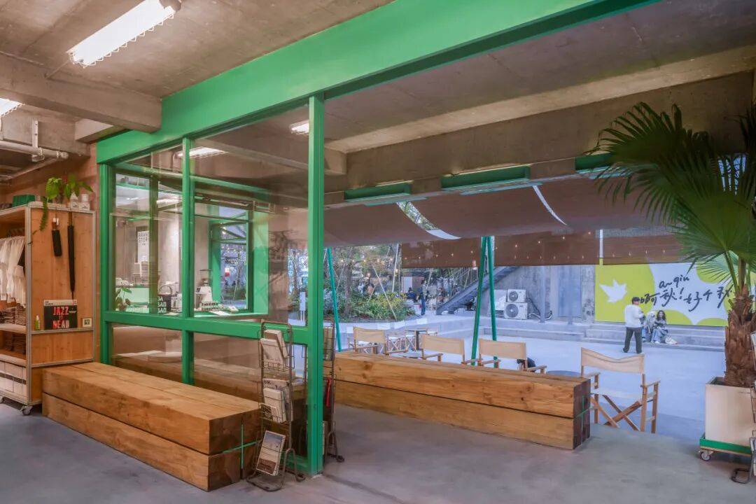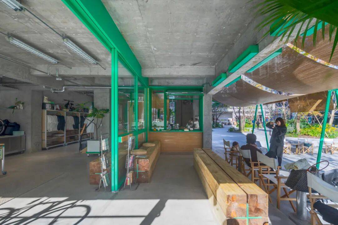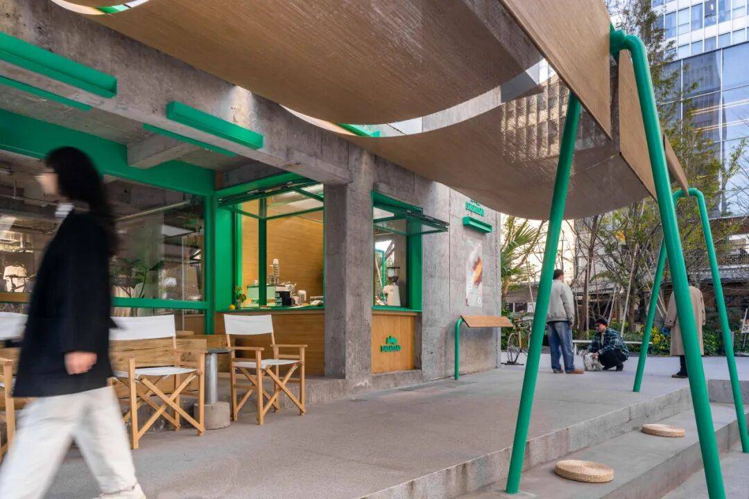 咖啡台的内与外©嵒建筑摄影 我们在平行于建筑立面的位置,于下沉小公园上设置了绿色游具。这些游具屹立在广场中,增添了公园的童趣氛围,同时通过竹帘与建筑立面相连接,在内退空间与小公园之间形成了一个“屋檐”下的过渡区域。这个设计有意模糊室内外边界,将室内空间自然延伸到室外;同时为路过的游客提供遮蔽与庇护,让他们在闲逛或驻足时感受到更舒适的停留感,强化整体的陪伴与亲近体验。