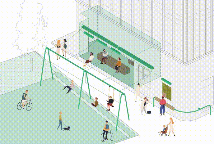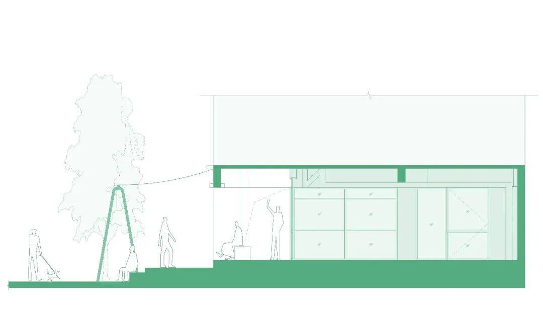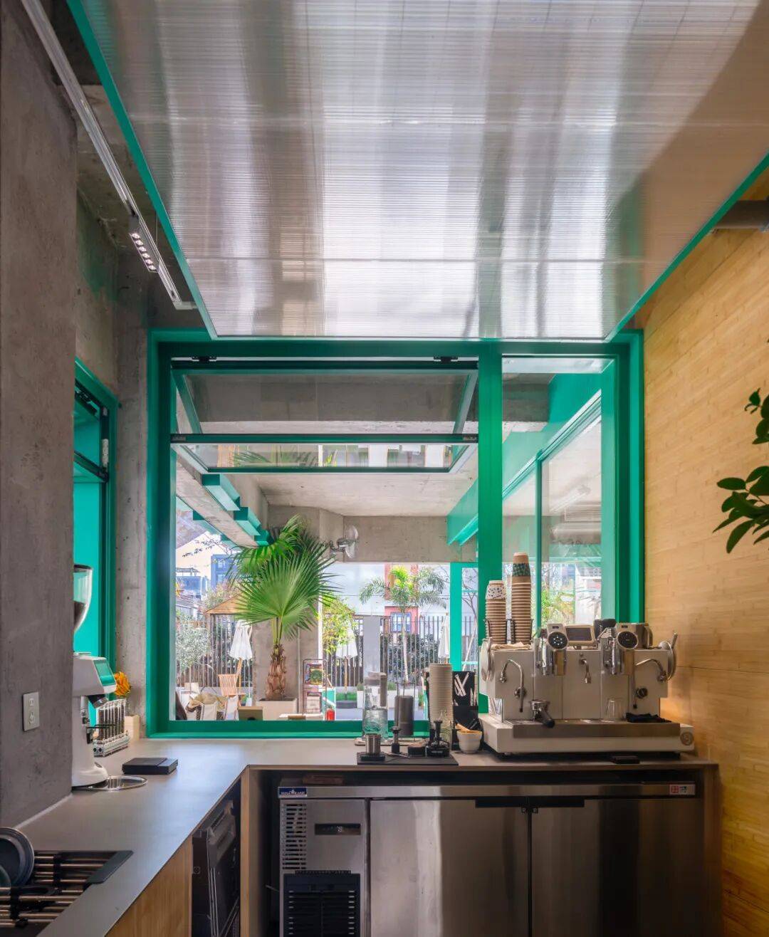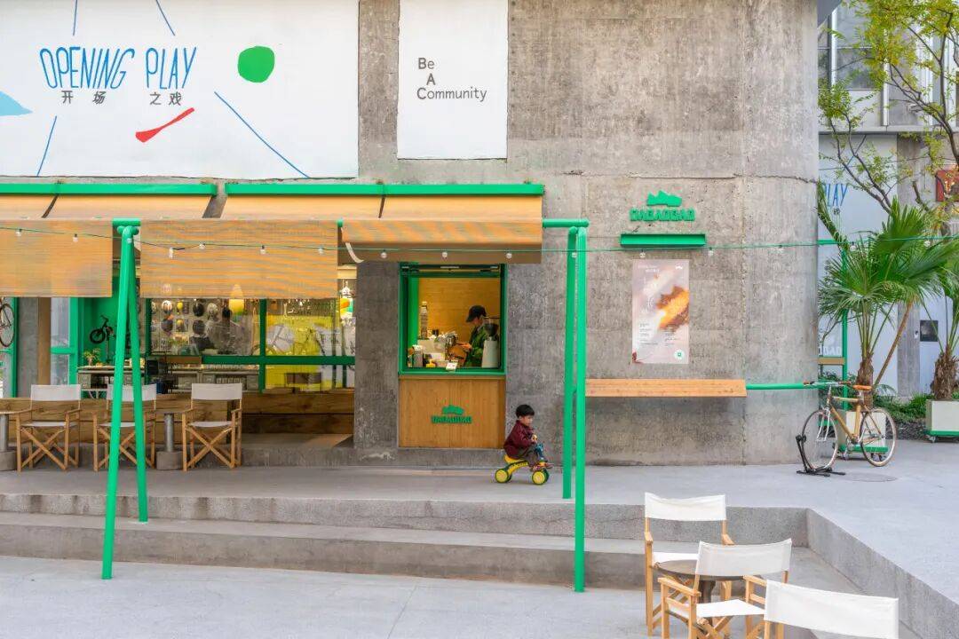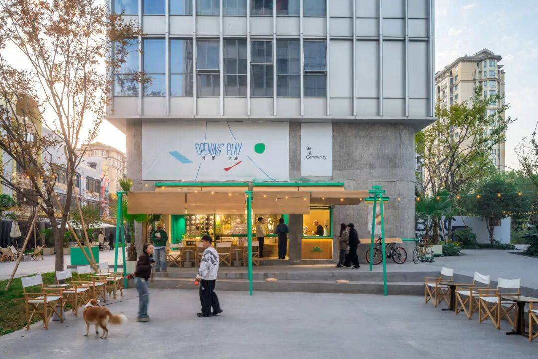 咖啡台的内与外©嵒建筑摄影 我们在平行于建筑立面的位置,于下沉小公园上设置了绿色游具。这些游具屹立在广场中,增添了公园的童趣氛围,同时通过竹帘与建筑立面相连接,在内退空间与小公园之间形成了一个“屋檐”下的过渡区域。这个设计有意模糊室内外边界,将室内空间自然延伸到室外;同时为路过的游客提供遮蔽与庇护,让他们在闲逛或驻足时感受到更舒适的停留感,强化整体的陪伴与亲近体验。