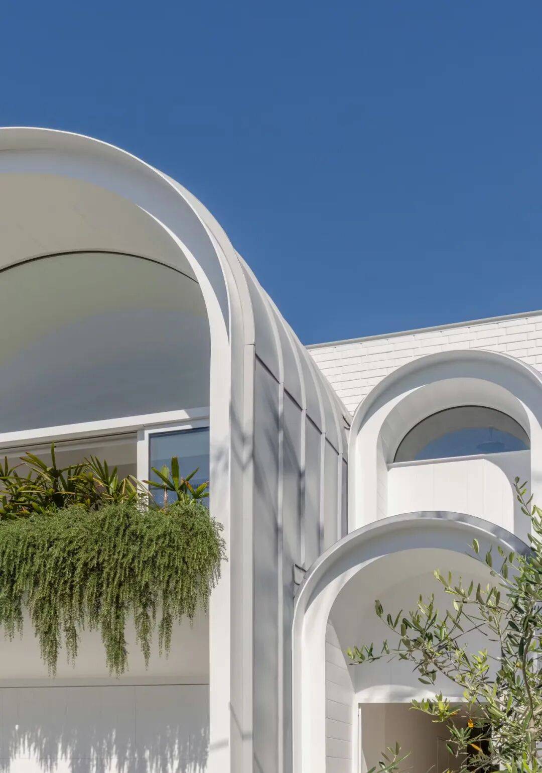 该住宅占地面积约 200 平方米,建筑体量由多个相互衔接的几何单元构成。立面以曲线与拱形元素为主要特征,这些形式在尺度和节奏上与周边传统住宅常见的山墙、拱券和窗洞比例形成呼应。建筑外墙以浅色材料为主,使整体体量在街道界面上与周边建筑保持连续的视觉关系,同时通过简化的几何形态区分于传统建筑的装饰性立面。