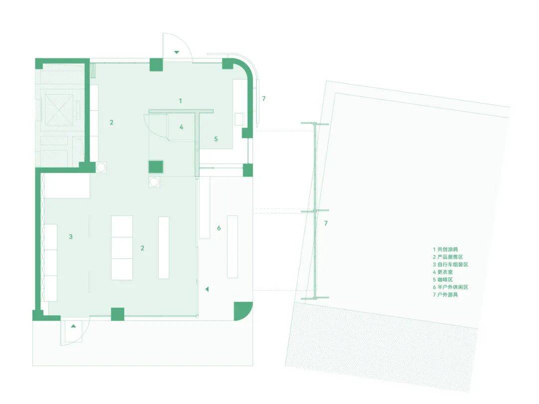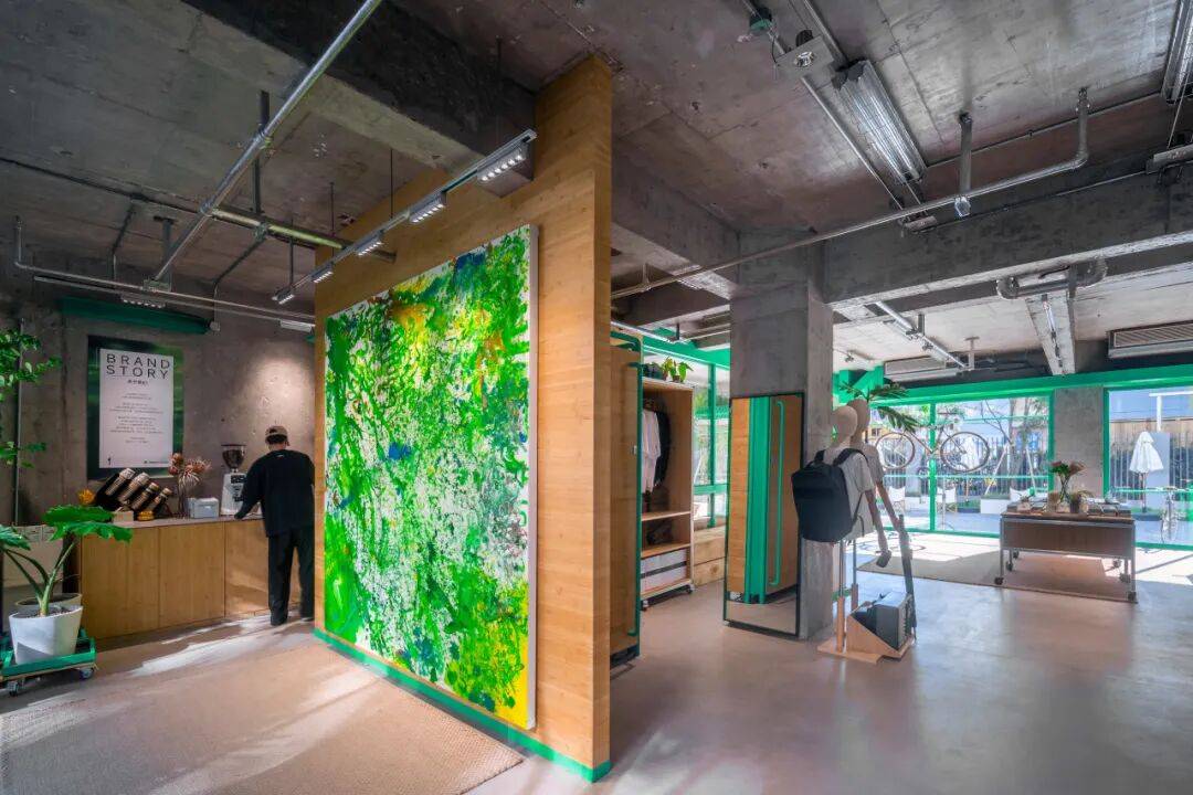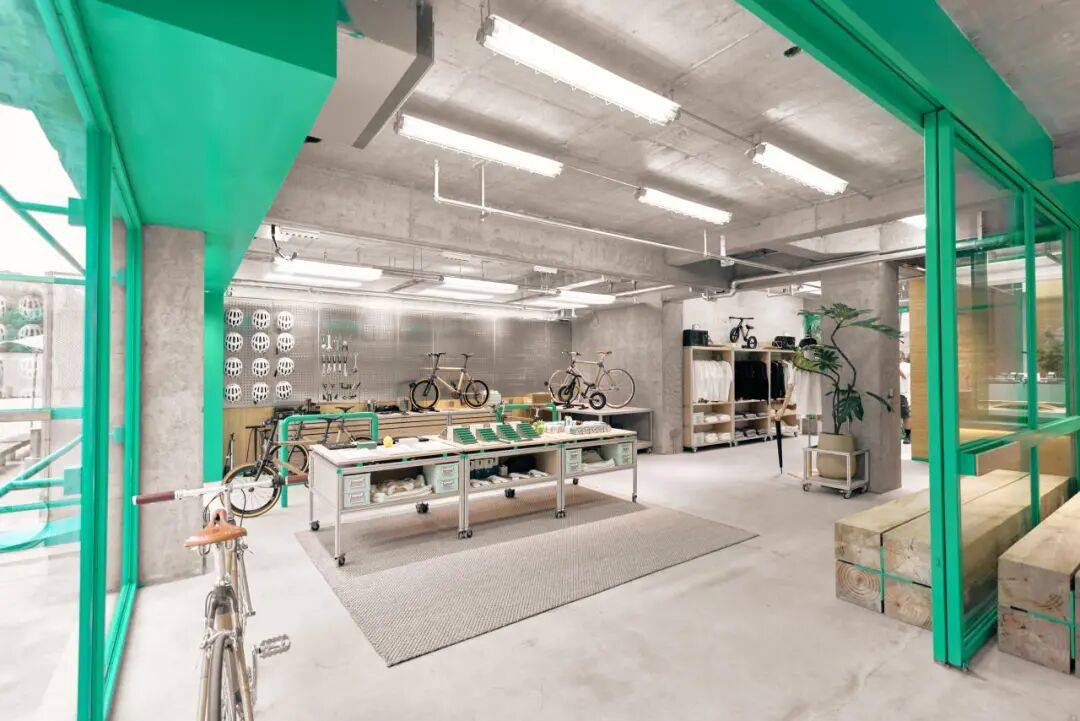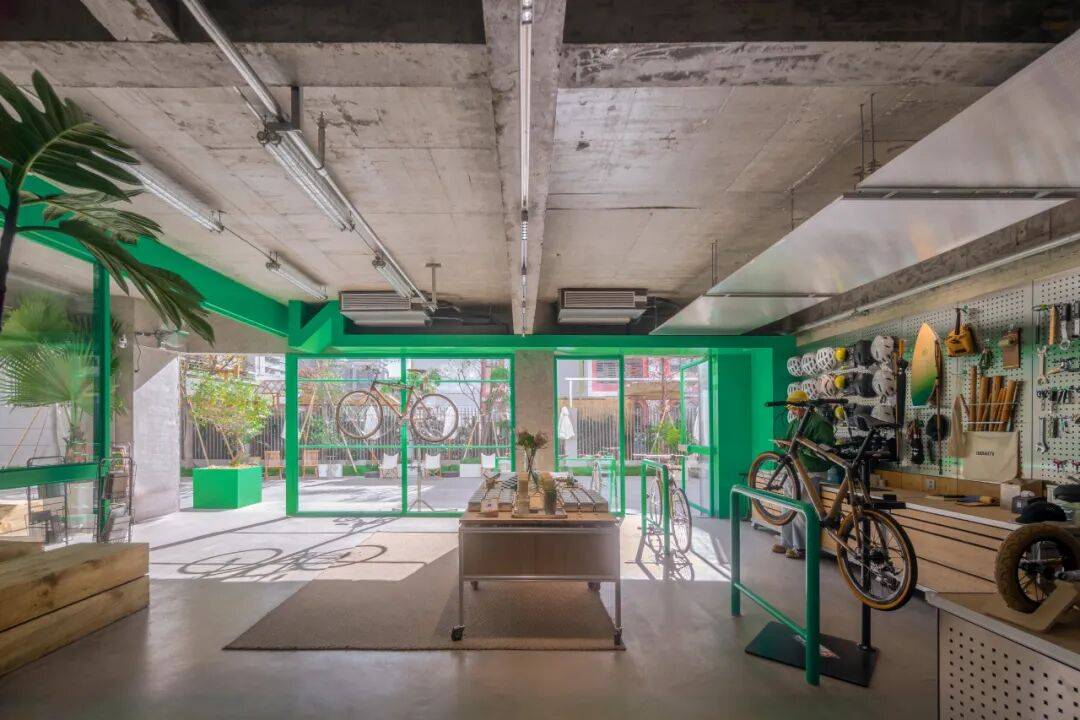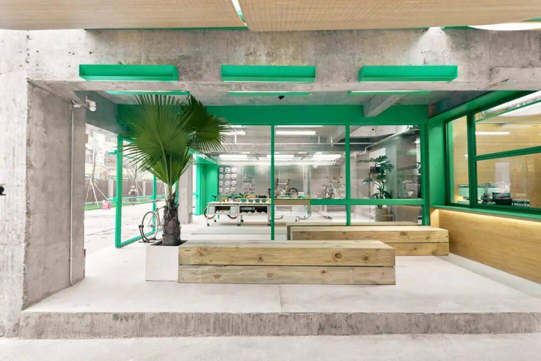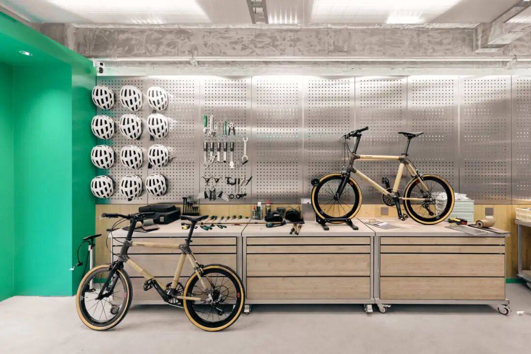 DABAOBAO的绿色元素©DABAOBAO 我们选用竹压板作为主要材质,其天然纹理和温暖色调与绿色调性高度统一,既强化了生态表达,也与店内核心产品——以竹子作为骨架的自行车,形成材质与理念上的完整闭环。这种贯穿始终的绿色与竹元素,让空间整体呈现出从混凝土“灰”到自然“绿”的活力跃迁,同时让环保理念从视觉到触感都变得可感知、可触摸。