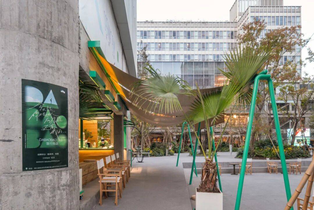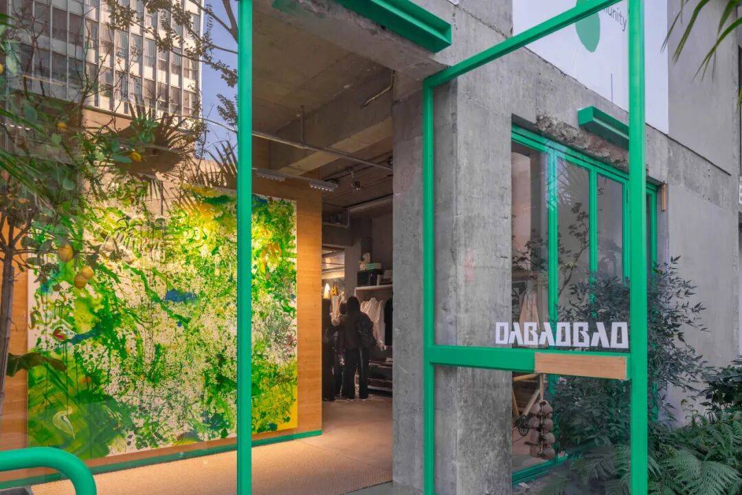 绿色游具与竹帘©嵒建筑摄影 绿色元素!作为贯穿始终的核心设计语言,在DABAOBAO旅行商店中扮演了双重角色。它首先在粗犷的混凝土基底中脱颖而出,为之注入鲜活的生命力和对比感;同时直接呼应品牌的环保核心信念:可持续与自然共生。