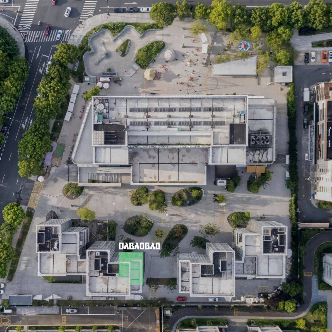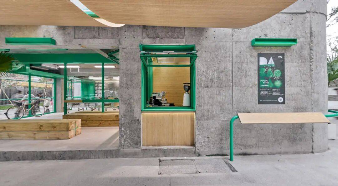 DABAOBAO建筑外观照片©嵒建筑摄影 我们在东侧设置了一个3平米的咖啡操作台。双面开窗,一面朝向内退后的半室外空间,一面直面下沉小公园。像儿时街角小卖部一样,操作过程完全开放、可视,吧台高度亲切、无隔挡,目的是缩短人与人之间的距离,顾客点单时自然聊天,路人也能轻松加入对话。咖啡台由此成为空间的社交节点,落地品牌的“陪伴“与“温度”理念。