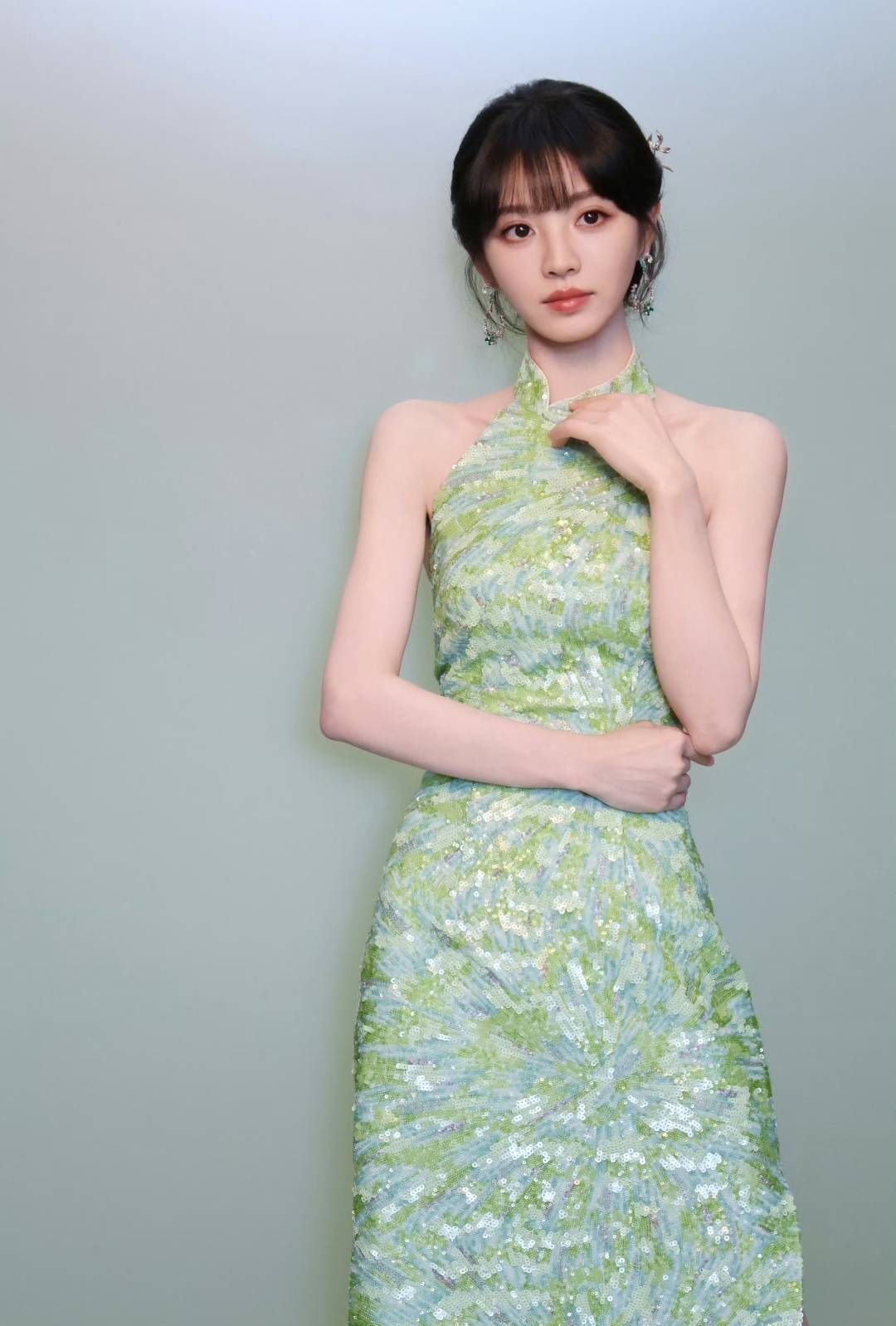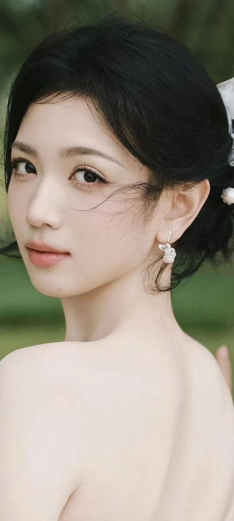 甜还是甜的,那种从眼神里透出来的清澈感没变。但这一身吊带,直接把氛围拉到了另一个层次——纤细的肩带挂在锁骨上,露出一截白皙的肩颈线条,锁骨分明,手臂修长,整个人像是刚从夏夜的微风里走出来。