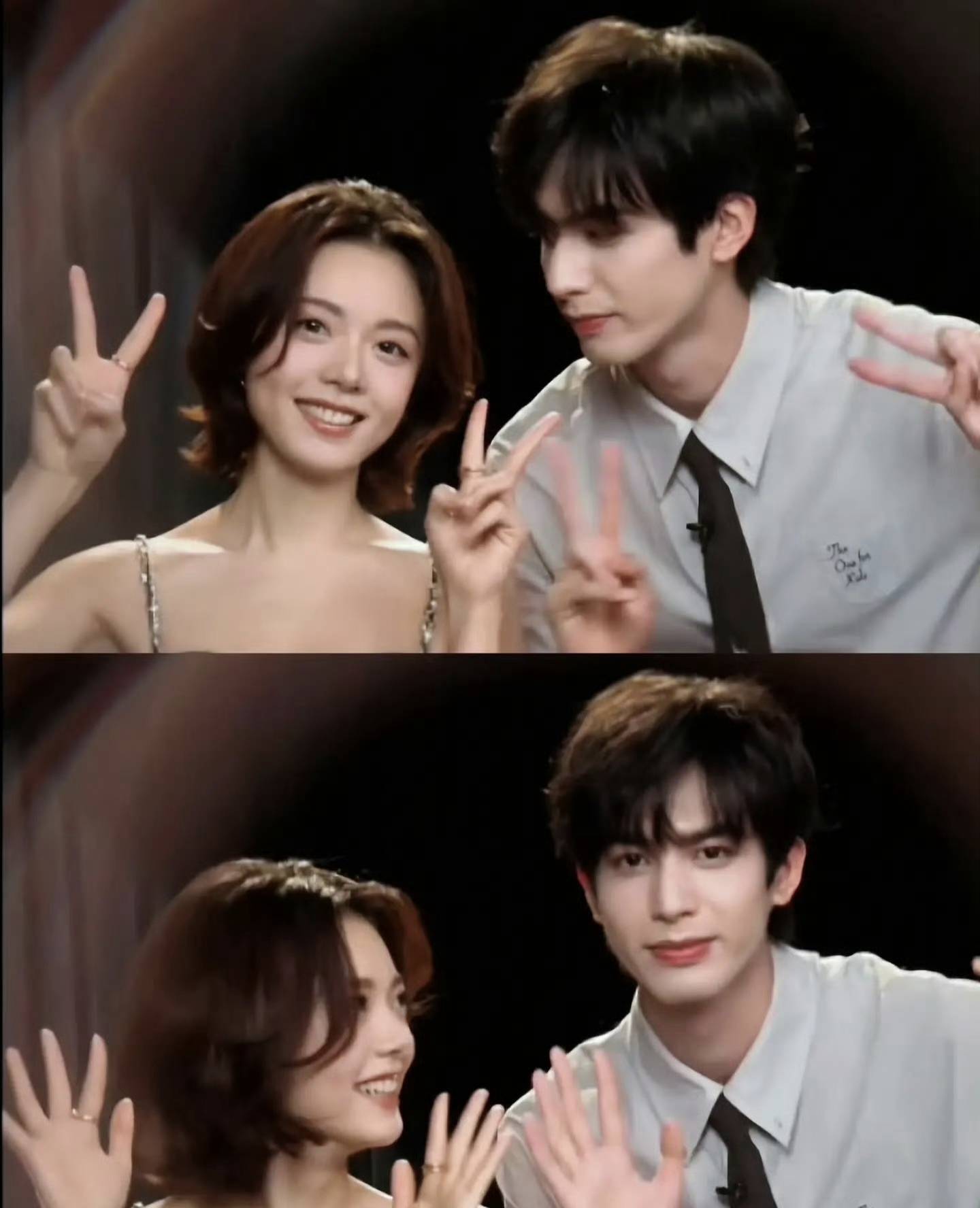 镜头前,宋威龙和赵今麦穿着简约精致的礼服,两张脸几乎贴在一起,双手默契地比着心。