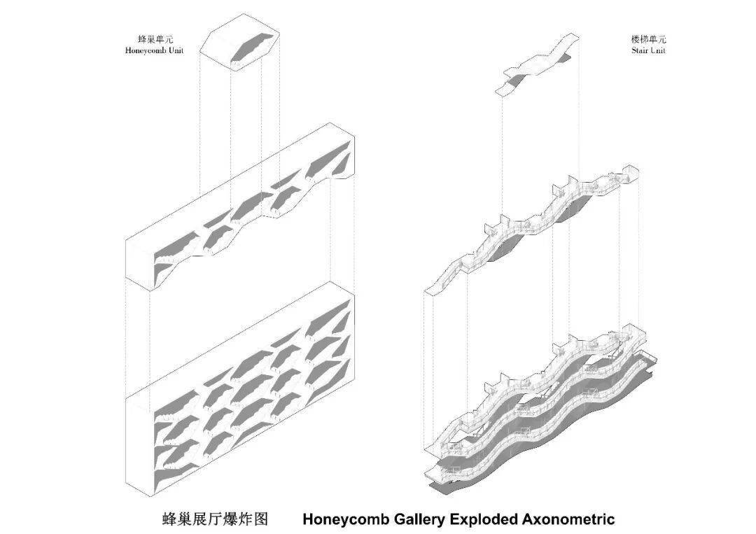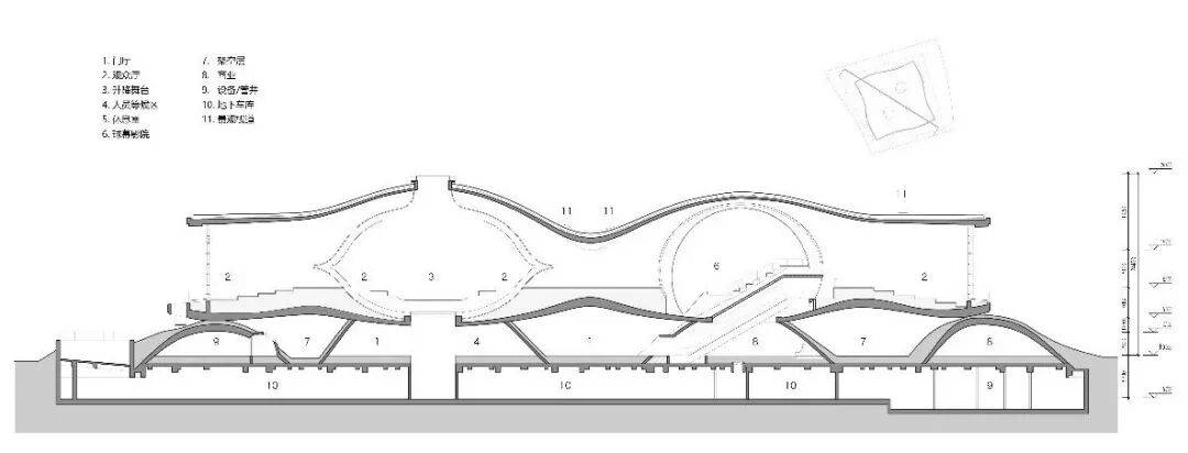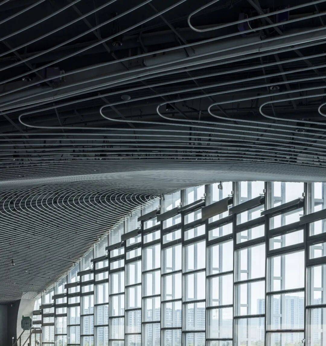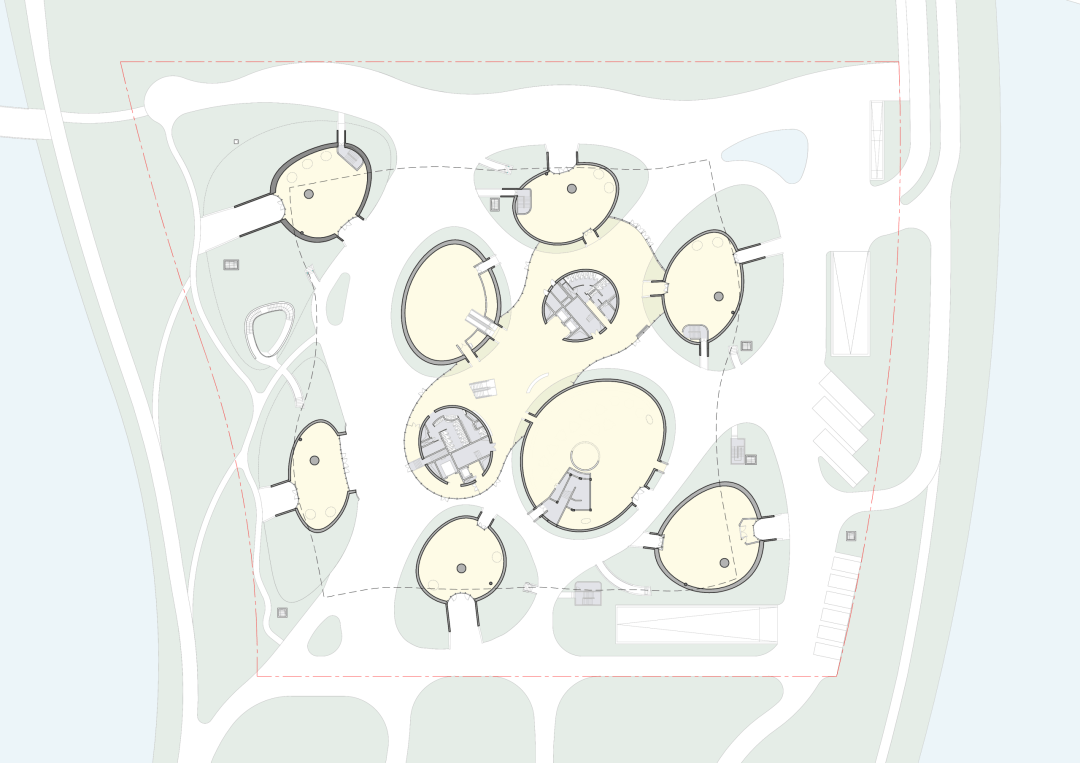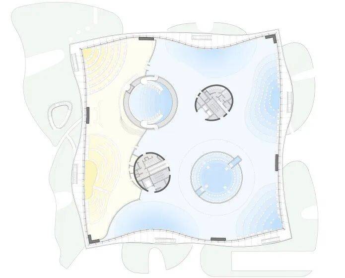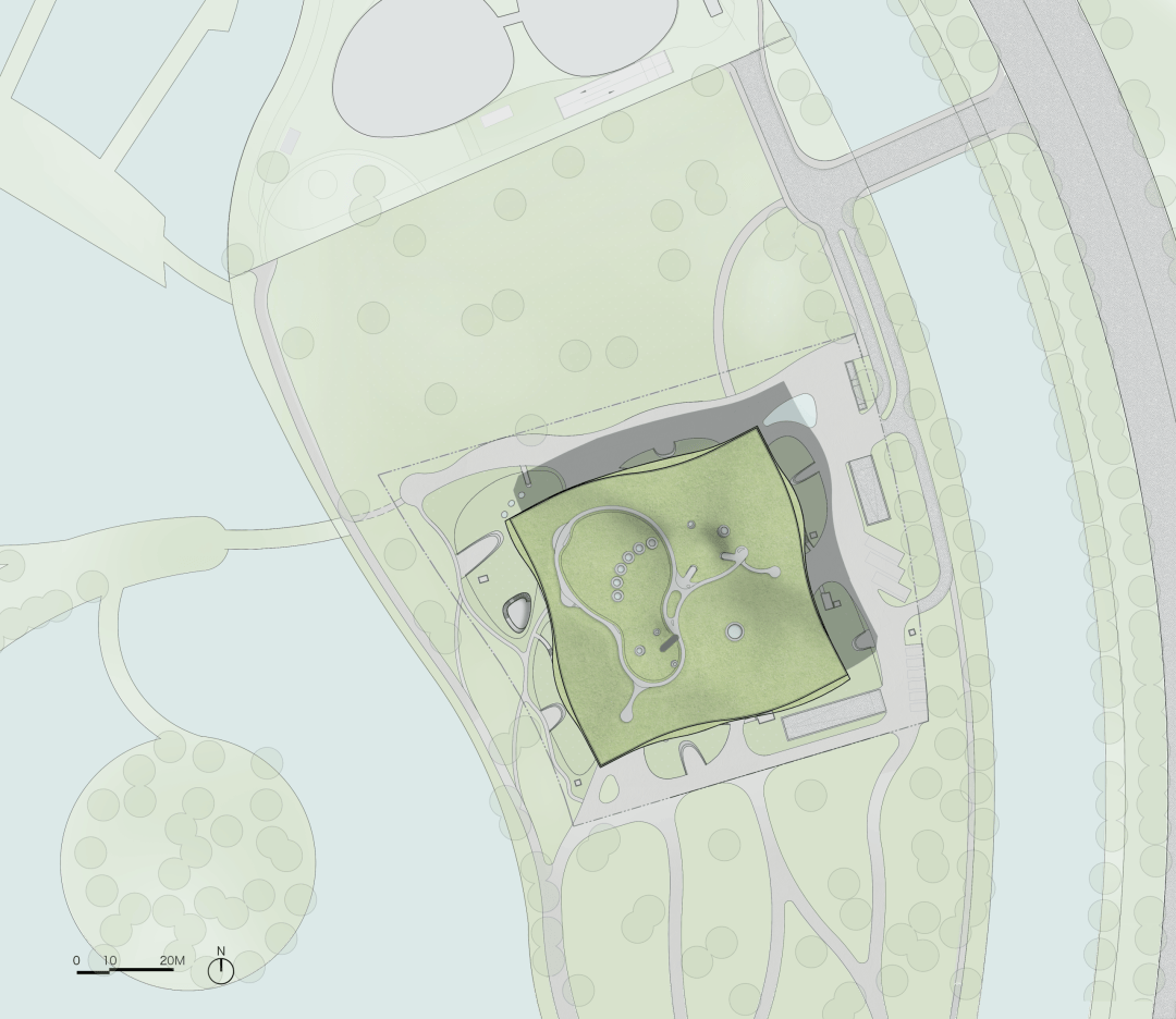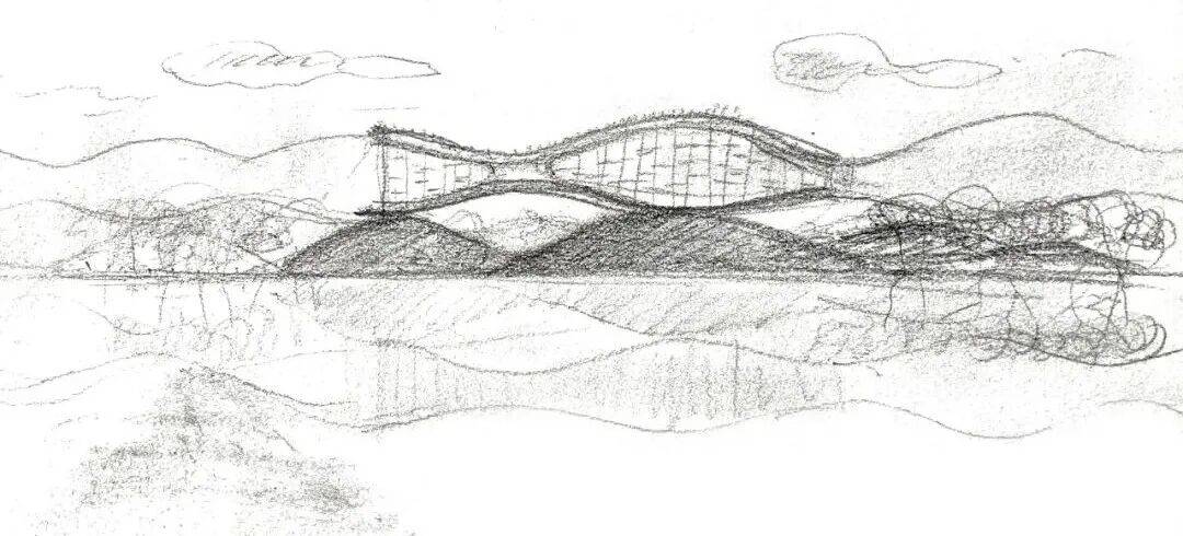 ▲视频 ©是然建筑摄影 波的意象 中国古代诗词中常见“波”字。波的字源虽有形声(水和皮的古音)、形意(水和坡)、会意(王安石“水之皮”)等不同说法,但波所代表的水之起伏、以及波在自然界中奇妙的动态传导,则一直为文学家所赏识,并通过文学语言不断描绘其更普遍的内涵、更广阔的尺度、以及更抽象的传播意义。“滟滟随波千万里,何处春江无月明”(春江花月夜),张若虚诗中的波仿佛一种媒介,让月之光华传遍江河湖海;“水是眼波横,山是眉峰聚”(卜算子·送鲍浩然之浙东),王观词中的水波与山峰同享起伏之态,联通山水和眉眼,可以传情。 在现代物理学的范畴里,波是连续介质最重要的运动形式。空气中的声波、水面的涟漪、地震波、光波、无线电波、引力波、细胞振动波等等,都是连续介质波动性的体现。描述波的基本物理量是振幅、相位、频率。 无论在文学还是科学里,波都是既普遍又神秘的。地球的日常环境中,只有少数可见的连续介质产生波动时才能被观察,比如水波,而身体尺度的体验就更难得,例如只有冲浪者才有机会进入海浪内部。建筑做为一种人造构筑物,由静力学结构形成固定空间,以满足人在平坦空间内活动和休憩的需求,自然很难对波这样的动态系统有所参照,只有类似滑板池这样的固定场所才能让人获得动态的起伏体验。山水秀近年的作品持续聚焦在“庭院聚落”、“家的延伸”、“自由细胞”三个方向,其中的“自由细胞”尝试通过技术和空间体验的融合,探索新的建筑形制。延绵的山水、传统建筑屋顶聚落、细胞的连续繁衍和信息传导都和波有着形态上的关联,我们也一直在思考,波的形态对未来的建筑能否有更多可以借鉴的意义?金海湖畔的“在水一方”给我们提供了一次难得的探索机遇。 ▲在水一方南侧鸟瞰 ©刘国威 折拱之波 在上海五座新城的规划中,奉贤的金海湖是新城的核心景观。“在水一方”的基地近乎正方形,位于湖东的环形半岛上,东西两侧临水,是一座以科幻为主题的多功能文化地标。设计的走向源自选址和功能定位:建筑在景观空间上与环湖绿带取得协调的同时,也需要在内部体验和外部形象上建立自身的独特性。 ▲ 金海湖整体鸟瞰 ©苏圣亮 ▲ 在水一方鸟瞰©苏圣亮 上海多水少山,奉贤更是一片平川沃野,从地貌出发而别具一格是最自然也最有力量的设计方向,因此人造山丘很早就成为构思的一部分。由此出发,我们希望起伏的形态不仅成为外部形象,更能为内部空间提供独特的体验,给科幻主题带来更多突破性演绎的可能。地景、标志性、空间体验:在这三者的交汇处,我们构思出一种由波状单元构成的聚落,可以在三维空间里无限延展,然后从中提取一个局部用于这座建筑。经过多种尺度比选,最终确定的提取范围是大约80X80X20米,由三层波面构成三重上下叠加的起伏空间,通过三维九宫格定义波的振幅和相位,并给出波单元在上层大空间出现的频率:两个完整单元、四个1/2单元、以及两个1/4单元,形成了振幅约12米,跨度约54米,悬挑约27米的波状巨构。可以说,这是山水秀“自由细胞”系列中最大的细胞聚落了。 ▲ 三层波面的生成 ©山水秀 ▲ 在水一方东南侧鸟瞰 ©苏圣亮 在运用正弦曲线得到这个波结构的初步三维模型后,我们邀请结构顾问张准团队开展了结构可行性的研究,并期望波形能够和拱壳的传力原理耦合,推导出可行的结构形式。在讨论中,我们认识到标准的正弦波壳与拱壳相比有完全不同的传力模式,而传统结构意义上的受压拱壳要完成这样尺寸的跨度和悬挑,又需要超出我们预想的矢高和壳体厚度。于是,一种介于壳和波之间、既能受压又能受拉的空间结构形态成为双方共同探索的目标,结构师用简化的折面找到了重力和侧向力的主要传导路径,通过折面到壳面的拓扑变形巧妙地解决了重力、侧向力传导以及悬挑受力的挑战,将钢筋混凝土结构中的受压性能和预应力受拉性能运用到了极致。双方籍由不断的讨论和相互找形,最终一起得到了这个介于拱壳和折面之间的复合结构空间:下部的“绿丘”、中部的“穹洞”、以及上部的“波方”。 ▲ 在水一方草图 ©祝晓峰 ▲ 建筑西立面 ©苏圣亮 波壳空间 下部的绿丘是从地面隆起的8座混凝土壳,内含展厅、咖啡、餐厅、文创商店、设备用房等。周圈的六座绿丘和两个核心筒一起支撑着上部结构,传导下来的力在丘顶被拆分,其中重力主要由蘑菇柱承担,侧向力则沿丘壳传到地面和地下室顶板;在中间的两座绿丘则与从波方下垂的反壳亲吻在一起,叠合处形成的两个圆洞分别为自动扶梯和升降舞台提供上下贯通的空间。在绿丘的表面,挡土种植格维护住山坡上的种植土,并通过局部的人工照明为暗处的耐阴地被植物补光。在绿丘的内部,兼具排烟和通风功能的圆形天窗将自然光引入洞穴般的空间,增添了柔和神秘的气氛。 ▲ “绿丘”与“波方”的叠合处的草图 ©祝晓峰 ▲ 支撑着“波方”的“绿丘” ©苏圣亮 各自隆起的绿丘是分散的,绿丘之间的空间处于上部“波方”的覆盖下,形成了中部连续的“穹洞”。在外围,架空的半户外场所为人群引入周边的风景,并让环湖步道在建筑下方穿过;在中央,落地玻璃幕墙围合出首层门厅,在绿丘环抱中成为建筑内部动线的枢纽和集散地,其中的两个核心筒上下贯穿了整座建筑,承担结构支