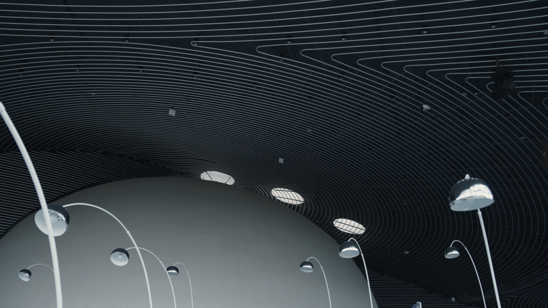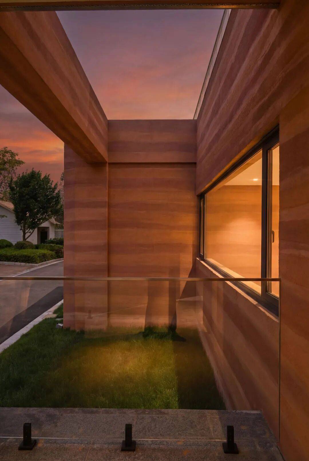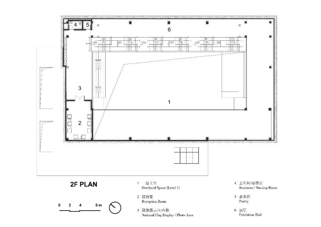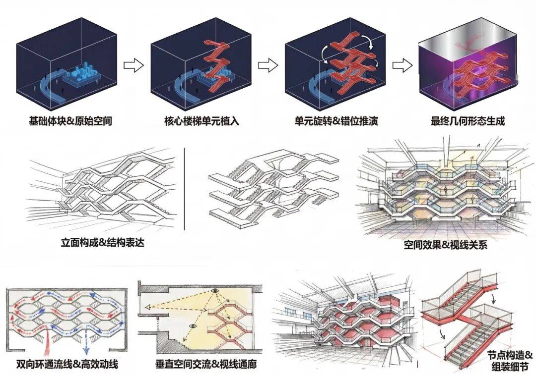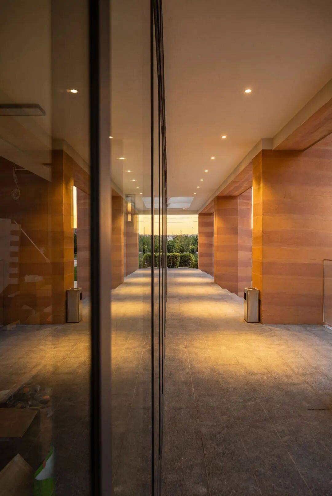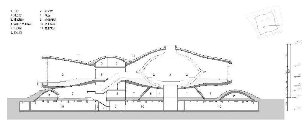 ▲视频 ©是然建筑摄影 波的意象 中国古代诗词中常见“波”字。波的字源虽有形声(水和皮的古音)、形意(水和坡)、会意(王安石“水之皮”)等不同说法,但波所代表的水之起伏、以及波在自然界中奇妙的动态传导,则一直为文学家所赏识,并通过文学语言不断描绘其更普遍的内涵、更广阔的尺度、以及更抽象的传播意义。“滟滟随波千万里,何处春江无月明”(春江花月夜),张若虚诗中的波仿佛一种媒介,让月之光华传遍江河湖海;“水是眼波横,山是眉峰聚”(卜算子·送鲍浩然之浙东),王观词中的水波与山峰同享起伏之态,联通山水和眉眼,可以传情。 在现代物理学的范畴里,波是连续介质最重要的运动形式。空气中的声波、水面的涟漪、地震波、光波、无线电波、引力波、细胞振动波等等,都是连续介质波动性的体现。描述波的基本物理量是振幅、相位、频率。 无论在文学还是科学里,波都是既普遍又神秘的。地球的日常环境中,只有少数可见的连续介质产生波动时才能被观察,比如水波,而身体尺度的体验就更难得,例如只有冲浪者才有机会进入海浪内部。建筑做为一种人造构筑物,由静力学结构形成固定空间,以满足人在平坦空间内活动和休憩的需求,自然很难对波这样的动态系统有所参照,只有类似滑板池这样的固定场所才能让人获得动态的起伏体验。山水秀近年的作品持续聚焦在“庭院聚落”、“家的延伸”、“自由细胞”三个方向,其中的“自由细胞”尝试通过技术和空间体验的融合,探索新的建筑形制。延绵的山水、传统建筑屋顶聚落、细胞的连续繁衍和信息传导都和波有着形态上的关联,我们也一直在思考,波的形态对未来的建筑能否有更多可以借鉴的意义?金海湖畔的“在水一方”给我们提供了一次难得的探索机遇。 ▲在水一方南侧鸟瞰 ©刘国威 折拱之波 在上海五座新城的规划中,奉贤的金海湖是新城的核心景观。“在水一方”的基地近乎正方形,位于湖东的环形半岛上,东西两侧临水,是一座以科幻为主题的多功能文化地标。设计的走向源自选址和功能定位:建筑在景观空间上与环湖绿带取得协调的同时,也需要在内部体验和外部形象上建立自身的独特性。 ▲ 金海湖整体鸟瞰 ©苏圣亮 ▲ 在水一方鸟瞰©苏圣亮 上海多水少山,奉贤更是一片平川沃野,从地貌出发而别具一格是最自然也最有力量的设计方向,因此人造山丘很早就成为构思的一部分。由此出发,我们希望起伏的形态不仅成为外部形象,更能为内部空间提供独特的体验,给科幻主题带来更多突破性演绎的可能。地景、标志性、空间体验:在这三者的交汇处,我们构思出一种由波状单元构成的聚落,可以在三维空间里无限延展,然后从中提取一个局部用于这座建筑。经过多种尺度比选,最终确定的提取范围是大约80X80X20米,由三层波面构成三重上下叠加的起伏空间,通过三维九宫格定义波的振幅和相位,并给出波单元在上层大空间出现的频率:两个完整单元、四个1/2单元、以及两个1/4单元,形成了振幅约12米,跨度约54米,悬挑约27米的波状巨构。可以说,这是山水秀“自由细胞”系列中最大的细胞聚落了。 ▲ 三层波面的生成 ©山水秀 ▲ 在水一方东南侧鸟瞰 ©苏圣亮 在运用正弦曲线得到这个波结构的初步三维模型后,我们邀请结构顾问张准团队开展了结构可行性的研究,并期望波形能够和拱壳的传力原理耦合,推导出可行的结构形式。在讨论中,我们认识到标准的正弦波壳与拱壳相比有完全不同的传力模式,而传统结构意义上的受压拱壳要完成这样尺寸的跨度和悬挑,又需要超出我们预想的矢高和壳体厚度。于是,一种介于壳和波之间、既能受压又能受拉的空间结构形态成为双方共同探索的目标,结构师用简化的折面找到了重力和侧向力的主要传导路径,通过折面到壳面的拓扑变形巧妙地解决了重力、侧向力传导以及悬挑受力的挑战,将钢筋混凝土结构中的受压性能和预应力受拉性能运用到了极致。双方籍由不断的讨论和相互找形,最终一起得到了这个介于拱壳和折面之间的复合结构空间:下部的“绿丘”、中部的“穹洞”、以及上部的“波方”。 ▲ 在水一方草图 ©祝晓峰 ▲ 建筑西立面 ©苏圣亮 波壳空间 下部的绿丘是从地面隆起的8座混凝土壳,内含展厅、咖啡、餐厅、文创商店、设备用房等。周圈的六座绿丘和两个核心筒一起支撑着上部结构,传导下来的力在丘顶被拆分,其中重力主要由蘑菇柱承担,侧向力则沿丘壳传到地面和地下室顶板;在中间的两座绿丘则与从波方下垂的反壳亲吻在一起,叠合处形成的两个圆洞分别为自动扶梯和升降舞台提供上下贯通的空间。在绿丘的表面,挡土种植格维护住山坡上的种植土,并通过局部的人工照明为暗处的耐阴地被植物补光。在绿丘的内部,兼具排烟和通风功能的圆形天窗将自然光引入洞穴般的空间,增添了柔和神秘的气氛。 ▲ “绿丘”与“波方”的叠合处的草图 ©祝晓峰 ▲ 支撑着“波方”的“绿丘” ©苏圣亮 各自隆起的绿丘是分散的,绿丘之间的空间处于上部“波方”的覆盖下,形成了中部连续的“穹洞”。在外围,架空的半户外场所为人群引入周边的风景,并让环湖步道在建筑下方穿过;在中央,落地玻璃幕墙围合出首层门厅,在绿丘环抱中成为建筑内部动线的枢纽和集散地,其中的两个核心筒上下贯穿了整座建筑,承担结构支