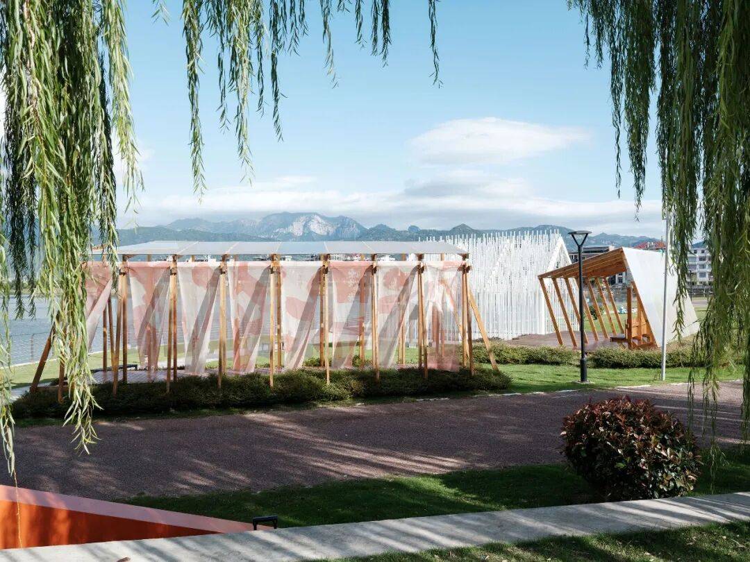以山为背景的生态岛芙蓉亭©️朱润资 清扬公园市集:自然语境下的公共激活 与未被开发的生态岛隔水相望,对岸的清扬公园则呈现出不同的公共特质。设计结合清江特色的海鲜特产为切入口,在公园沿湖草地打造一组木构廊亭,为未来的市集与活动提供一处与自然交融的户外场地。