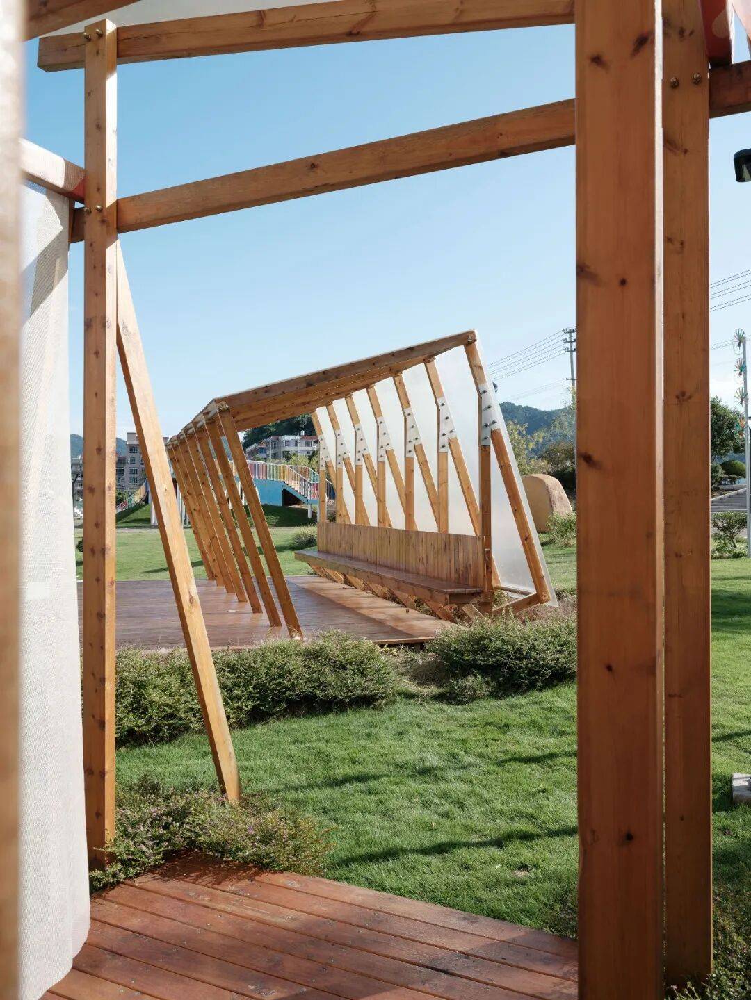 芙蓉亭木构市集望湖©️朱润资 这组构筑物由三个部分围合出一片面向草坪的开放广场。一座由木构与波浪形金属板构成的小型艺术装置,以简洁和趣味感的形态呼应天光同时与人互动。一条木构长廊覆以轻盈织物,其连续的框架将湖景收入其中,成为穿梭间的视觉线索,又为未来市集摊位的摆放提供场所。另一座休憩亭则将旋转角度的立方木构与台地结合,覆以透光的聚碳酸酯板,形成一处可驻足观湖的静谧空间。