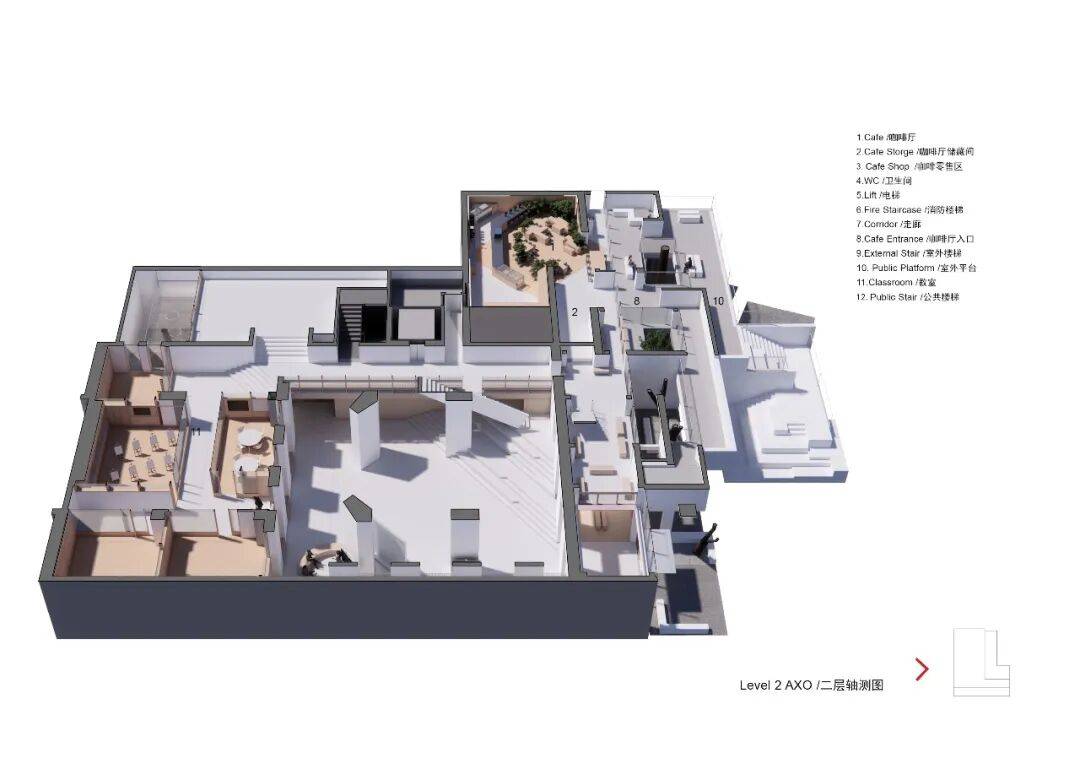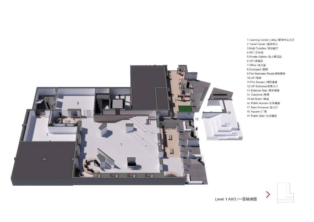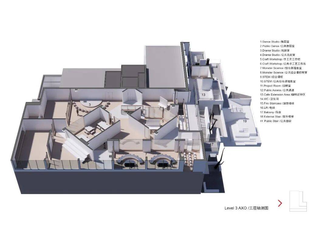 三层轴测分析图 ©waa 使用者 设计回应用户对聚集场所与临时领域感的渴望。通过精细的尺度把控,以集群外墙划分出抬升平台、庭院、公共座椅、绿植嵌入区及面向广场的阶梯讲堂,形成可灵活使用的教育场所。这些空间既可供教育项目方、访客独立使用,也可向更广泛的公众开放,激发自主参与的学习活力。