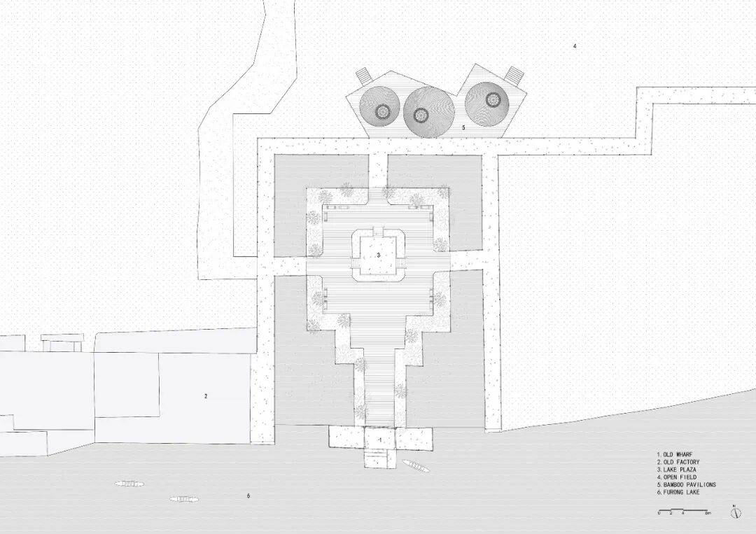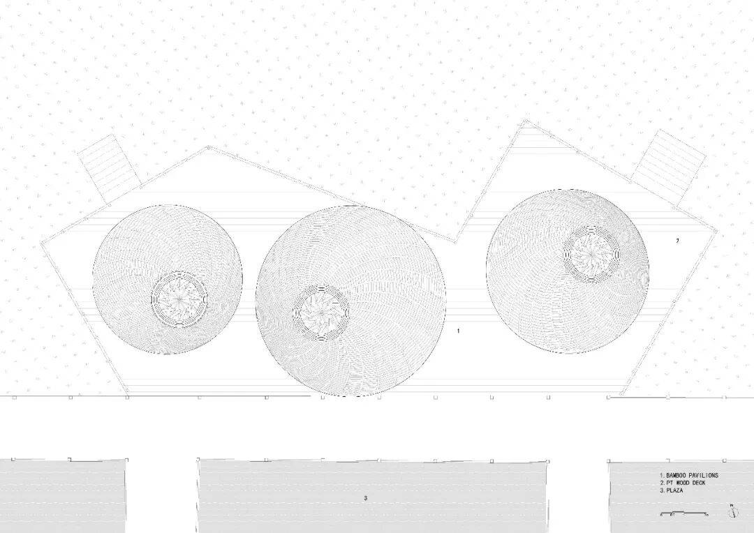 竹构芙蓉亭鸟瞰©️朱润资 FLIP与三青色策划运营团队以“轻介入”为原则,旨在保留岛屿原有的荒野气质。仅对破损的老石板栈道进行必要修补,清理池水,并在广场低洼处架空防腐木平台,悄然恢复场地连通。在广场一侧,新增的架空木平台上,并在此之上以竹作为结构和建造材料,构筑了三个高低错落,直径各异的斗笠状的亭子,竹亭不仅可以遮阳挡风,同时亭下表面由编织手工竹席覆盖的岛台可以给在此处举办露营或户外集会活动提供必要的设备存储空间和多样化的使用场景。