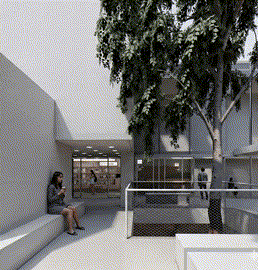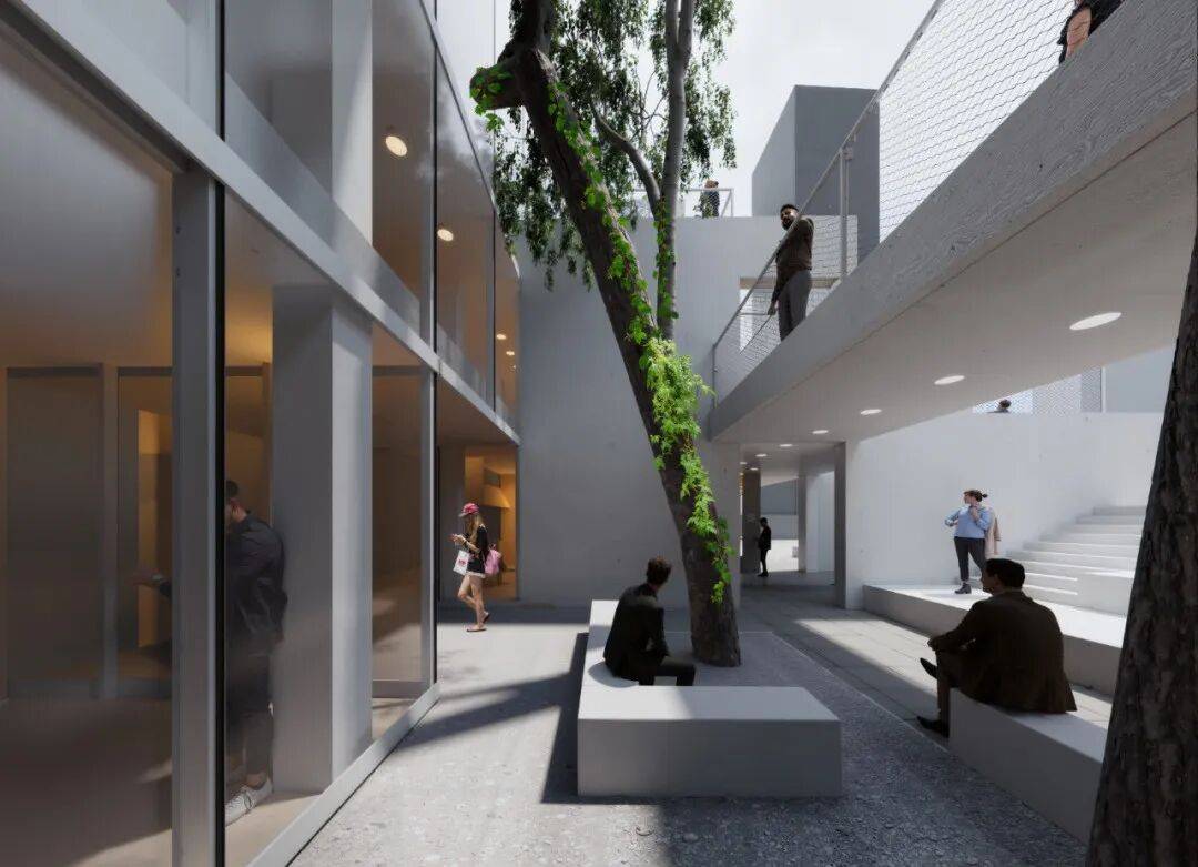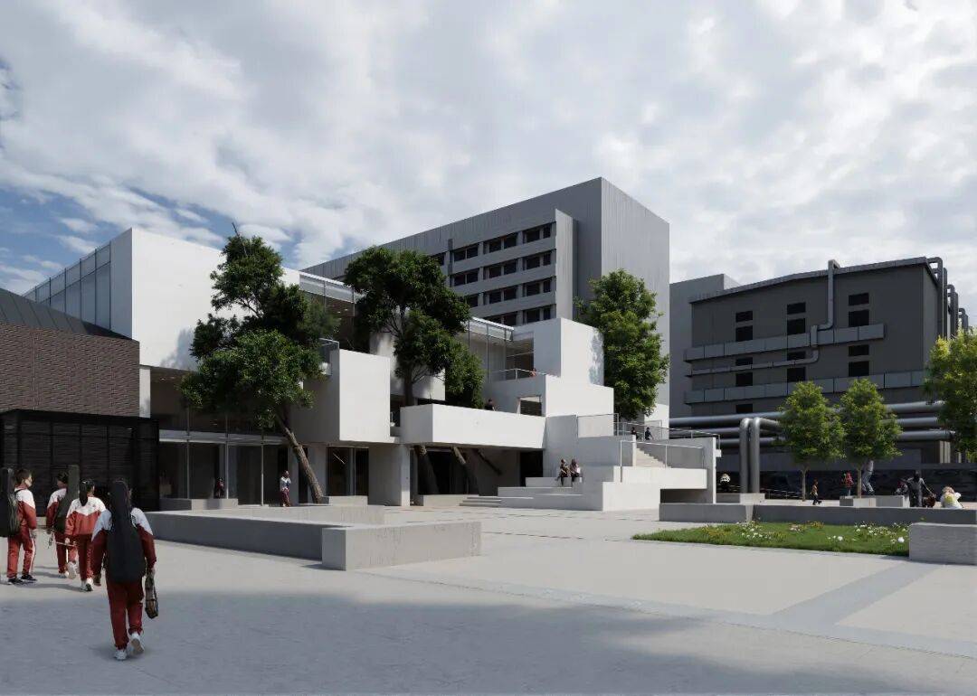 功能东线改造策略分析图 ©waa 想法 建筑形态被视为一系列“柔性边界”的叠合,其地形般的设计源于不同教育项目方的功能需求。立面构成可解读为这些多元力量相互作用的空间图示。设计以人体尺度精心构建:集群式外墙将空间划分为多层次的室内外平台、庭院、公共座椅区、嵌入式绿化、消防通道、外挑阳台、天窗及面向广场的公共讲堂。由此形成的“空隙”衔接内外功能,并让位于三棵受保护树木。这些树木既需被妥善容纳,亦赋予留白空间情感共鸣,锚定这座“垂直教育聚落”的尺度感。