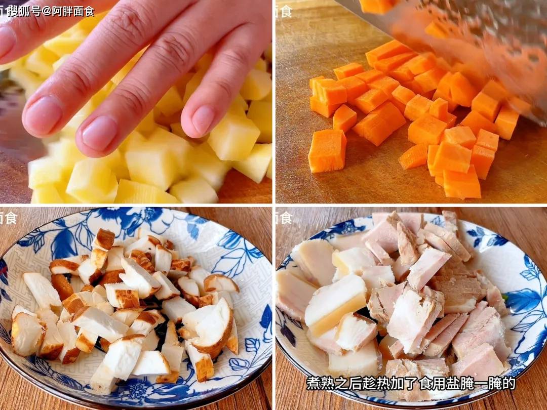 4、再按自己喜好切一点配菜:土豆丁,胡萝卜丁,和香菇丁。想更香,再切一点五花肉。