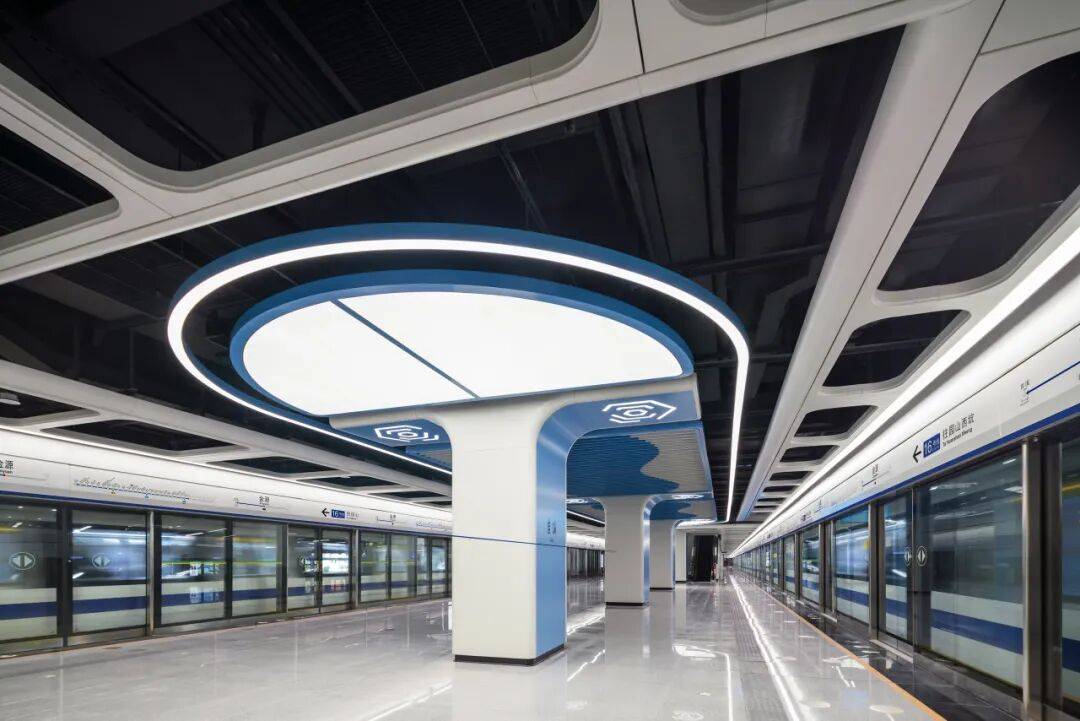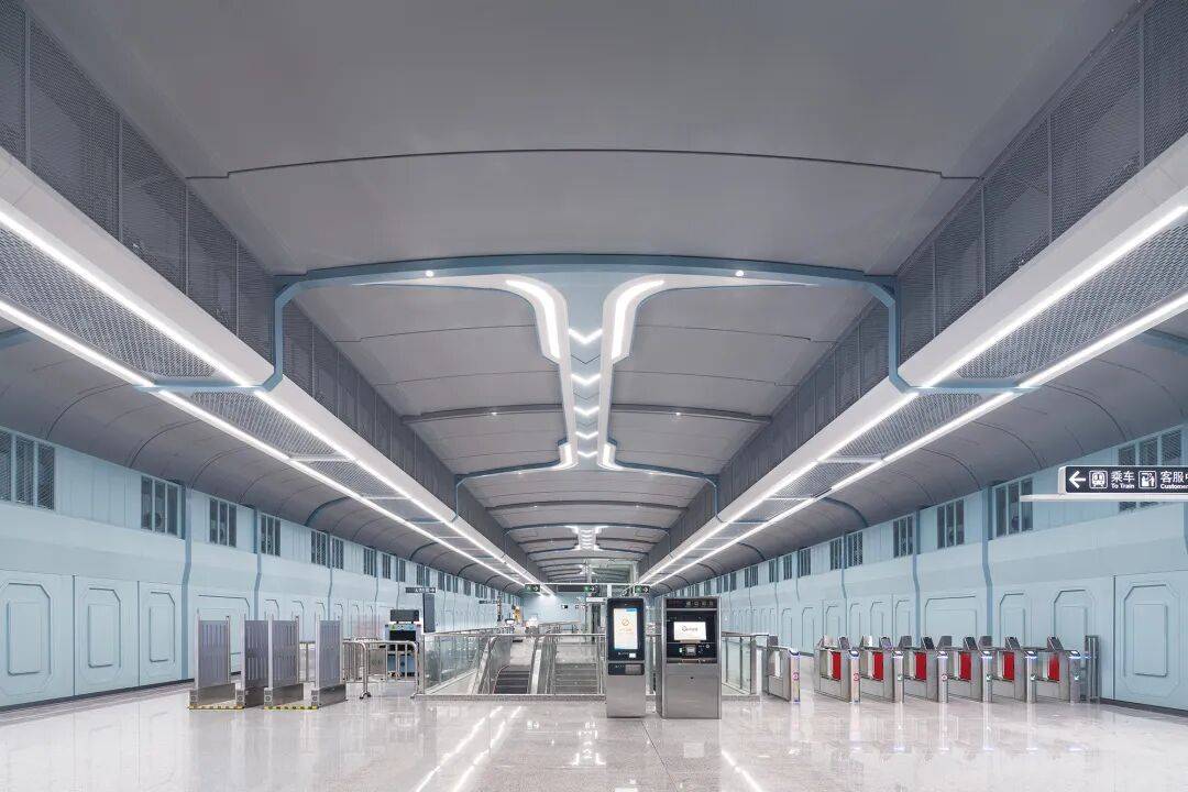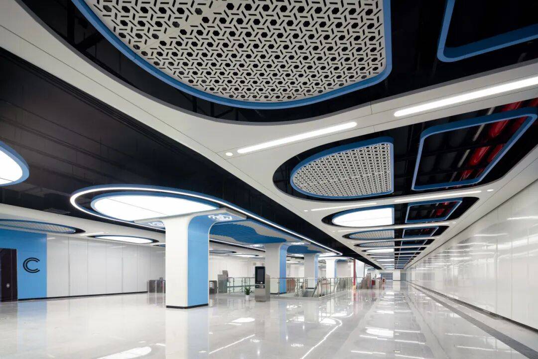 ▲重点站-虹桥公园站 同时,以“科创未来”为主题,通过简约的科技线条、渐变金属板与混凝土肌理的视觉碰撞,结合风管模块化包覆与灯光设计,共同构建出一个极具未来主义风格的“时空隧道”。