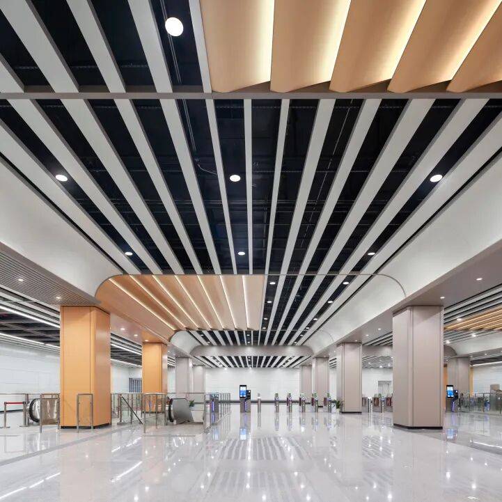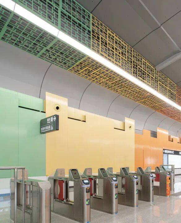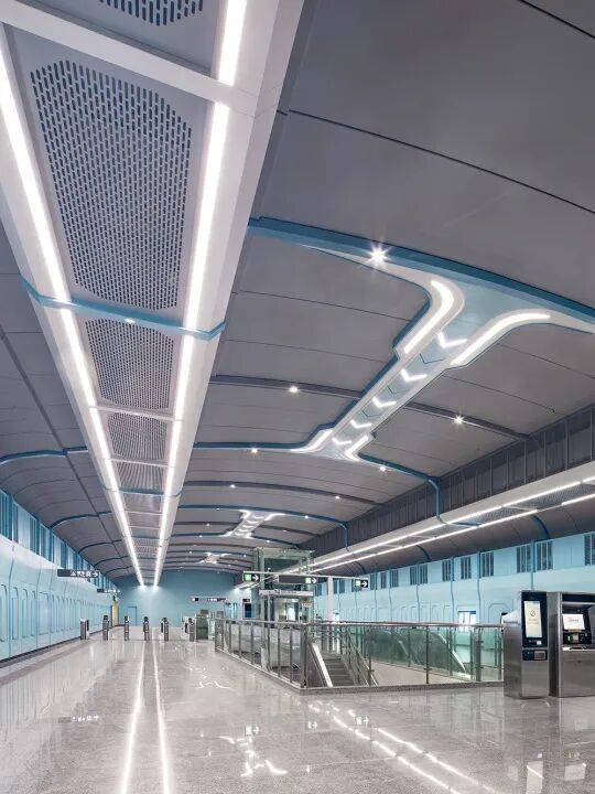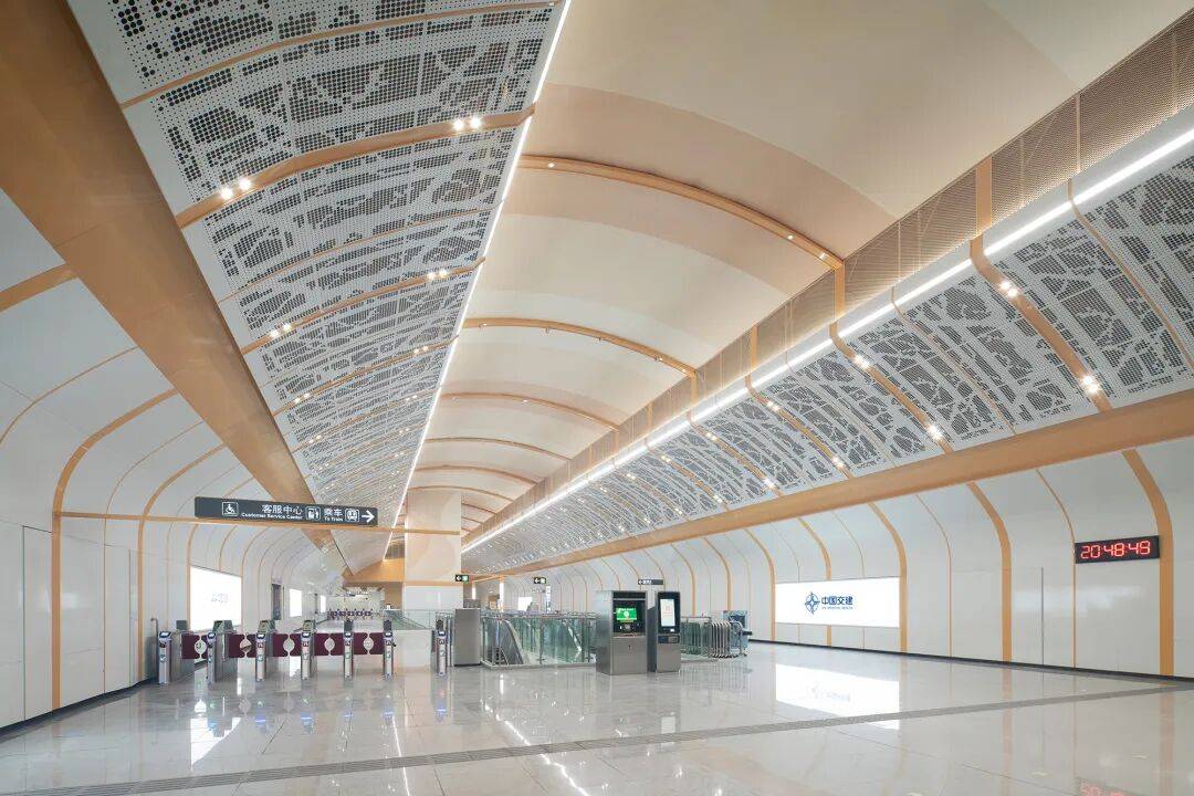▲重点站-碧眼站 碧眼站最大化尊重了其独特的拱形建筑结构,以“光影秘境”为概念,通过仿生艺术穿孔板模拟自然光影效果,搭配暖色调色彩变化,构建自然舒展的地下空间。 ▲重点站-碧眼站 虹桥公园站则从建筑阶段提前介入,通过一体化整合将管线系统隐于两侧,释放出开阔的中部空间。