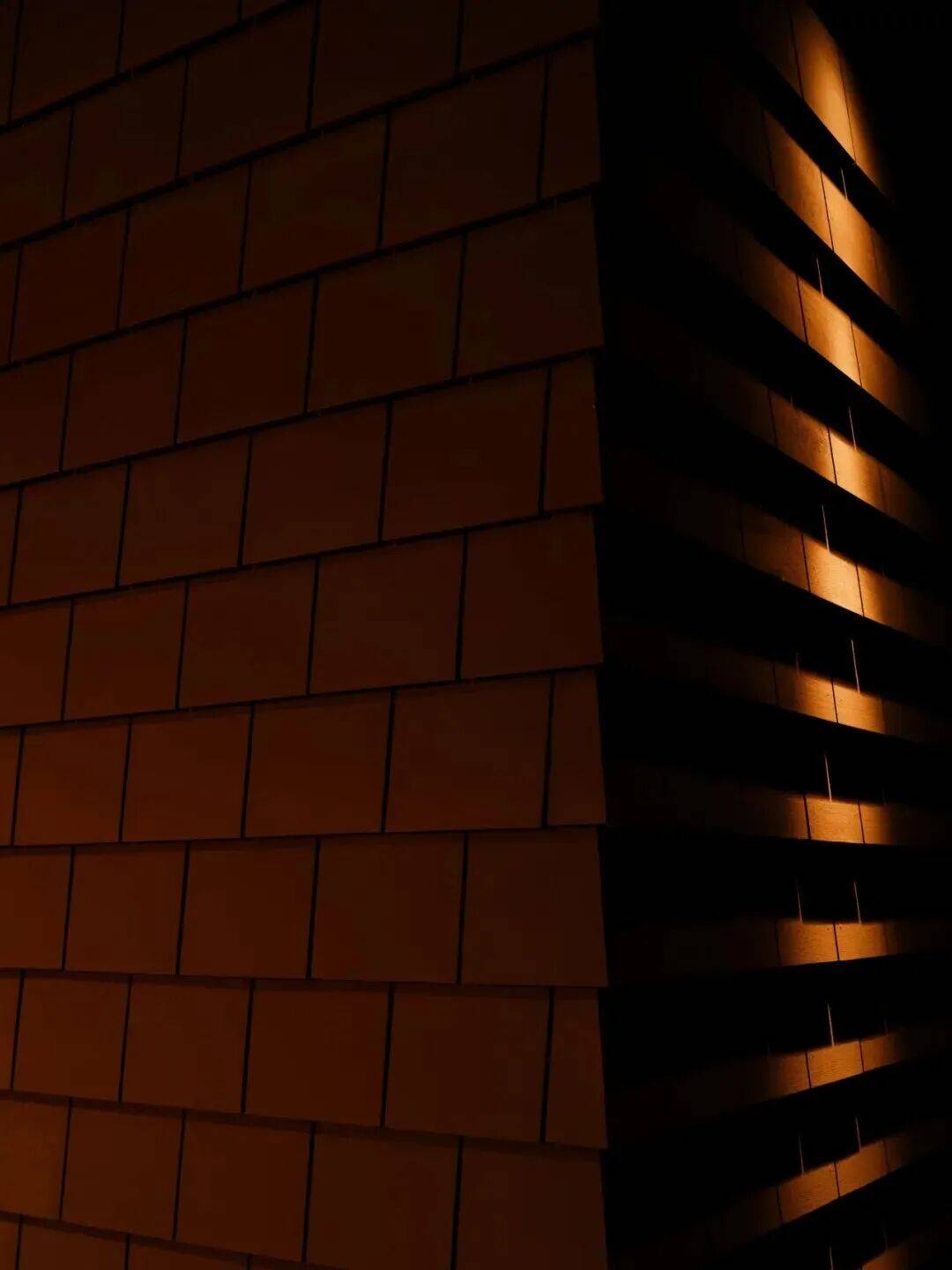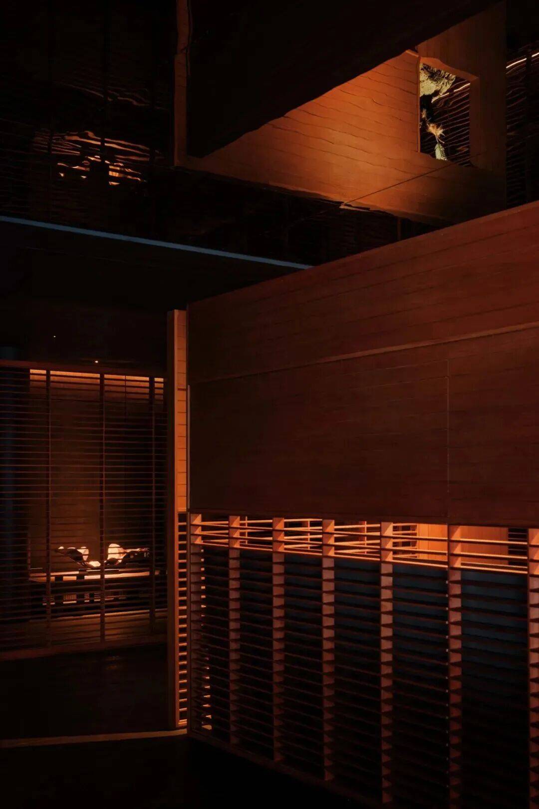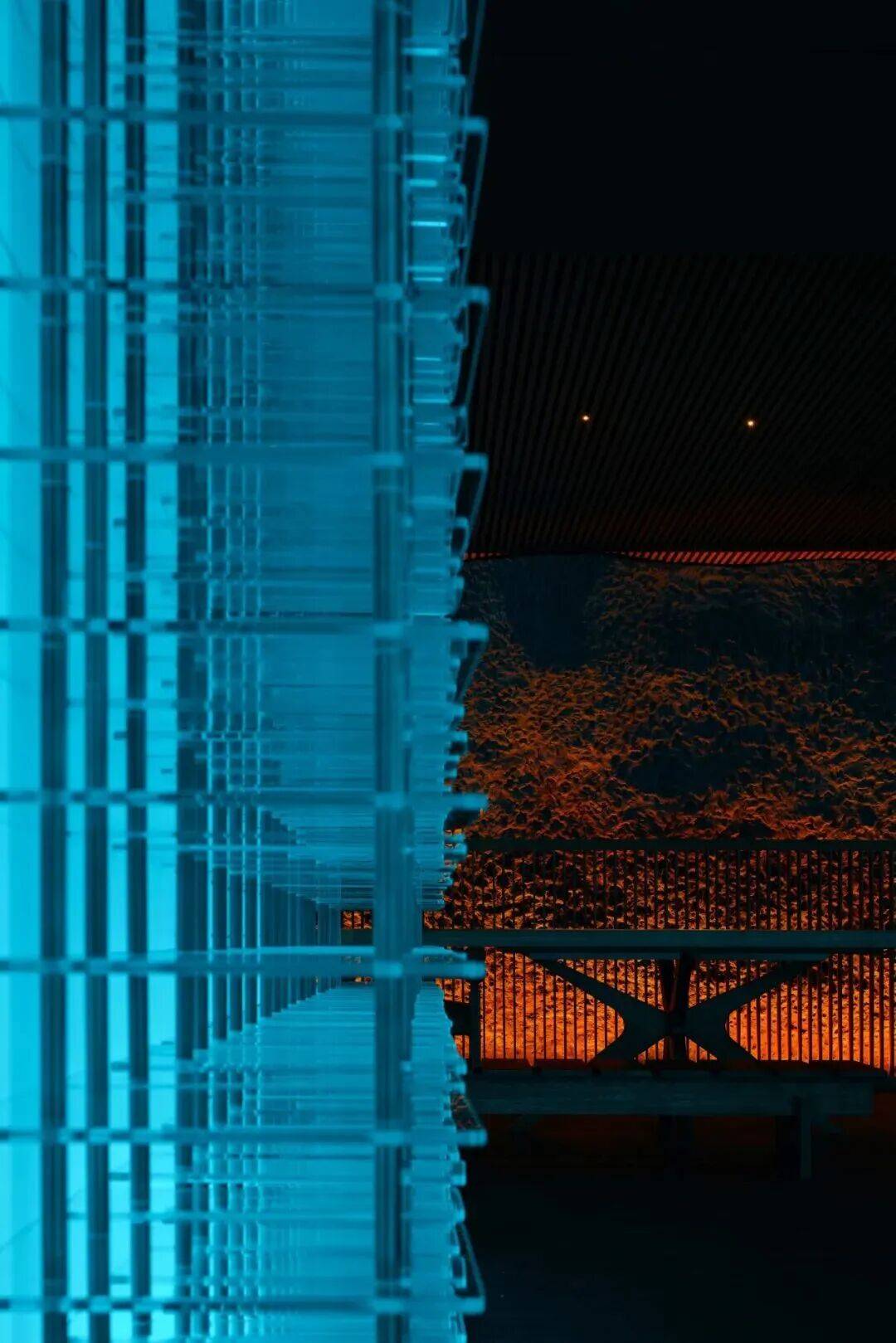 ▲室内的光影 ©龙合辉 夜晚则呈现另一种景象。内部灯光透过格栅与玻璃向外扩散,建筑像一只被点亮的器物,在城市中散发柔和的光。文化活动在此成为城市夜景的一部分。