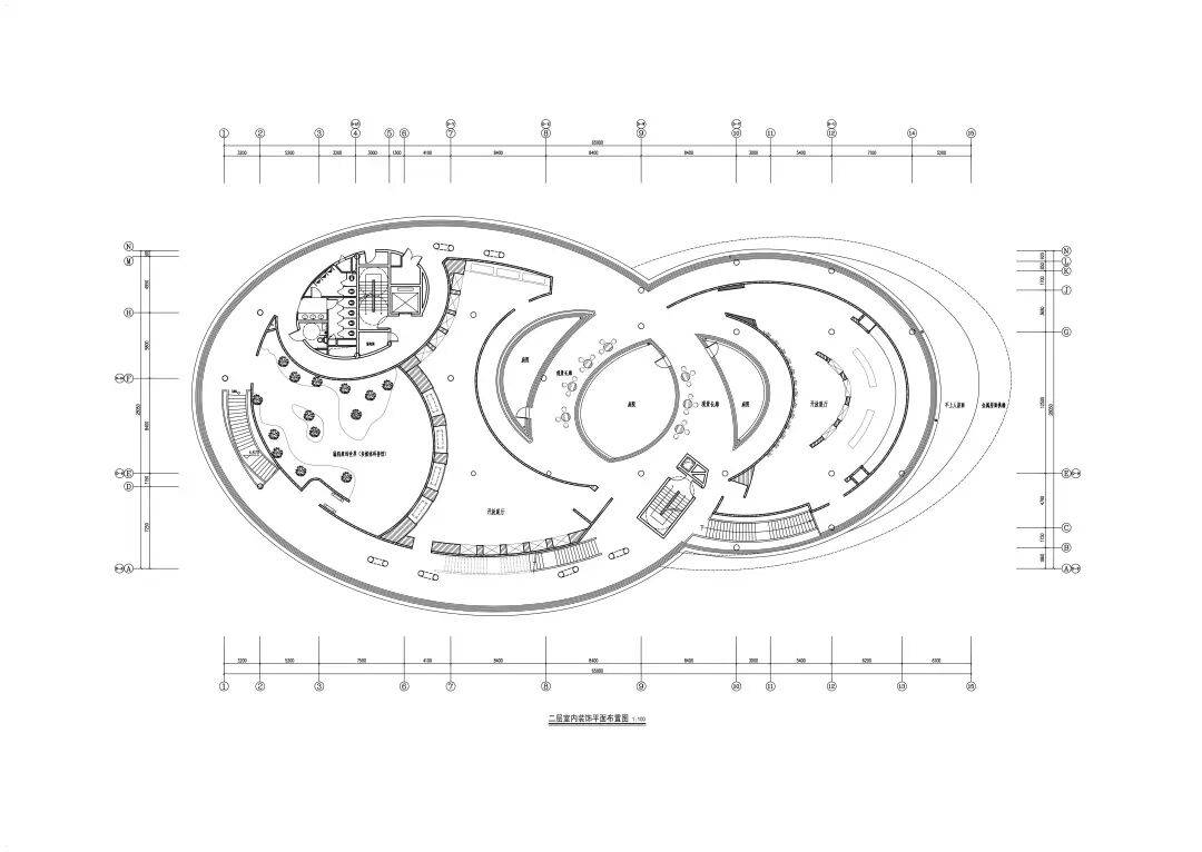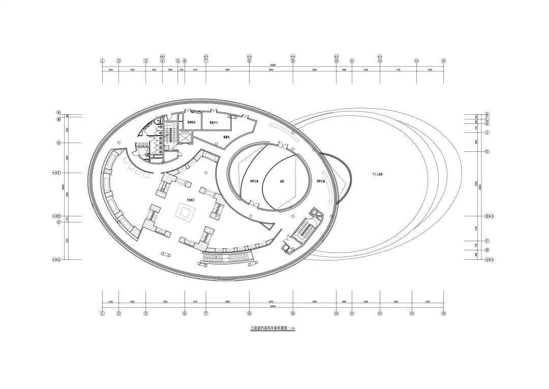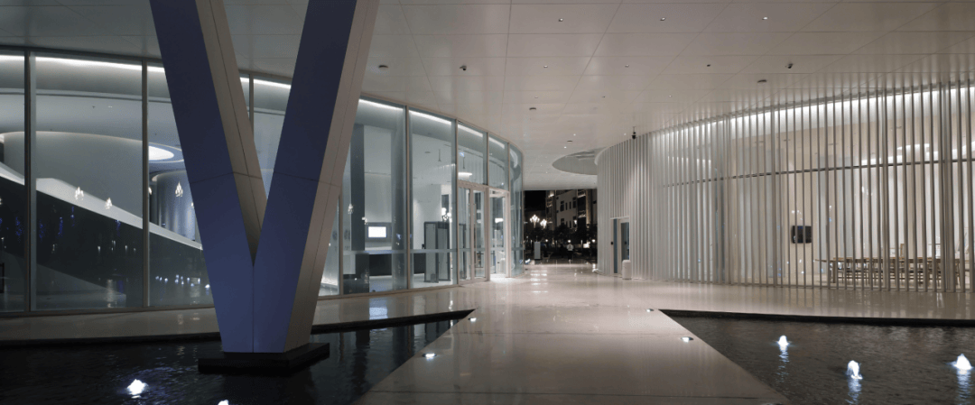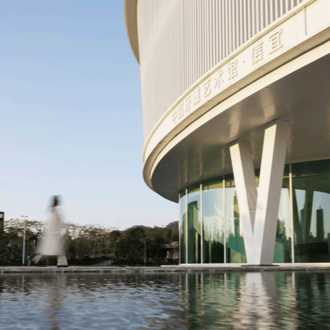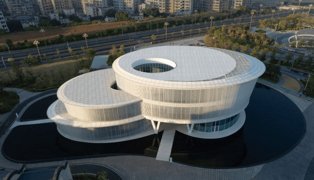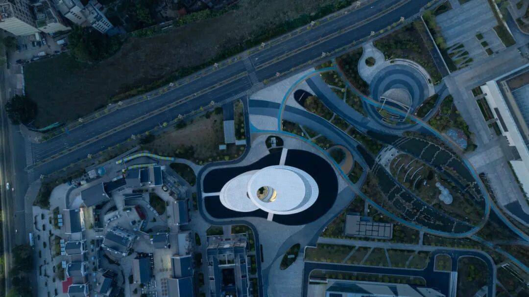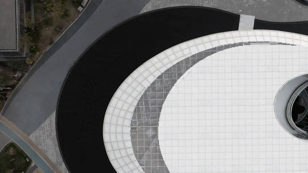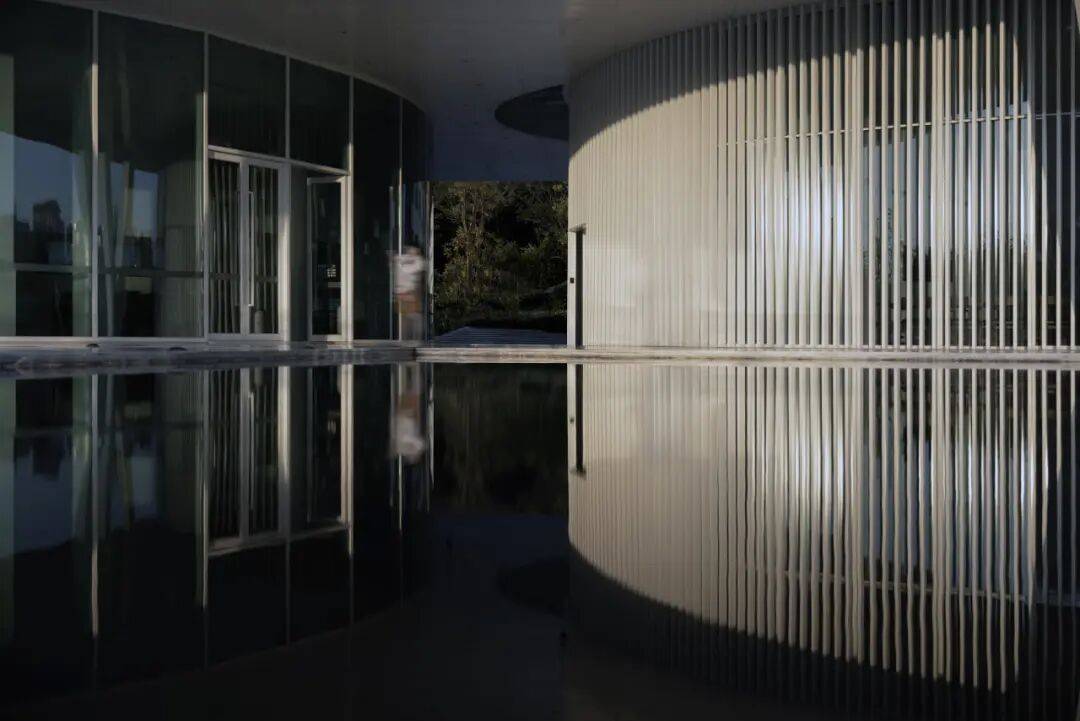 ▲东侧入口处镜面水池 ©龙合辉 从城市广场远望,艺术馆呈现出一种椭圆与圆弧交织的形态。它不像传统博物馆那样以直线构成秩序,而更像一件经过不断打磨的器物:线条柔和、体量完整,仿佛一块被慢慢雕琢出的玉石。这种曲线并非单纯的形式表达。建筑内部的观展流线同样遵循旋转与环绕的逻辑。观众的路径像一条逐渐展开的雕刻刀痕,从入口缓缓进入建筑中心,再在展厅之间盘旋延展。空间因此成为一种连续的叙事,而非孤立的房间。 虚地为场,城市为客