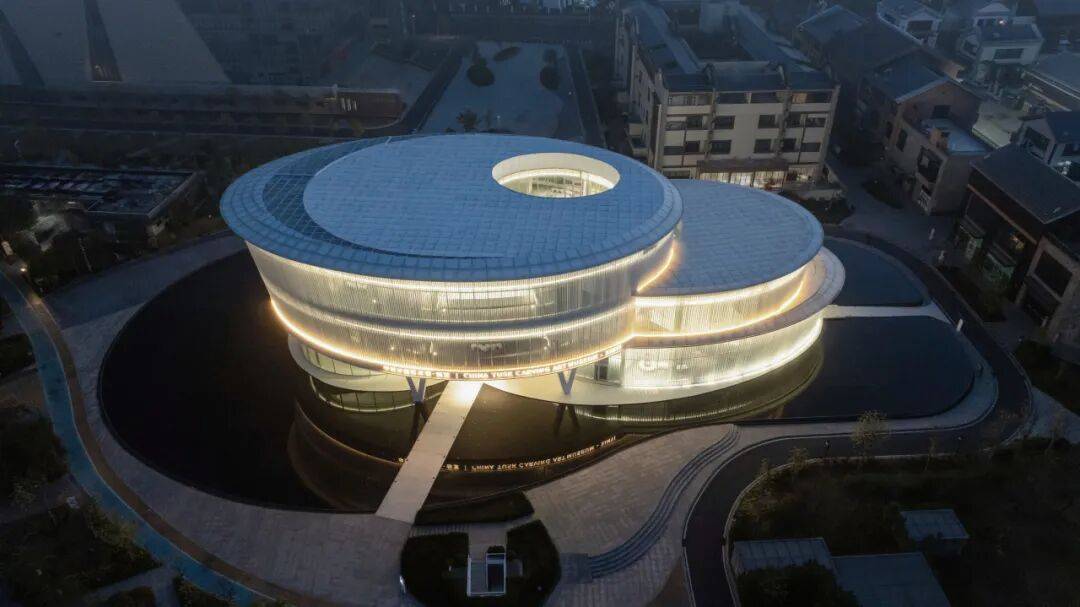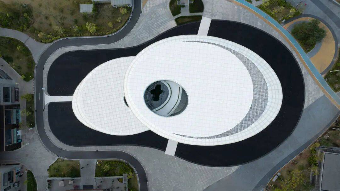 ▲与周边的肌理关系 ©龙合辉 中国牙雕艺术馆正是这一系统中的精神中心。它以南玉的温润绿与象牙的纯净白为主色调,三个错落的圆形体块如一枚精致的纽扣,将现代会展中心、新图书馆与古意窦州里串联,成为传统与现代交织的城市纽带,也让信宜的文化底蕴在建筑空间中缓缓铺展。 02. “艺形同构”:被雕刻的建筑 形随艺生,馆由雕成