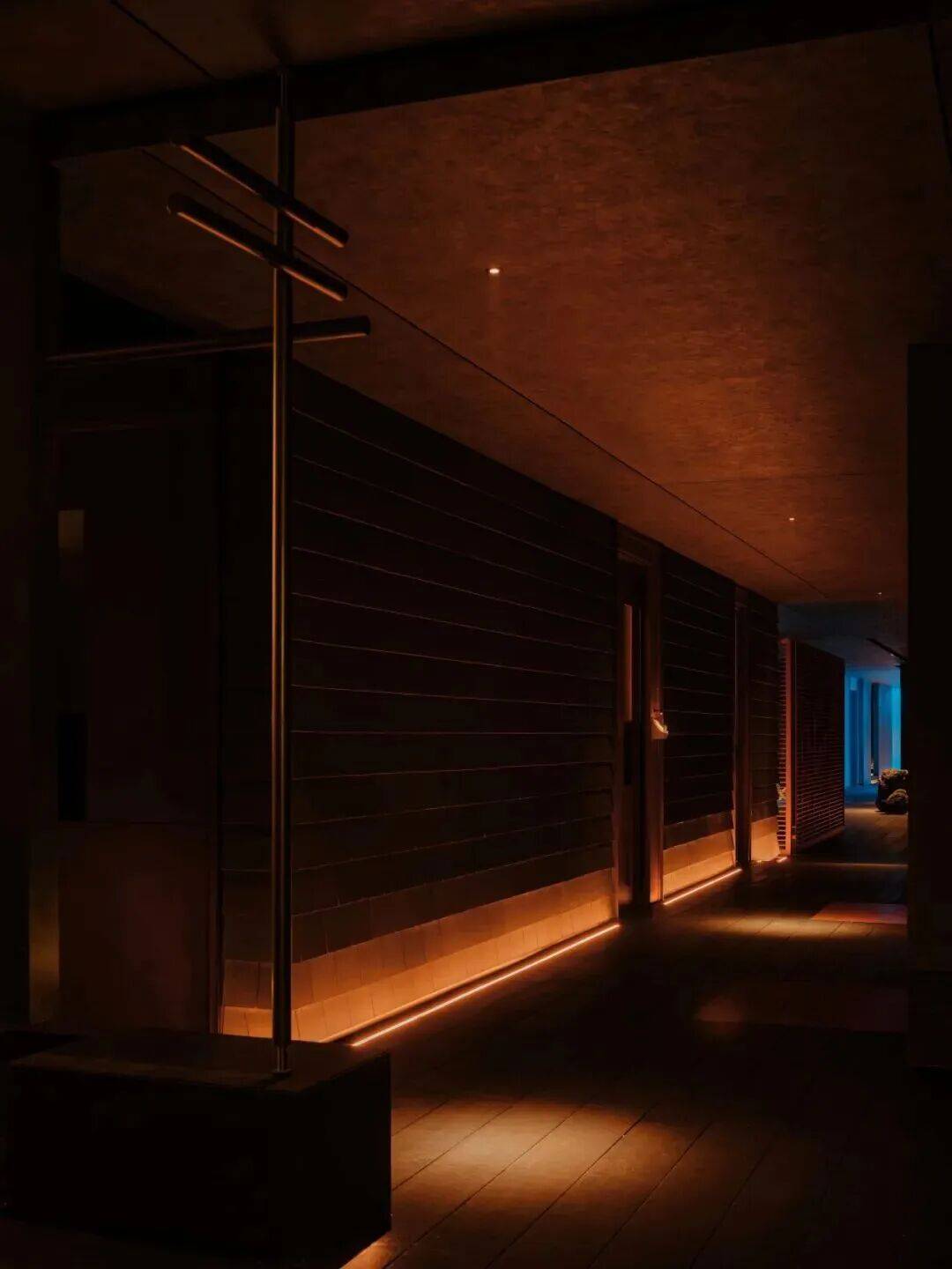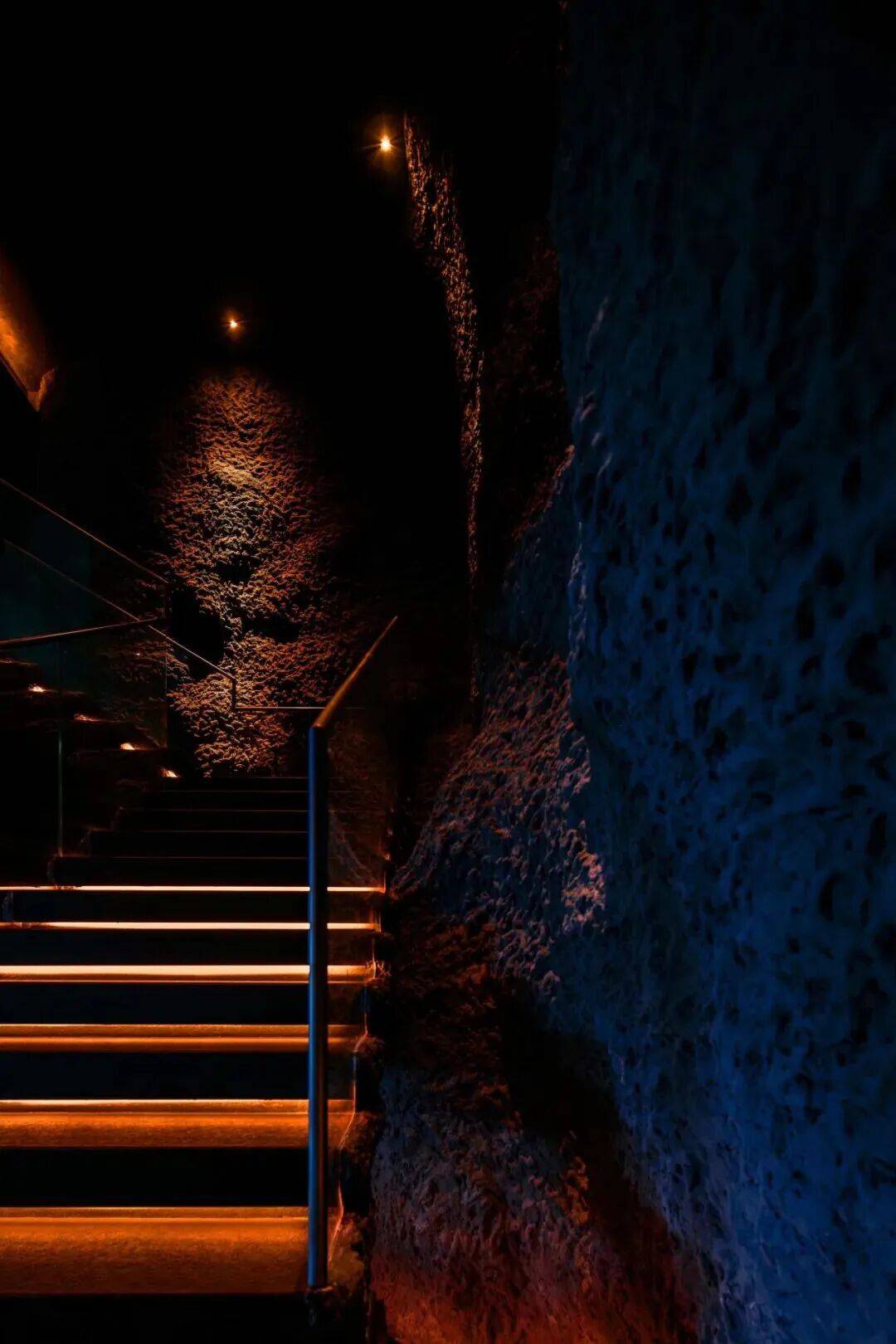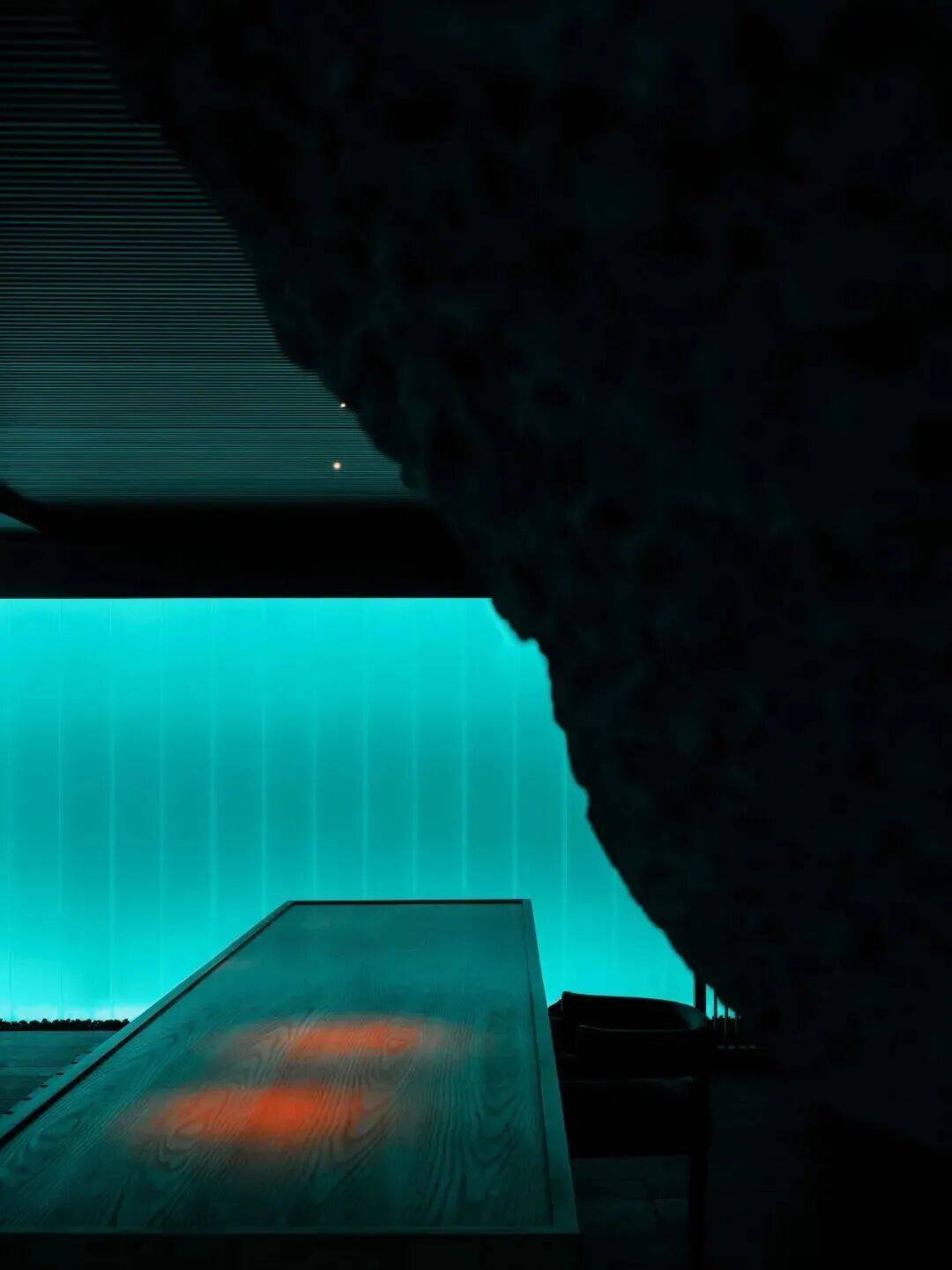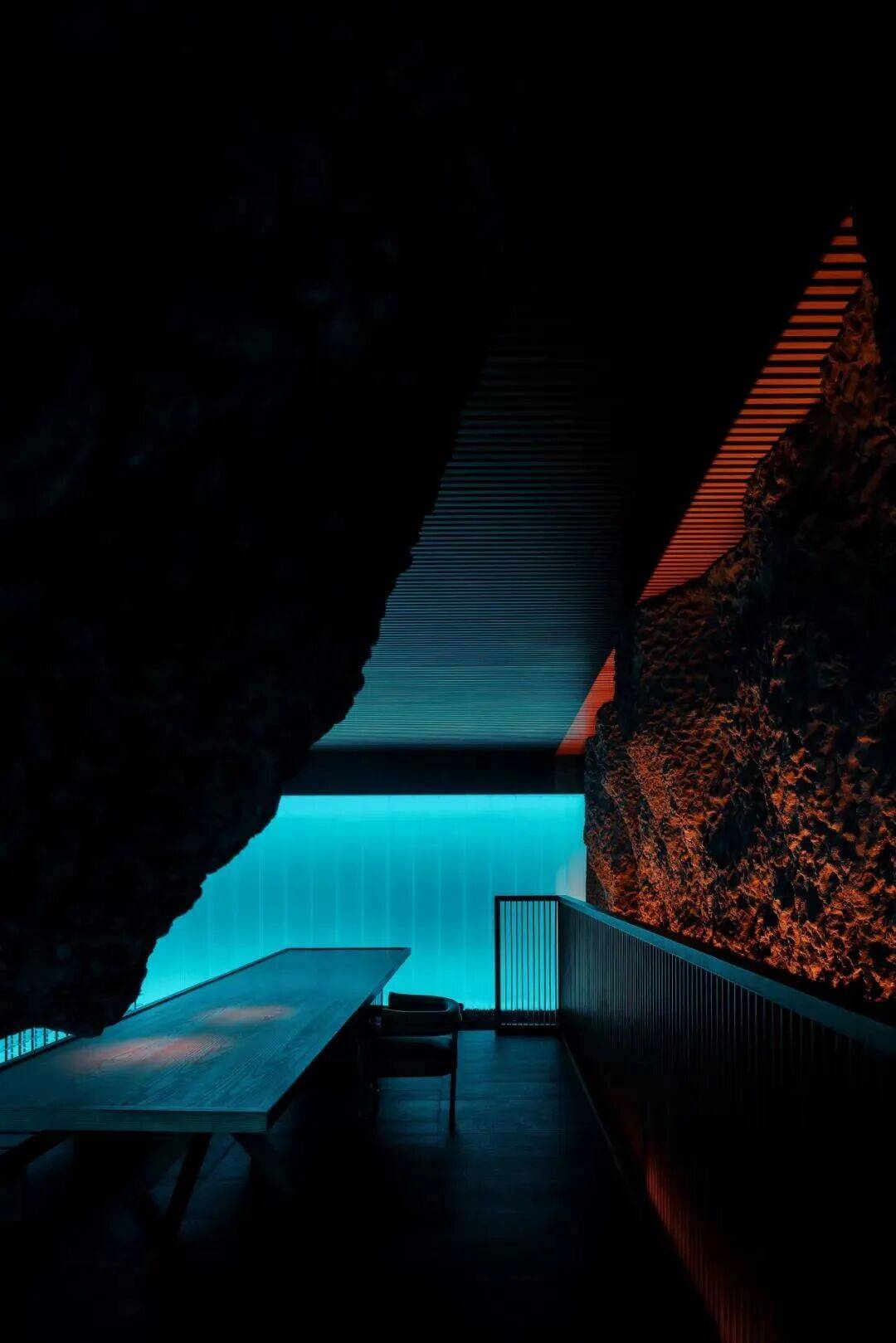 01. 灰蓝之境 静栖生活本真 “空间从非孤立命题,而是生活方式的自然延伸,更是对自然极致张力的沉浸式转译。” 粉蓝水色流淌于空间深邃处,携着地热湖水的清冽与火山岩石的沉浸,无波澜,无张扬,凭一抹无垠蔚蓝,引身心自然沉潜。 橘红暖光凝于角落如星子,更似岩浆在地底奔涌的微光,不破静谧,以微光轻化冷调,惬意藏于光影流转,疗愈隐与时光静和。