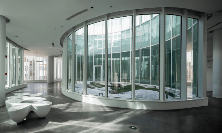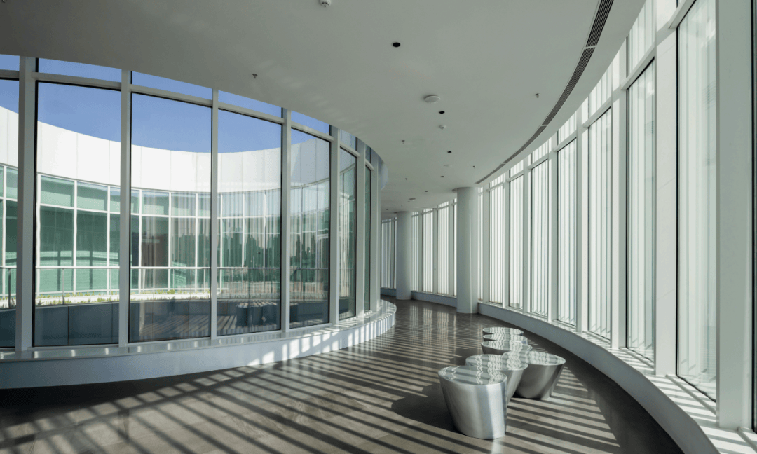 ▲建筑局部细节 ©龙合辉 为了应对复杂的空间与结构关系,设计团队采用BIM数字化技术进行协同设计,对建筑形态、结构体系与设备管线进行整体整合。机电设备被集中布置于核心筒及屋面,并通过隐藏式设计与建筑表皮融合,从而避免传统设备百叶对建筑形象的破坏。这种“建构一体化”的策略,使建筑、结构、机电与室内展陈形成统一系统。空间体验因此保持完整而纯粹。