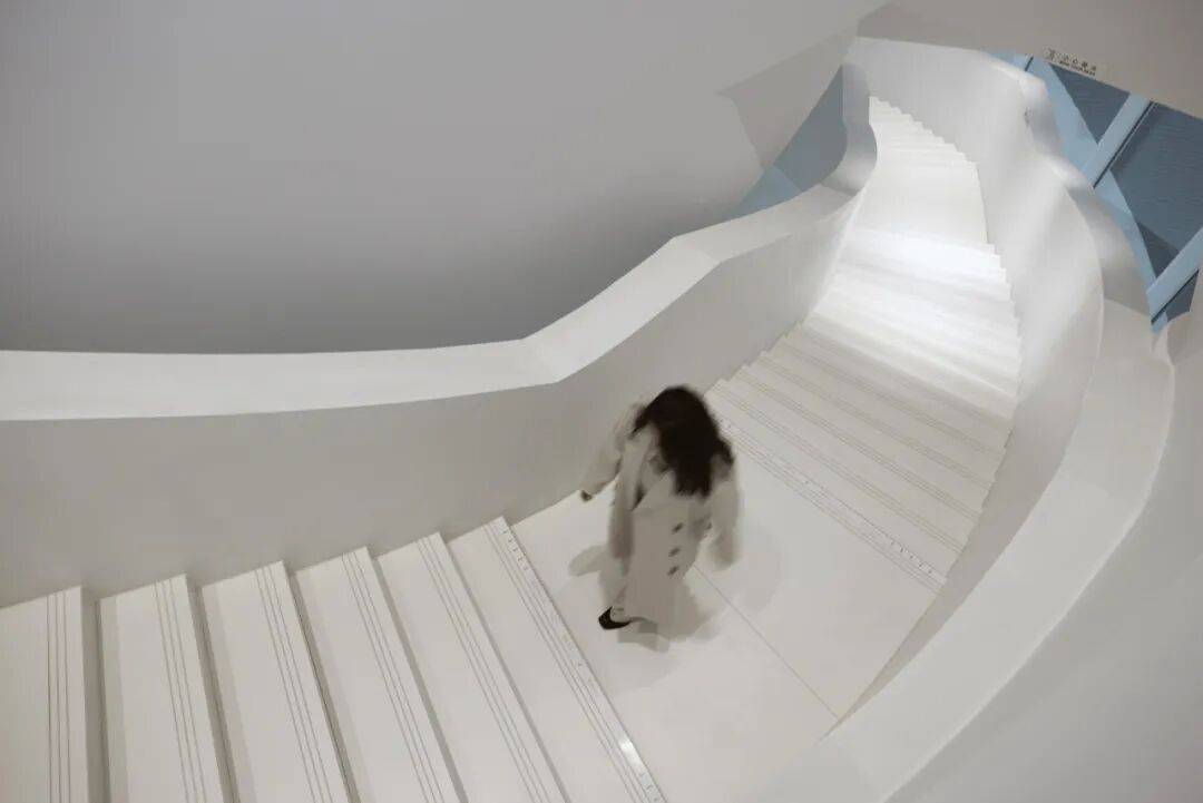 ▲随之弧动的楼梯 ©龙合辉 观众从入口进入后,首先进入一个较为开敞的公共大厅。这里是空间叙事的序幕:光线被引入中央空间,展览信息在此汇聚。随后,动线开始沿着建筑内部缓慢上升。螺旋式的流线将各个展厅串联起来,使参观成为一次逐渐深入的旅程。
