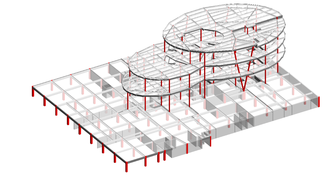 ▲竖向构建转换示意图 ©中建五局 在优雅的空间形式背后,建筑实际上面临着复杂的工程挑战。 艺术馆的建筑形态为非标准椭圆结构,立面曲线变化较多,且建筑需要建立在既有地下结构之上,约70%的竖向构件无法直接传递到基础,需要通过结构转换来完成。