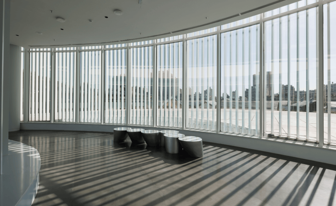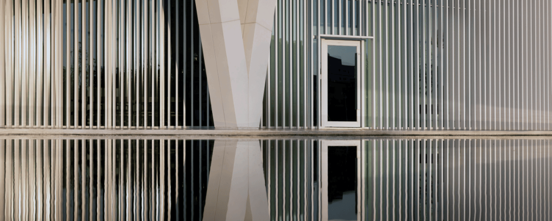 ▲建筑立面肌理 ©龙合辉 艺术馆的立面设计采用双层表皮系统:内层为玻璃幕墙,外层则是竖向格栅。 这种构造形成一种微妙的视觉关系。白天,格栅在立面上产生节奏感,使建筑呈现出轻盈而细密的纹理;而透过格栅,人们可以隐约看到内部的空间活动。 这种透明并不是完全的展示,而是一种“知觉的透明”。