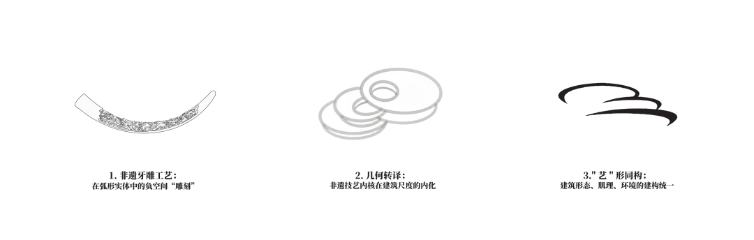▲概念生成分析 ©中建五局 如果说牙雕是一种在材料内部进行的雕刻,那么这座建筑则是一种对空间的雕刻。 设计提出“艺形同构”的理念——让建筑形态、结构逻辑与牙雕艺术的精神形成一种对应关系。牙雕的一个重要特征,是流动而精细的曲线。雕刻刀在材料表面游走,留下连续而柔和的弧度。建筑的形体语言正来源于这种曲线逻辑。