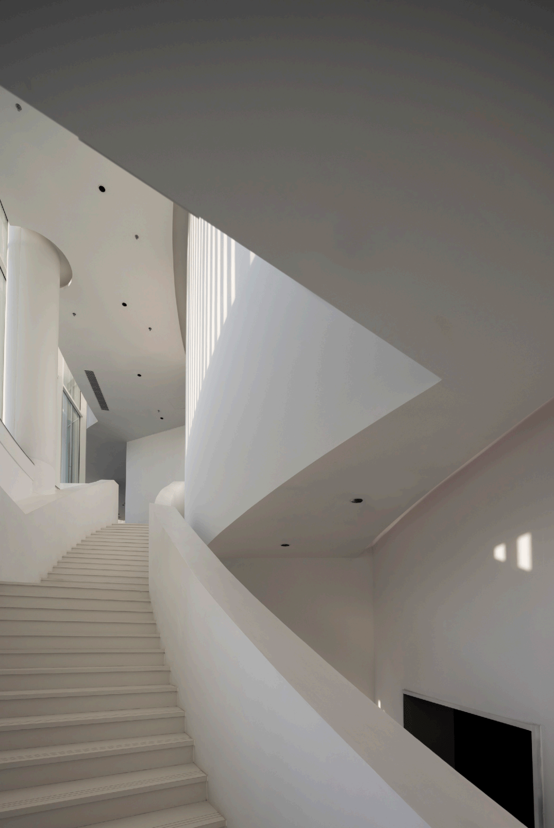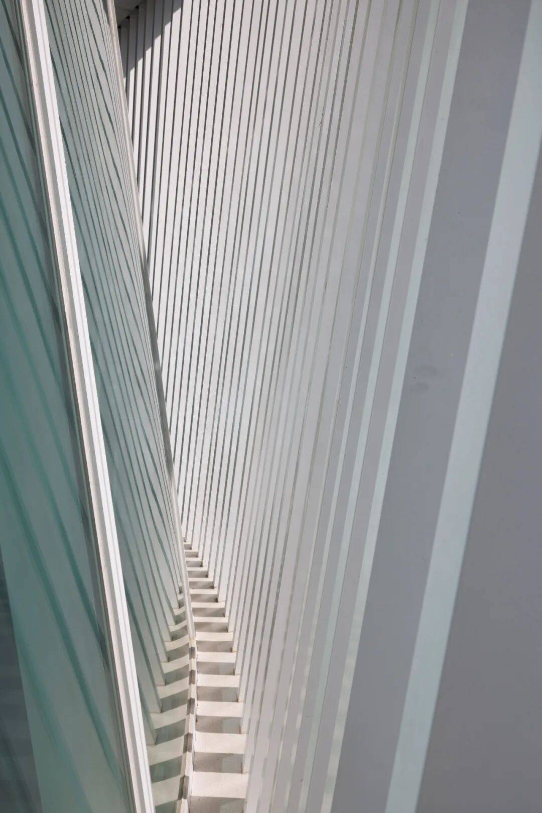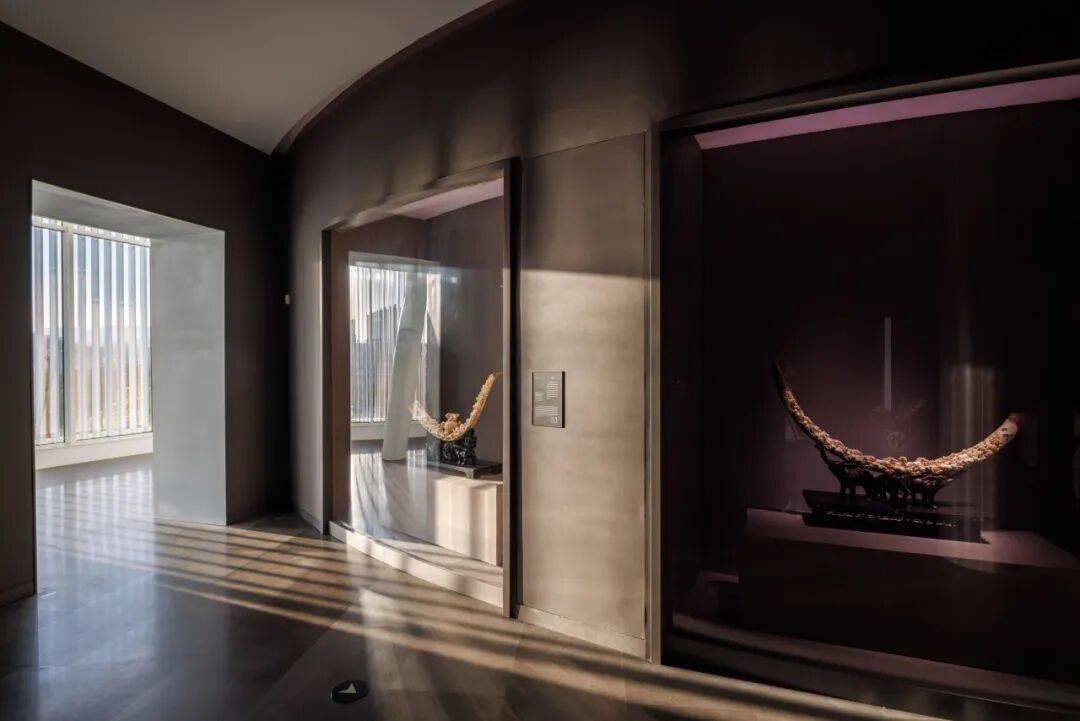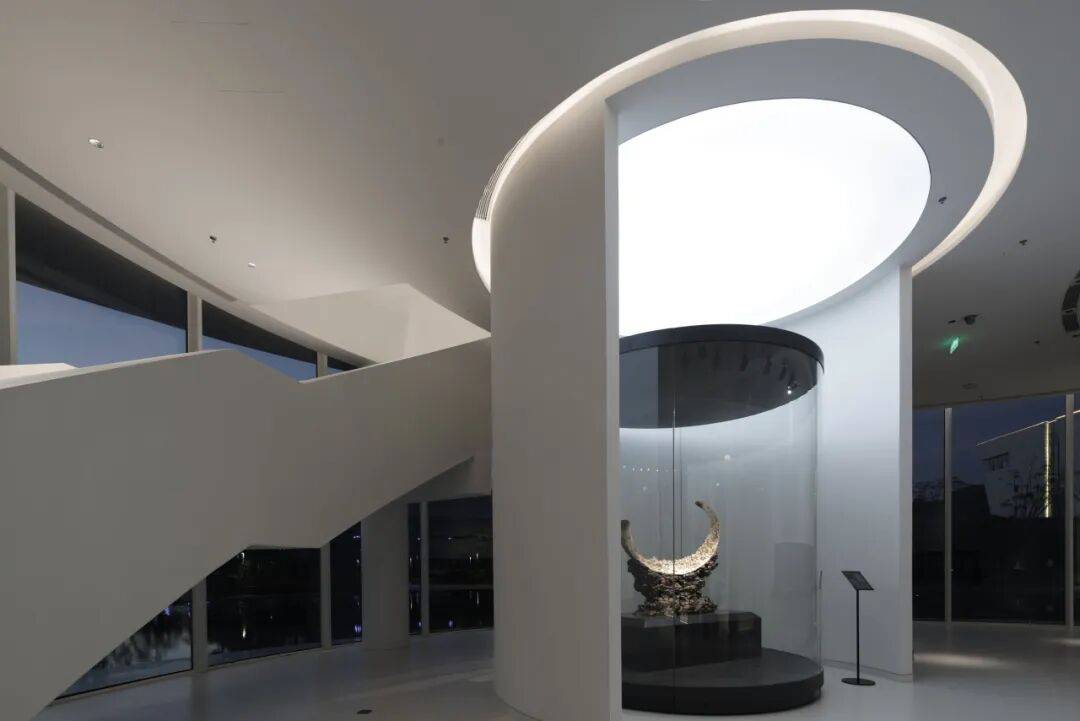 ▲光影打进楼梯 ©龙合辉 这种空间策略与牙雕的观看方式相呼应。牙雕作品往往需要从不同角度反复观赏,细节在转动与移动中不断显现。建筑通过旋转与环绕的路径,让观众在移动中不断获得新的视角。 在每一个转折处,空间都会出现新的景框:或是通高的展厅,或是面向城市的窗景。艺术品、建筑与城市因此形成连续的视觉关系。 曲构为形,数构为骨