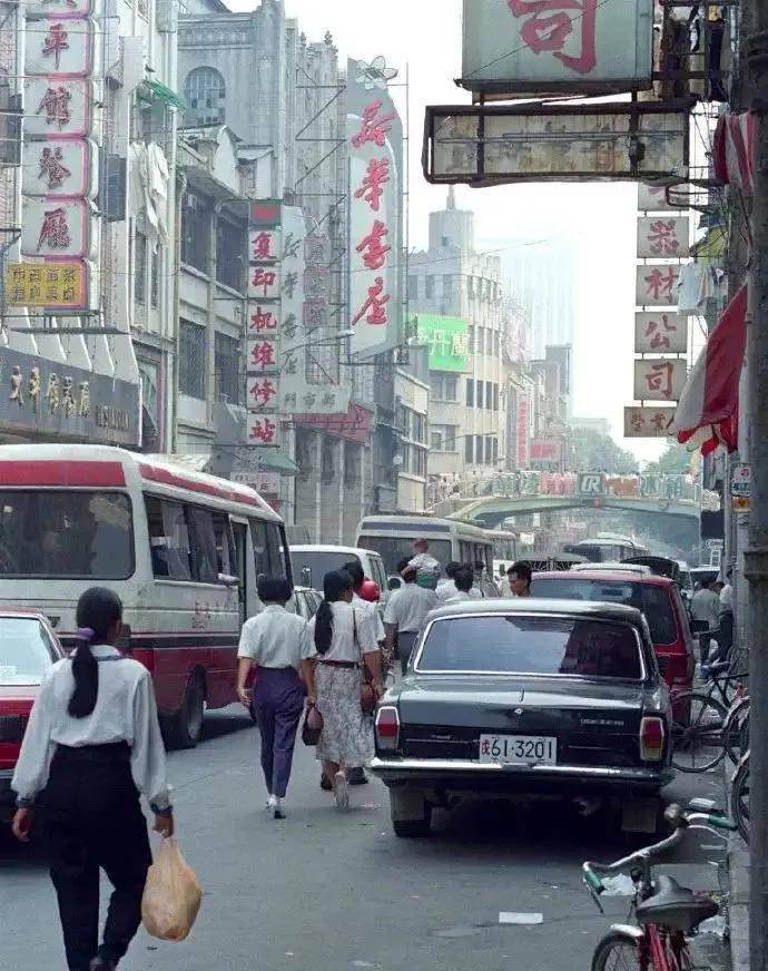 在越秀区中山路商圈,商贸气息更加浓厚,街头巷尾车水马龙。与现在不同,那时的道路管理并不像如今这样规范,道路两旁人流如织,街边随意停放的车辆时常阻塞行人,逛街的人只能“被迫”走上马路中央,极具生活的烟火气息。那时候的广州,无论是老百姓还是外地来的人,街头的热闹与嘈杂声,早已成为这座城市的象征。