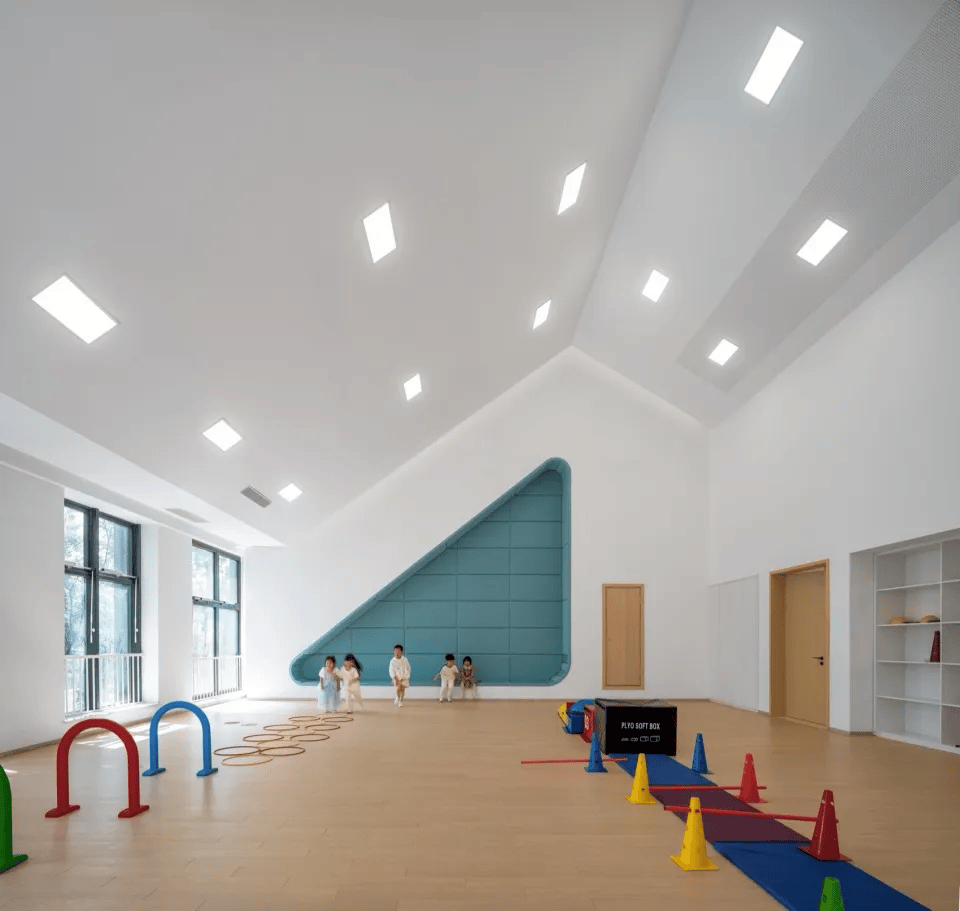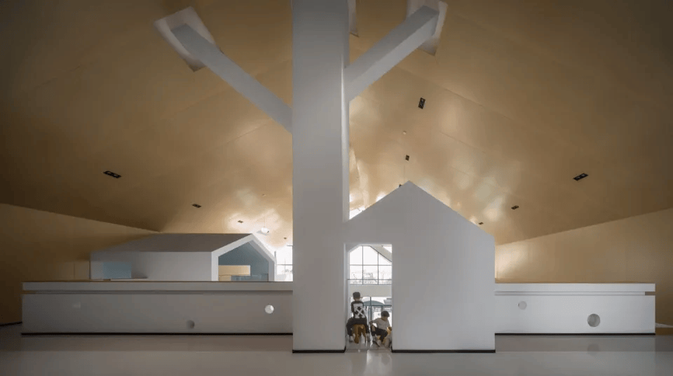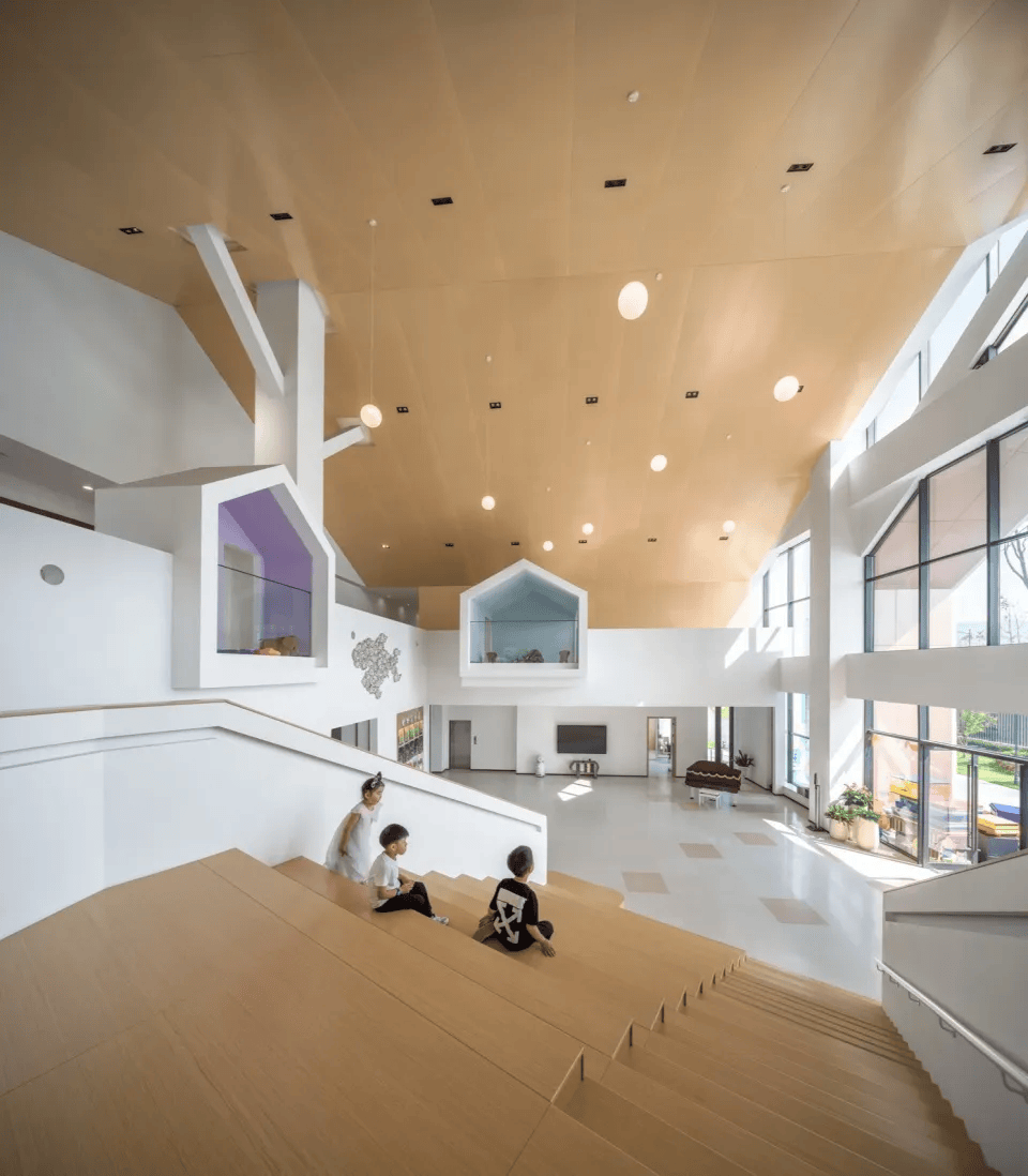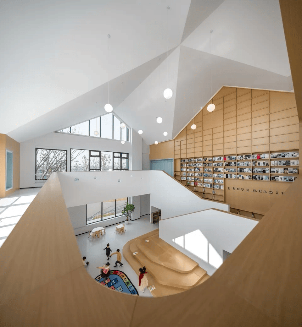 该幼儿园以“树屋森林”为主题,将空间转化为一场连续的探索体验。入口以通高木质穹顶与悬挂灯球营造树冠意象,结合探窗与“树洞”构建多层次的探索路径。绘本馆以折纸形态的屋顶组织光线与空间,配合“潜望镜”装置强化互动体验。活动室通过“屋中屋”划分动静区域,在同一空间中实现休憩与活动的并置。整体以温润木色与简洁白墙构建安全、开放的环境,使学习、阅读与游戏在富有想象力的空间中自然发生。